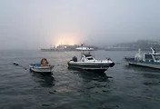 안개 낀 옥림항에서 바라보는 풍경.