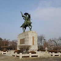 왼쪽으로는 긴 칼을 차고 갑옷을 입은 병사 한 명이 함께 서 있다.
