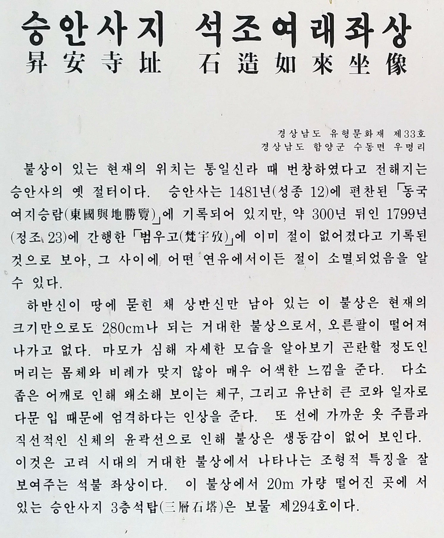 보물 제294호로 지정된 함양 승안사지 3층석탑, 경상남도 유형문화재 제33호로 지정된 승안사지 석조여래좌상(昇安寺止 石造如來坐像)이 현존해 있는 승안사지를, 특별한 보존이나 보호 조치 없이 방치하고 있다는 느낌이다.