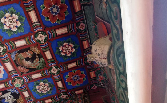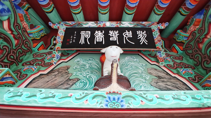 현판 아래로는 붉은 해를 뒤쪽에 두고 거북이 등 위에 토끼가 타고 있는 목조 조형물이 조각돼 있다.