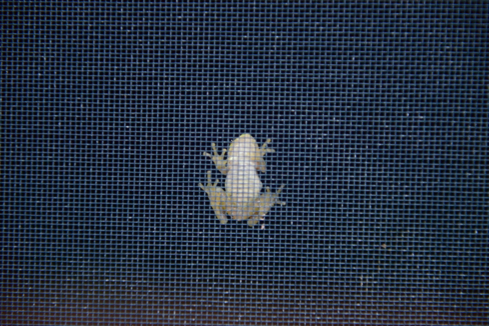 방충망에 청개구리가 한 마리 찰싹 달라붙어 잠을 자는지 떨어지지 않고 한참이나 붙어 있습니다.