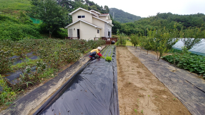 폭 1.5m에 길이 20m 규모로, 괭이로 땅을 파고 복합비료를 뿌린 후, 땅고르기 작업과 비닐 씌우기 작업을 거쳤습니다.