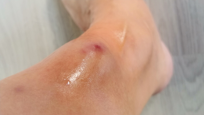 상처 부위를 확인하니 파란 멍이 들었고, 크게 부어올랐다.
