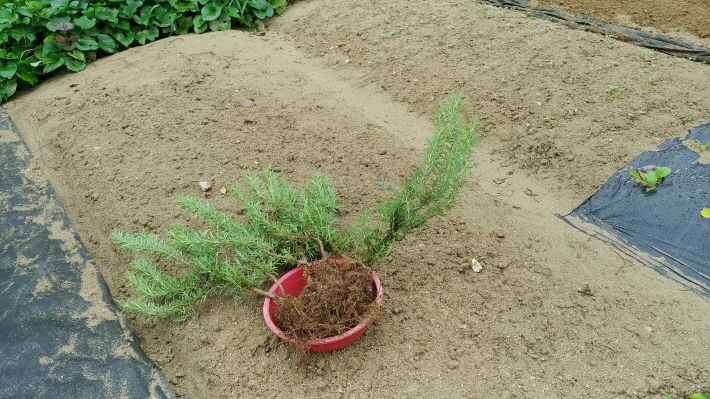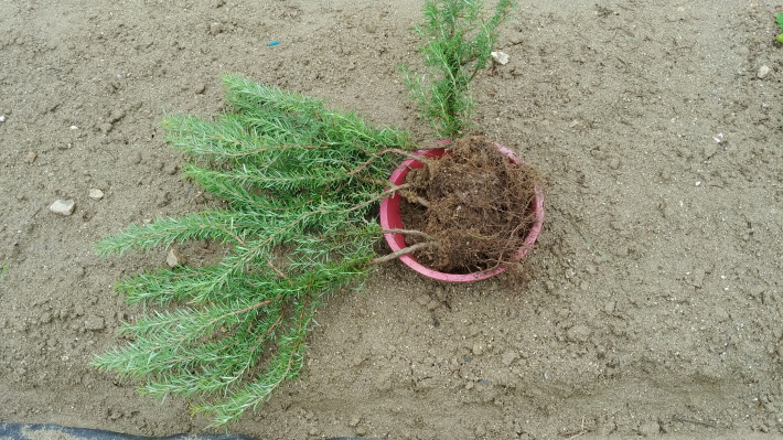 성목의 로즈마리를 뽑아 몇 갈래 뿌리를 내린 줄기를 갈라 포기를 나눈 후 밭에 이식할 참입니다.