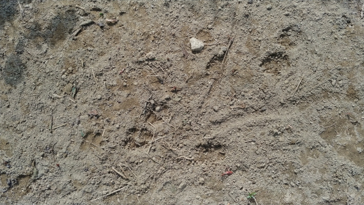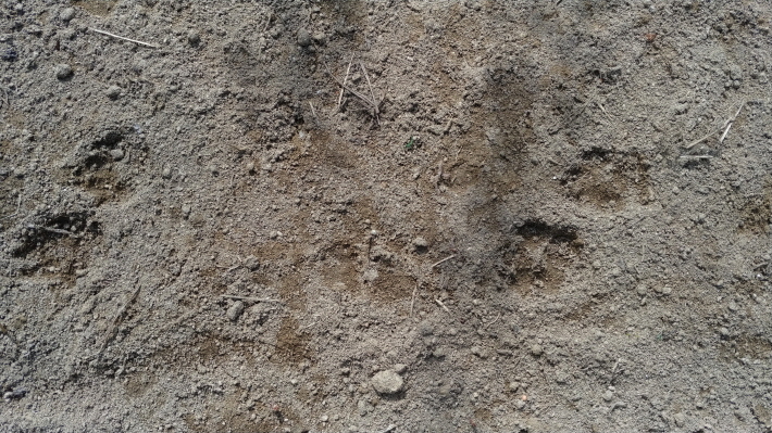 멧돼지나 고라니 그리고 고양이 발자국은 아닌 것 같고, 개 발자국이 유력해 보이는데 이웃에서는 다른 짐승발자국이 아닐까라는 의견이다.