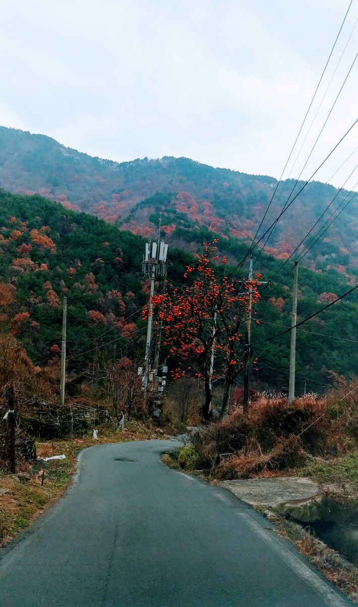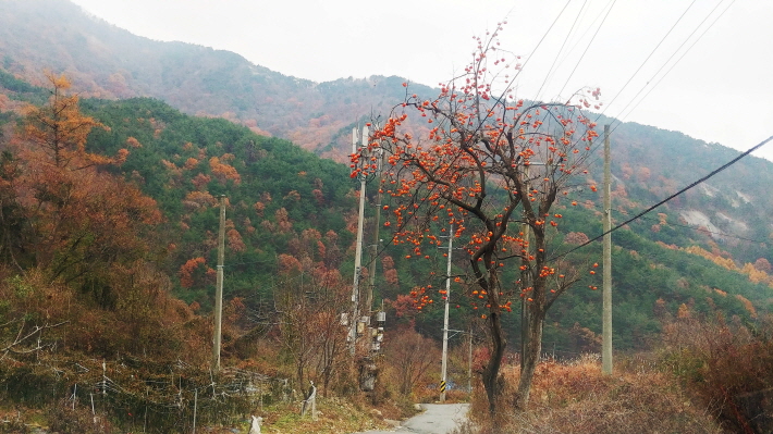 길가에 하늘 높은 줄 모르고 솟아오른 감나무는 열매를 주렁주렁 달았습니다.