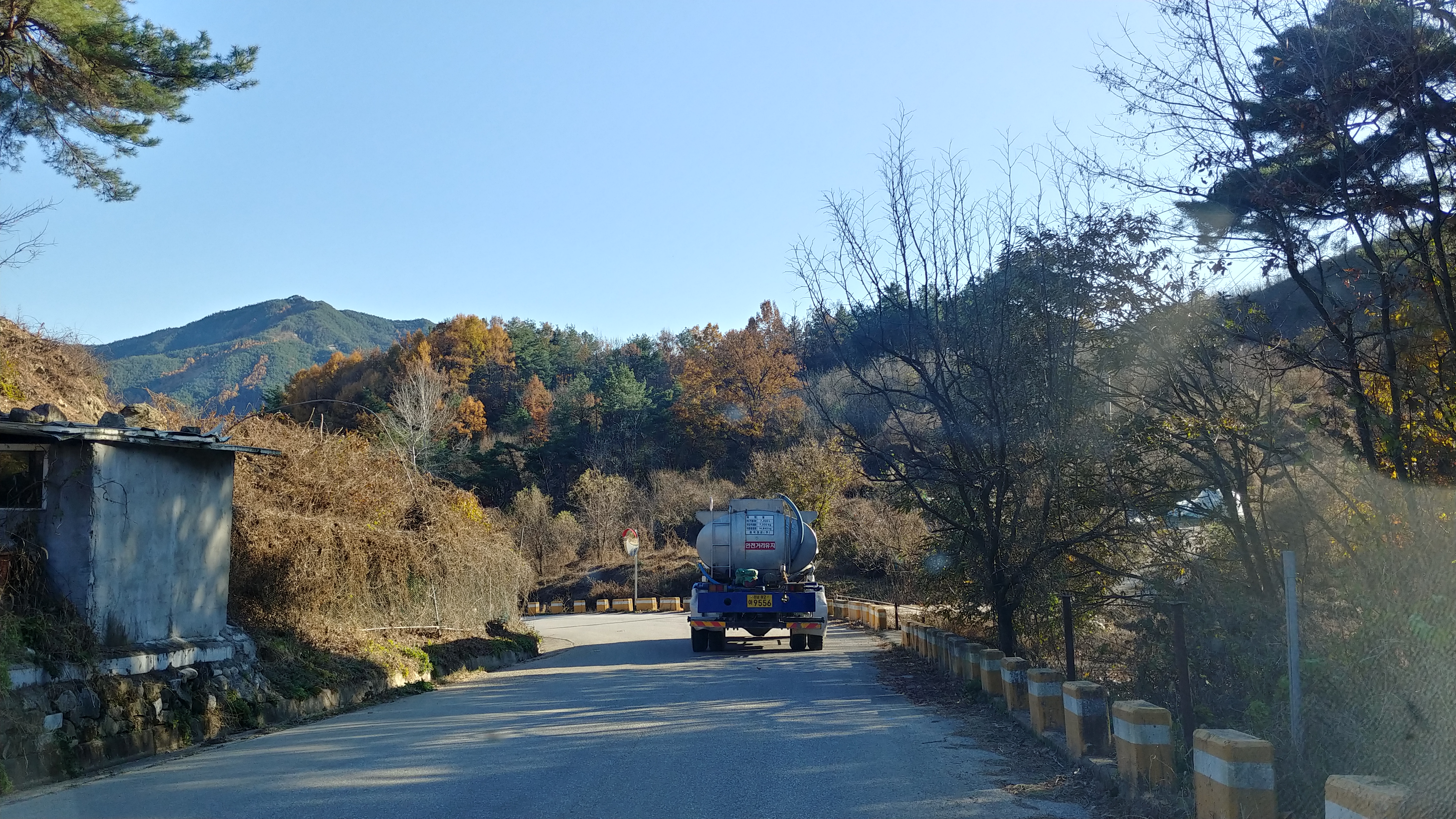 중앙선도 없는 좁은 도로를 과속하는 것은 물론이고 커브길에서는 전방 주시도 불완전한 상태에서도 급히 달리는 대형 차량들.