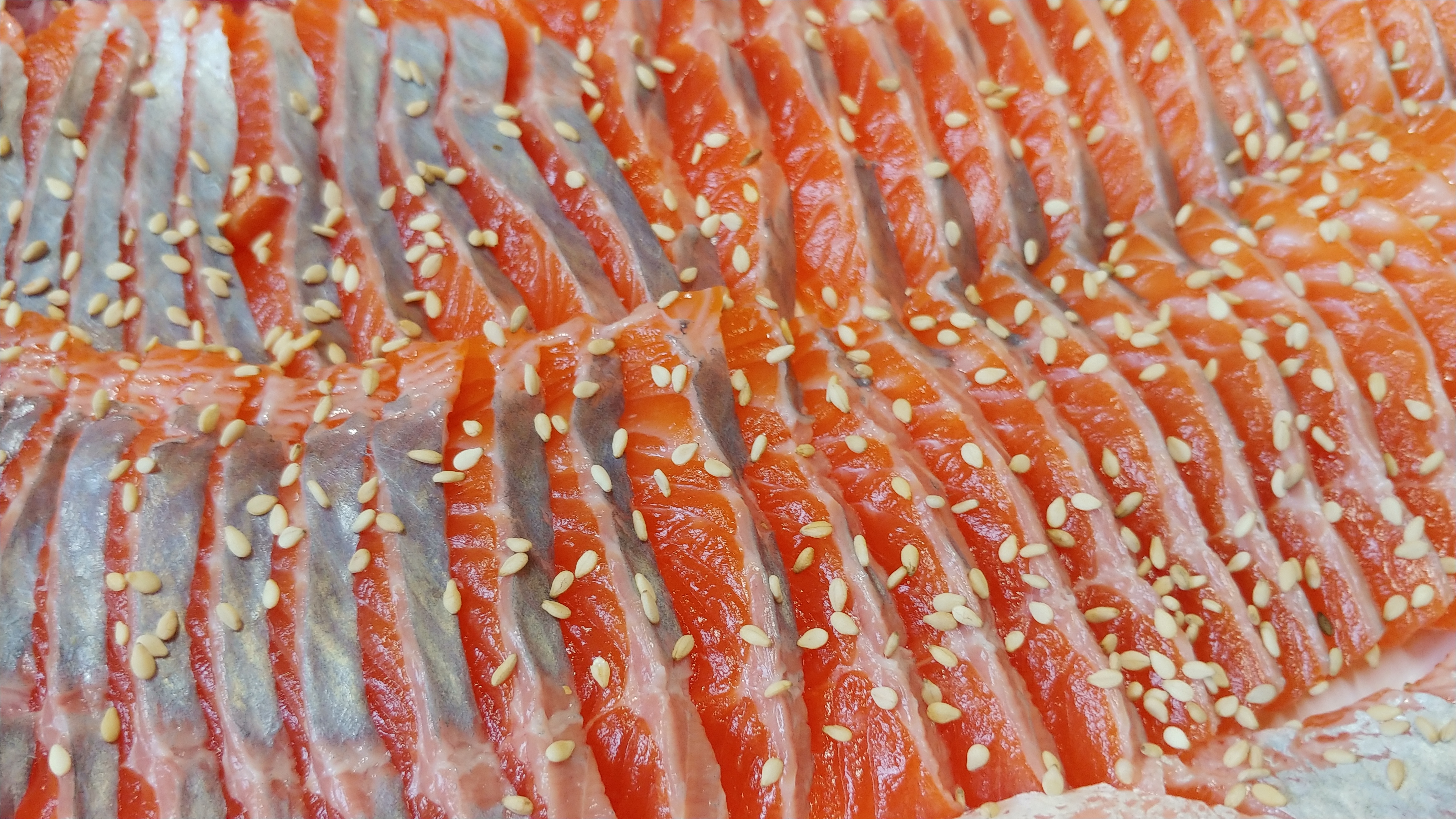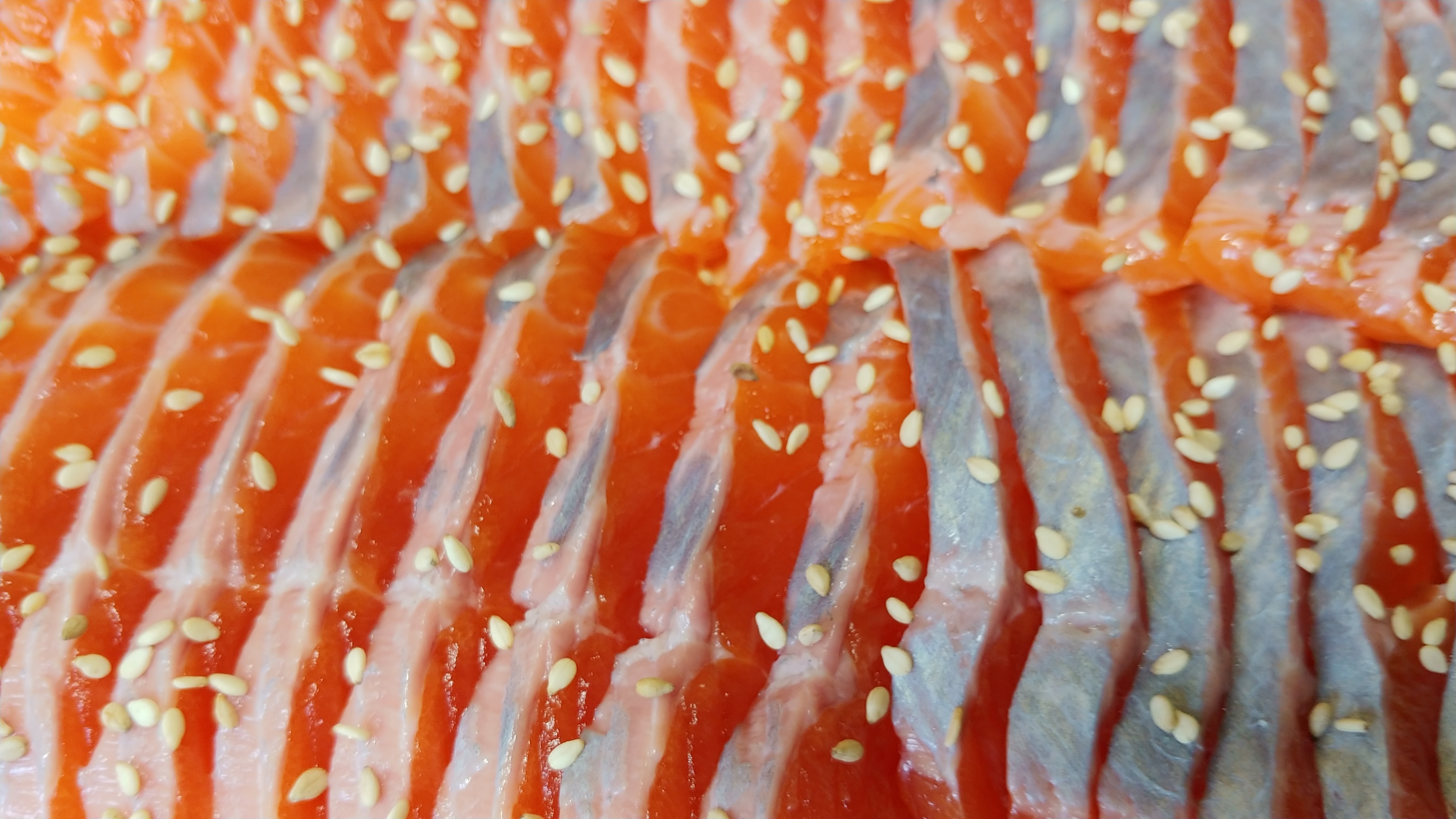 붉은 빛을 띠는 송어회가 먹음직스러워 보입니다.