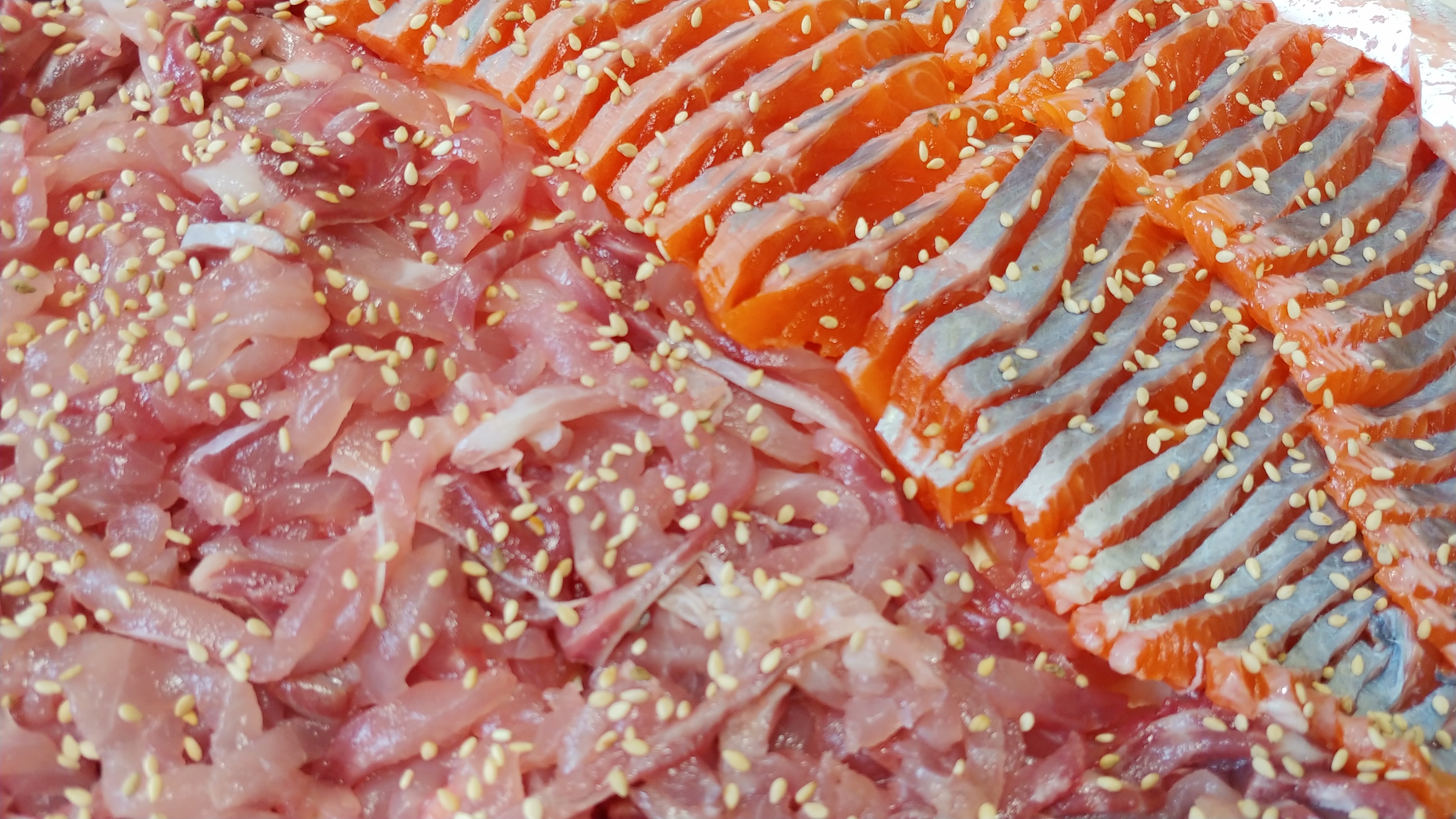 송어와 향어를 반반씩 썰어 한 접시를 만들었습니다.
