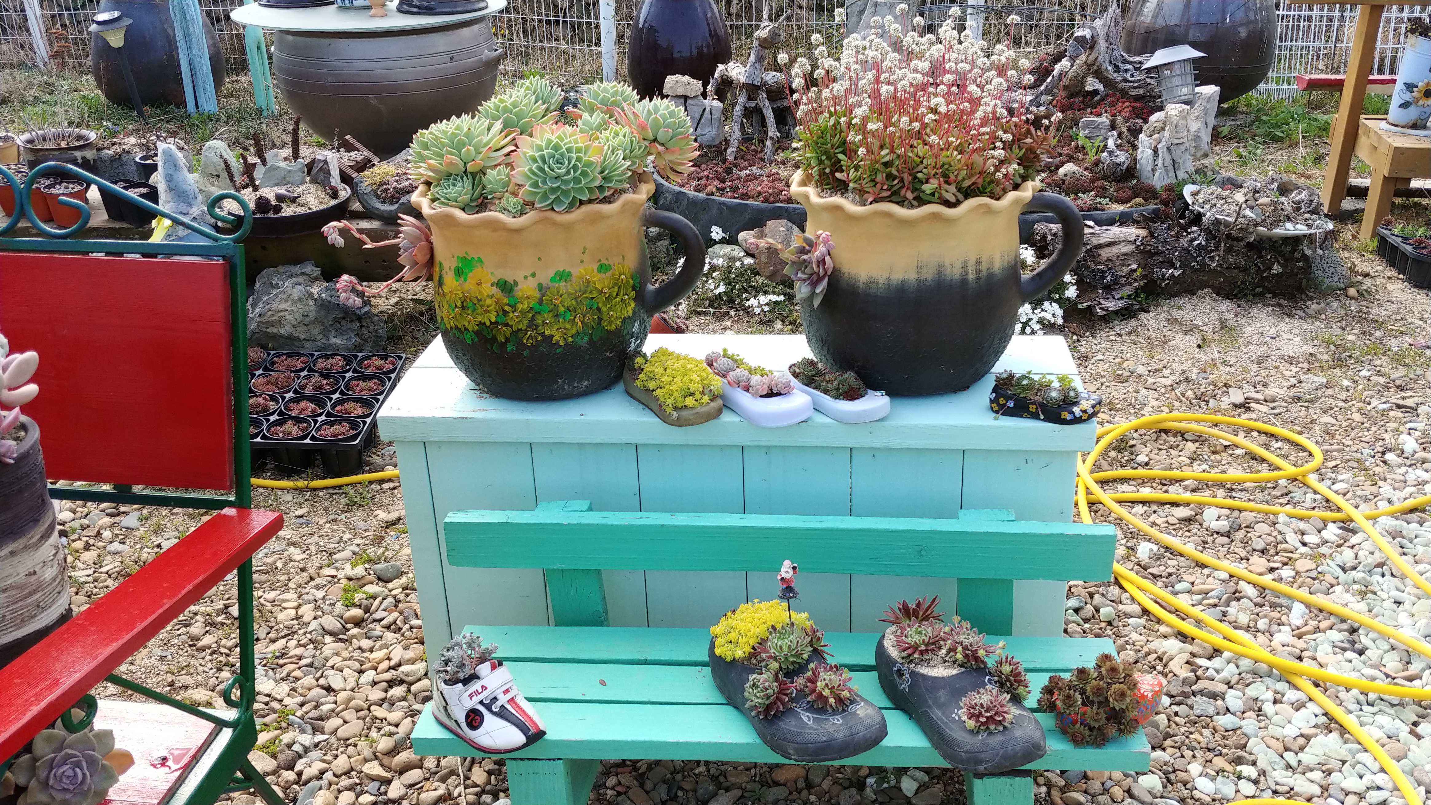 여러 작품 중에서도 눈길을 끄는 다육작품은 예쁜 아기 신발에 제 몸을 맡긴 다육입니다.