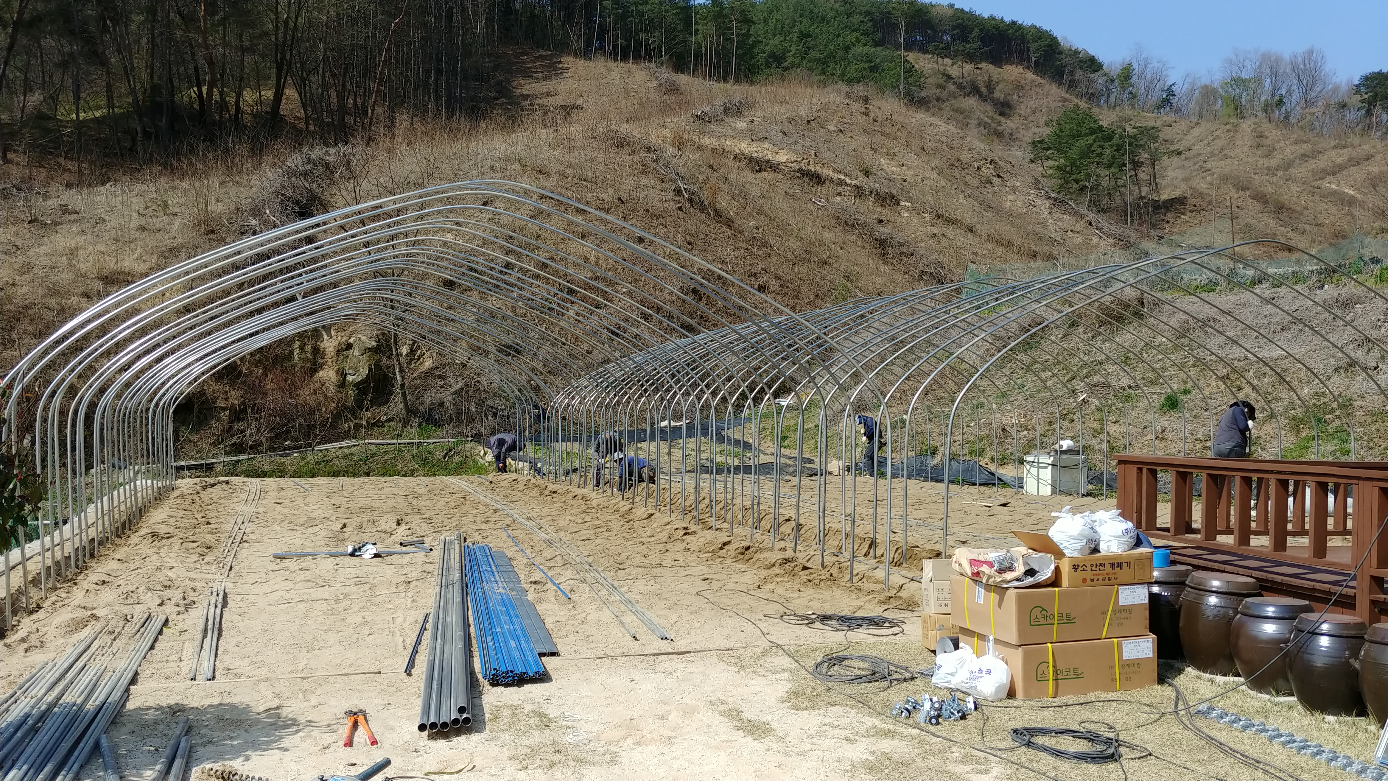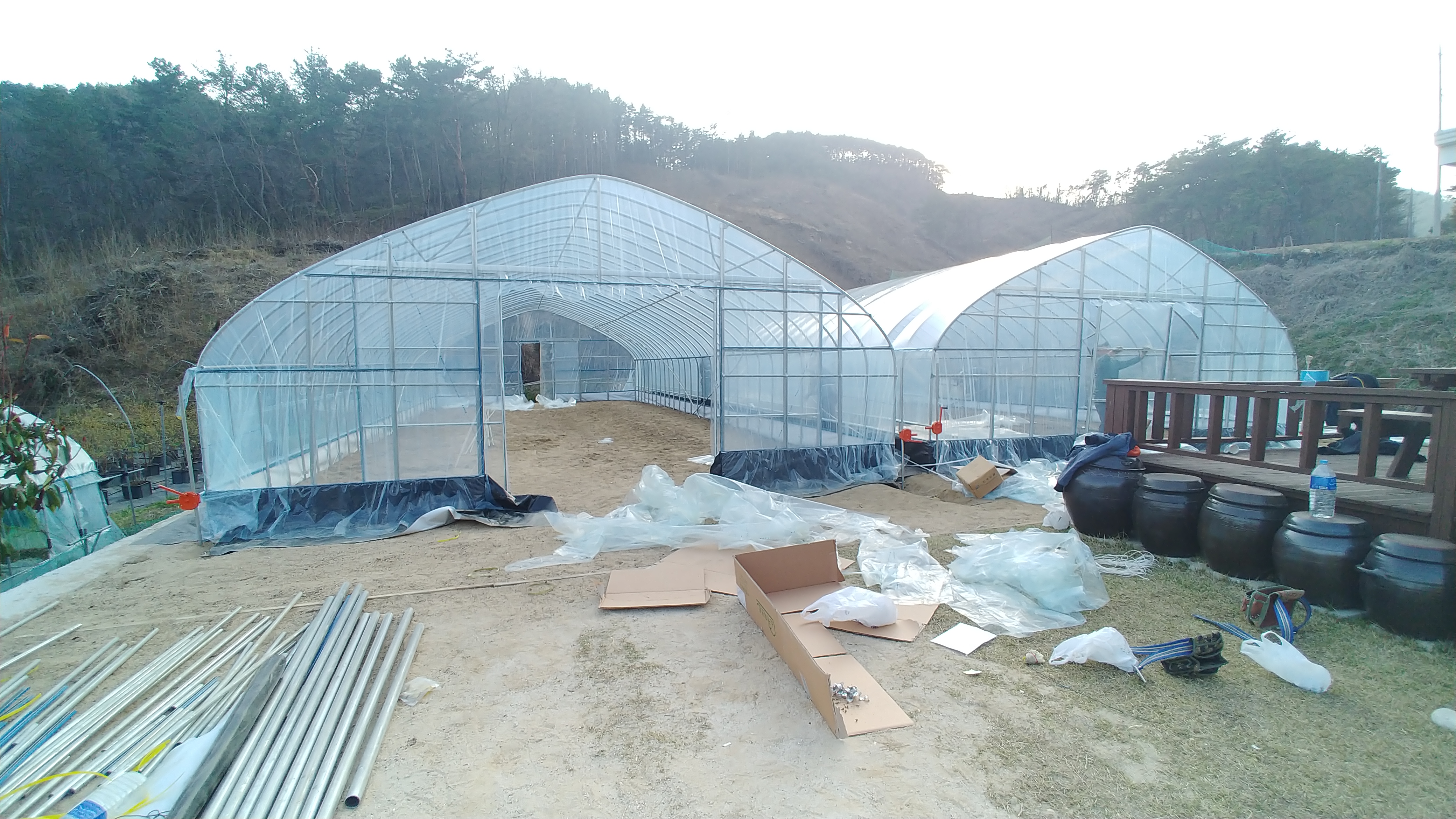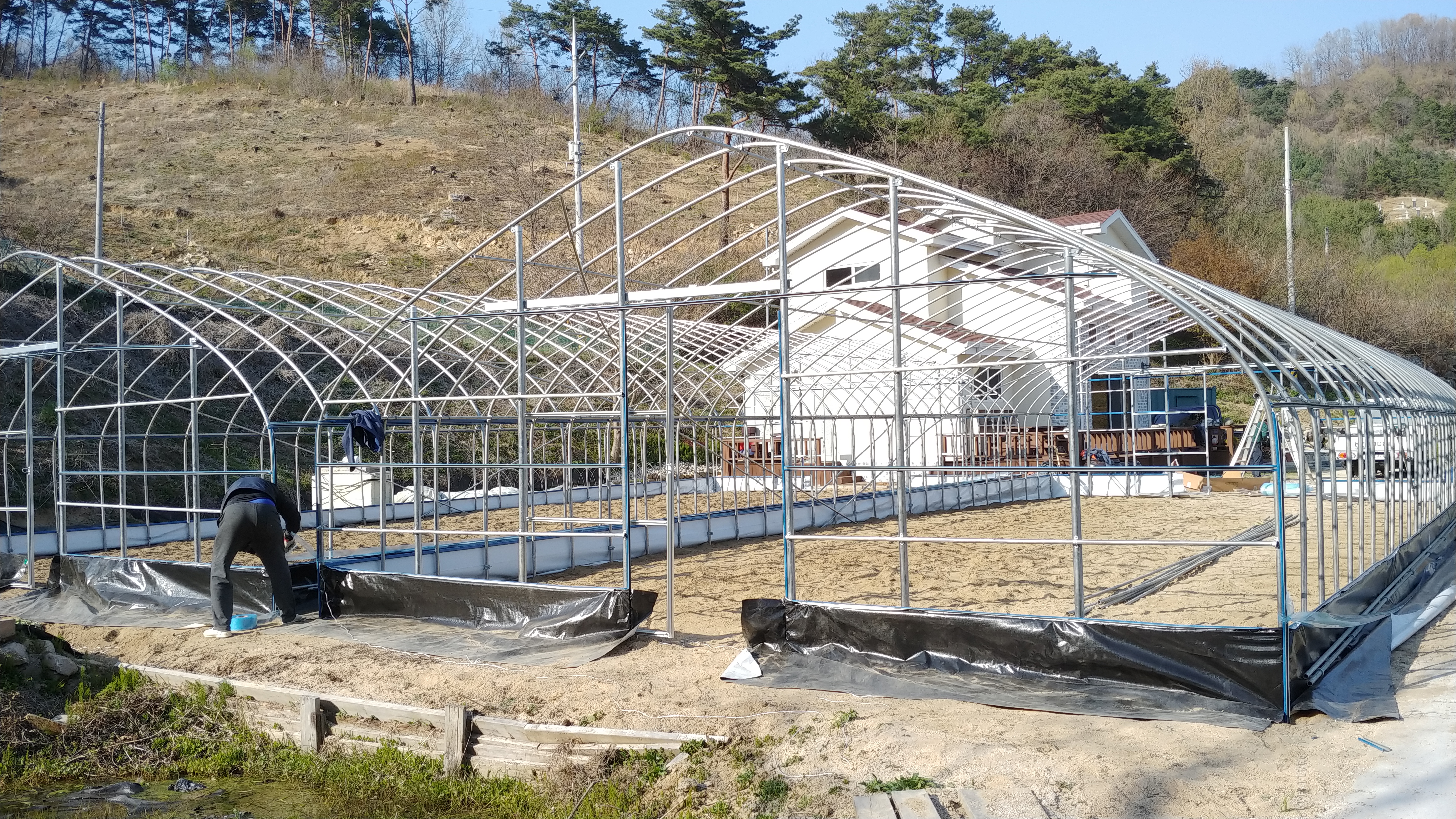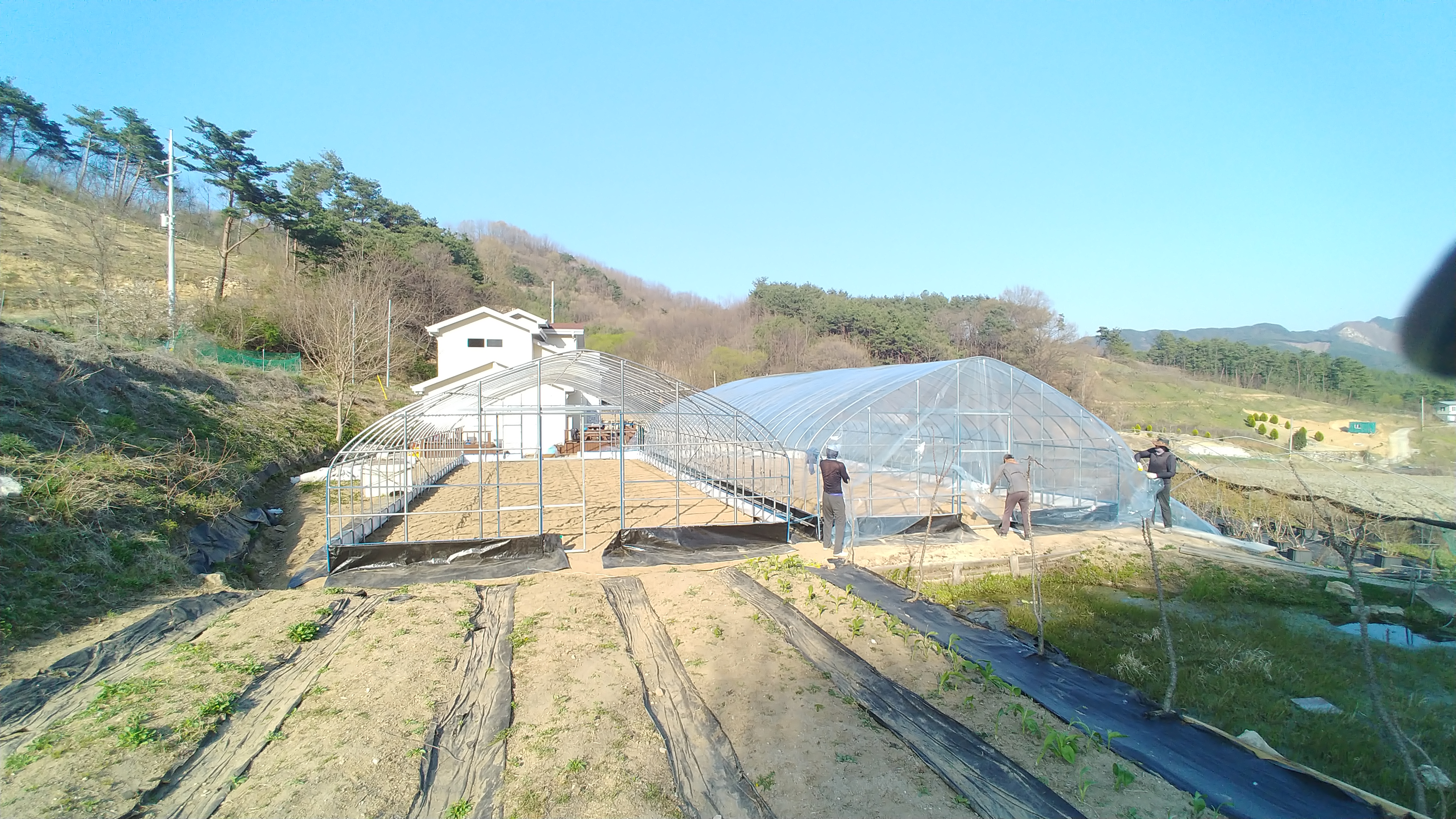 하룻만에 하우스 2개동을 설치하였습니다.
