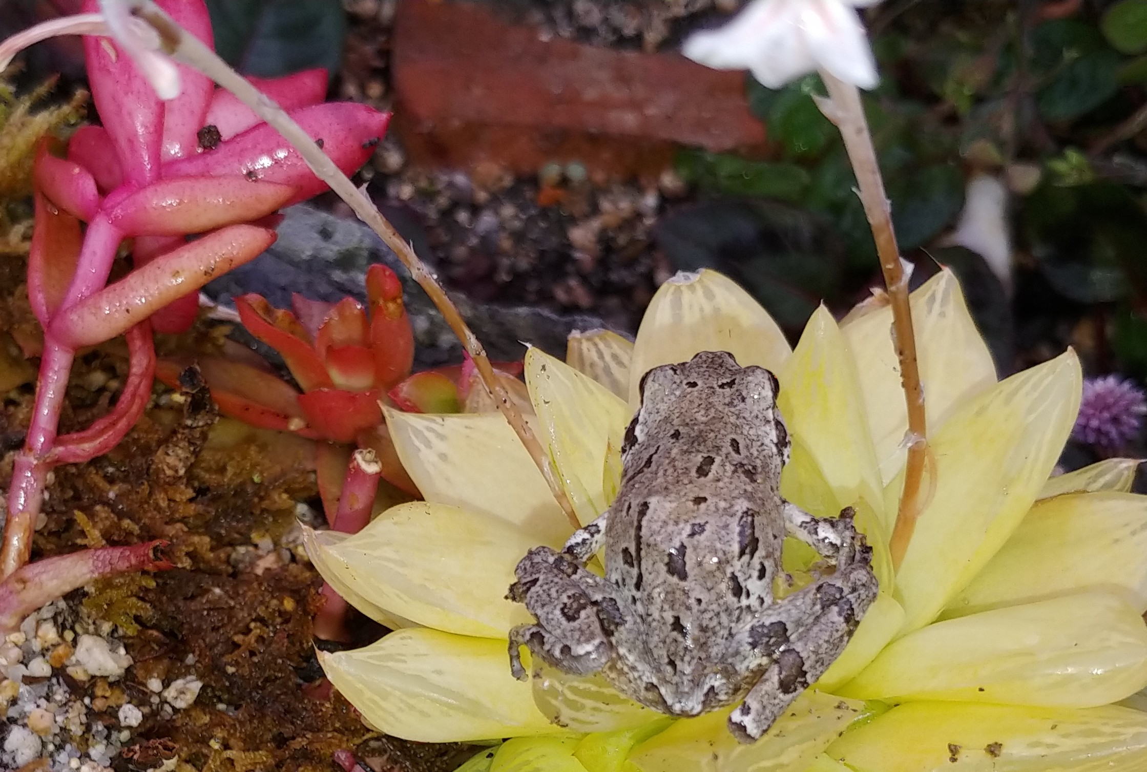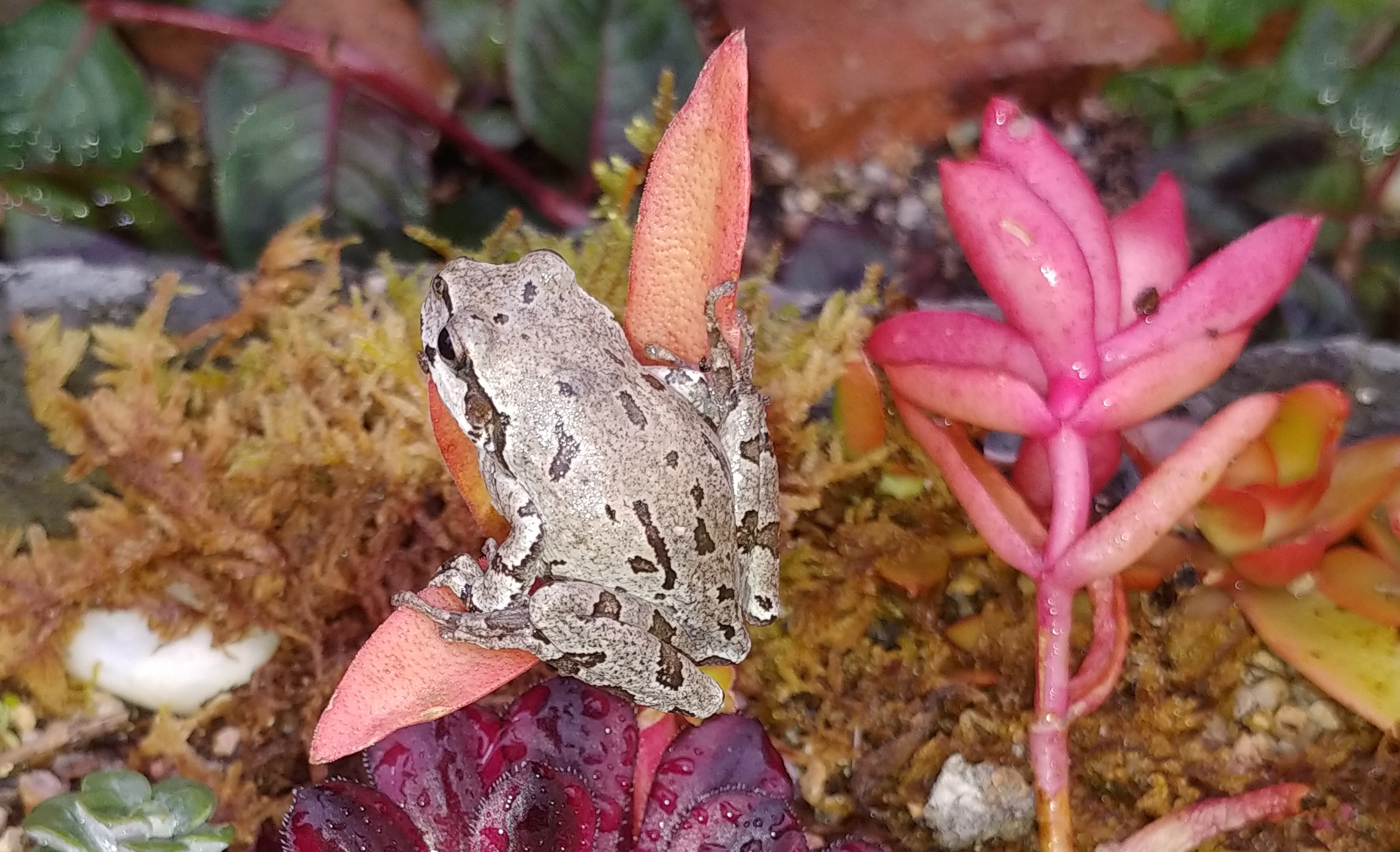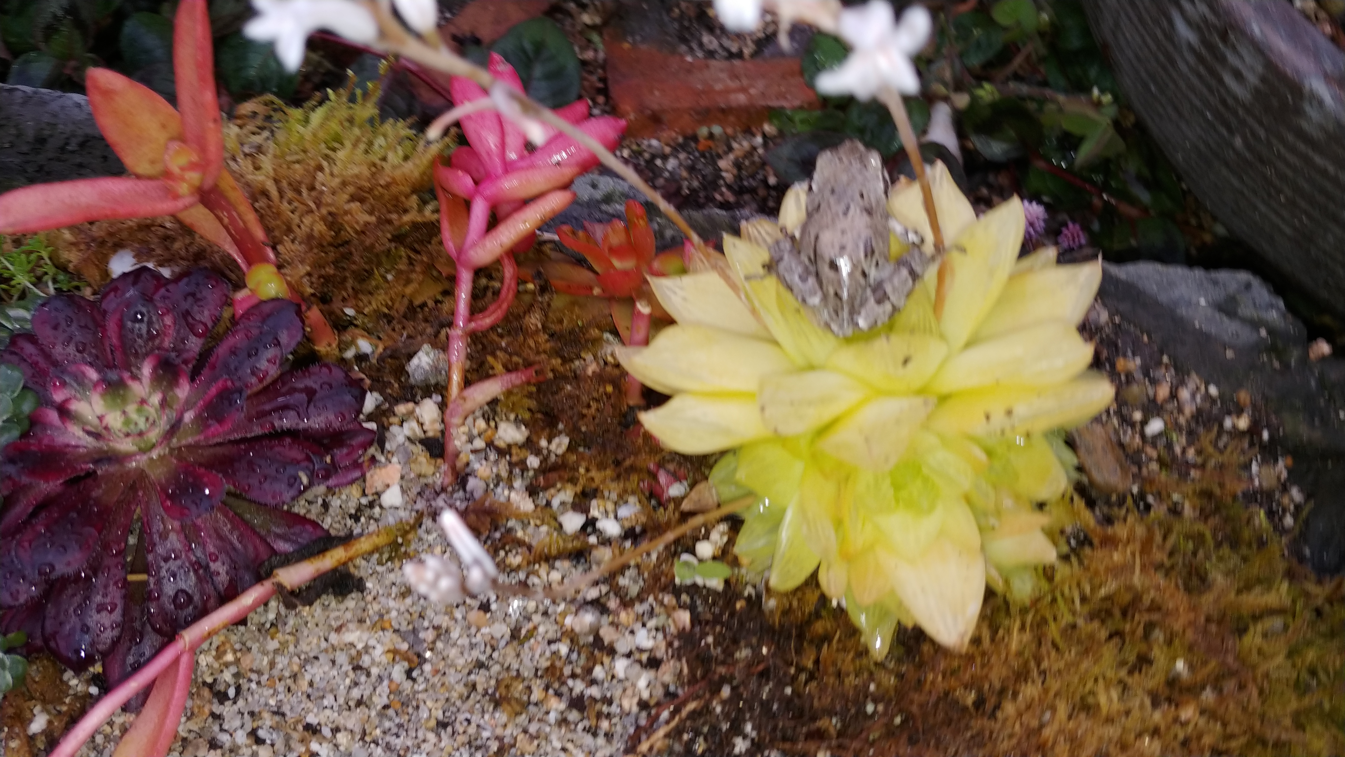 작은 개구리 한 마리가 다육이 위에 앉았습니다.
