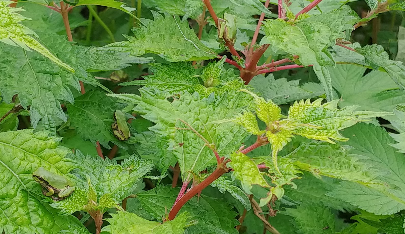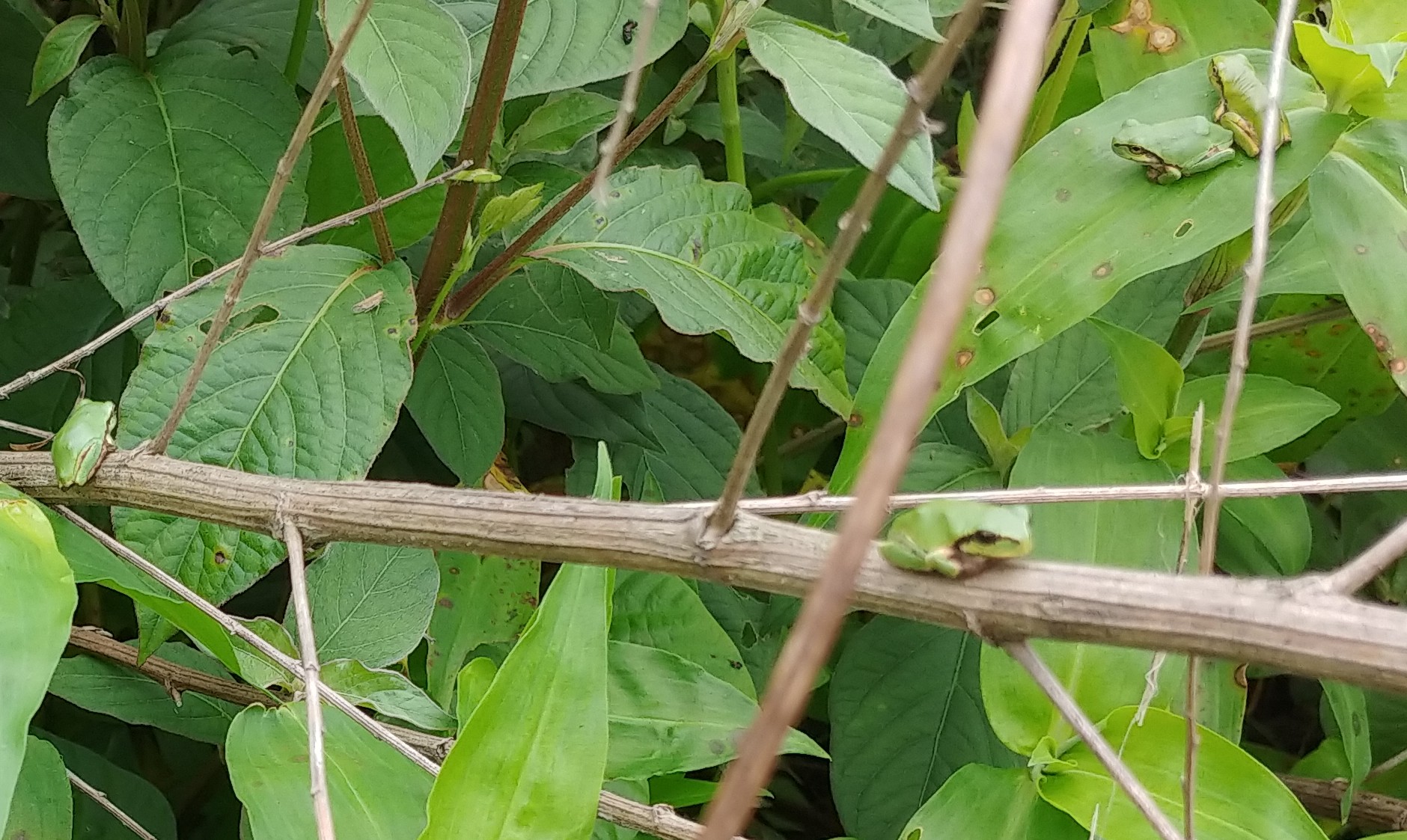 많이 앉이 있는 청개구리는 대여섯 마리나 됩니다.