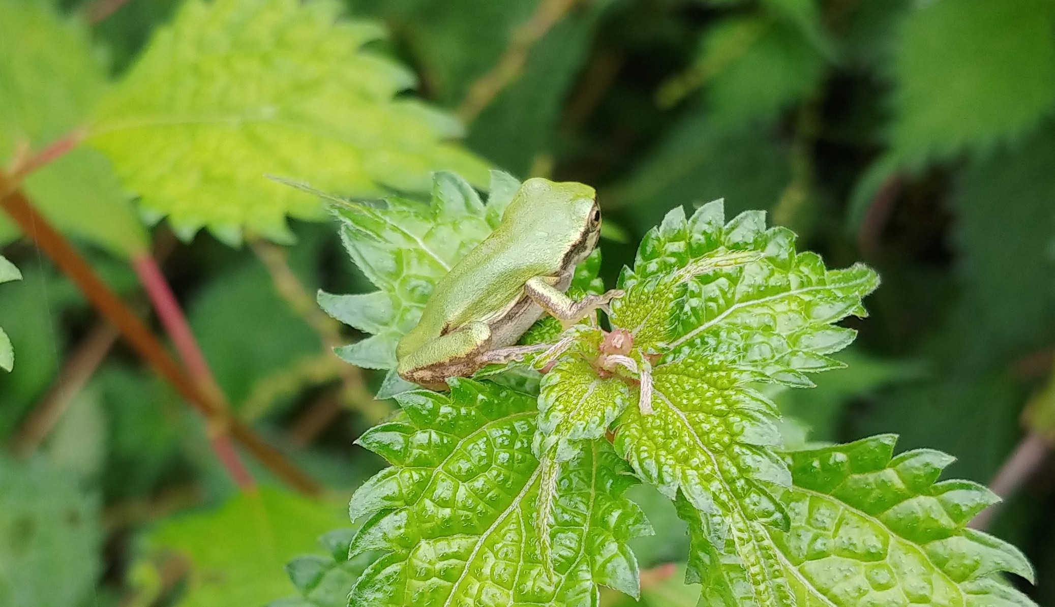제 몸을 닮은 나뭇잎에는 이주 작은 청개구리가 연약한 잎에 앉아 휴식을 취합니다.