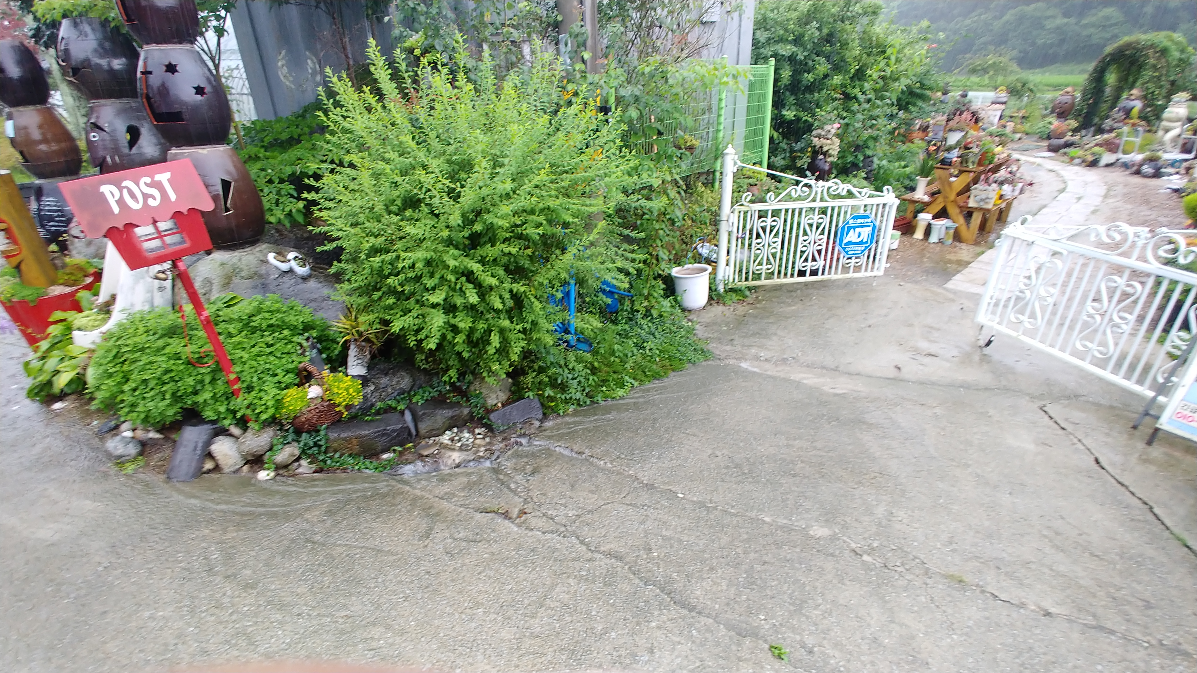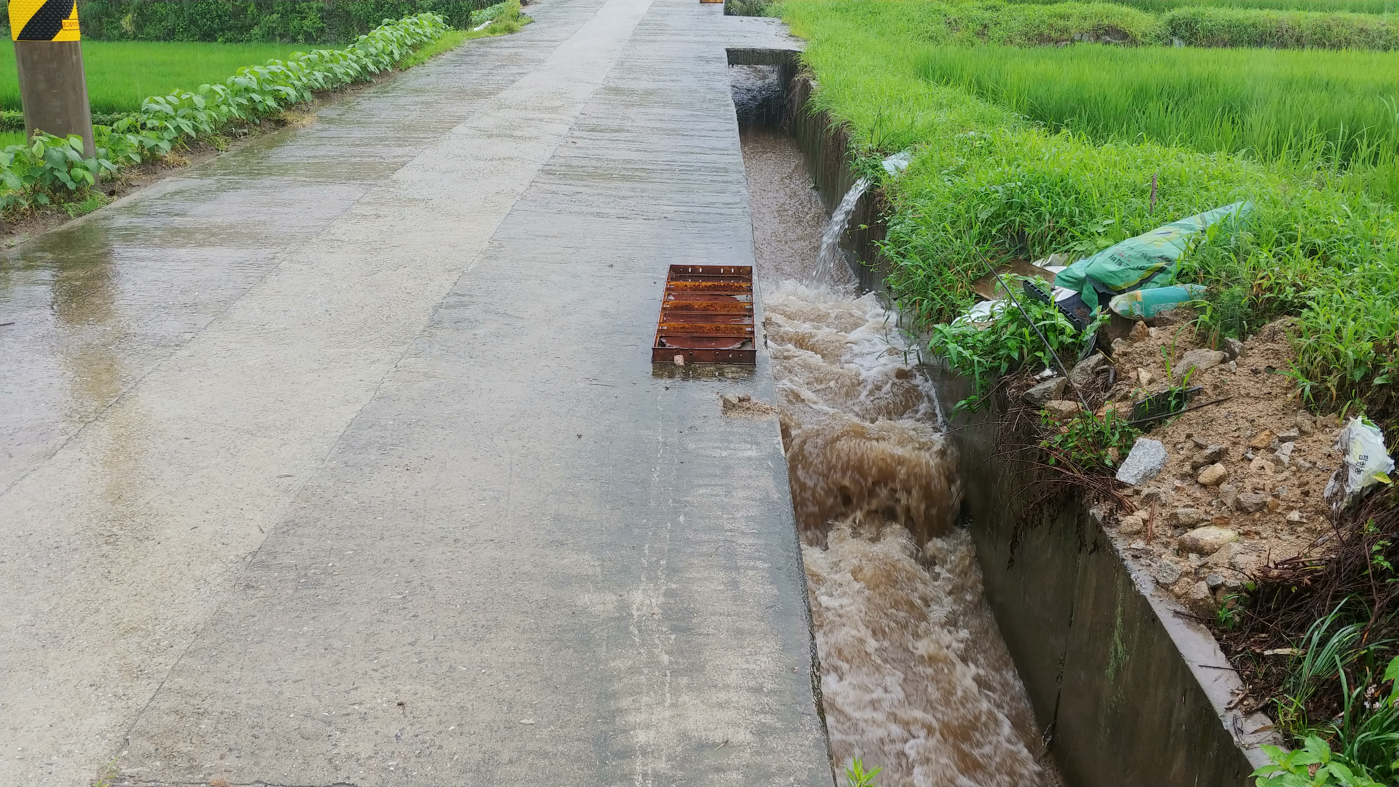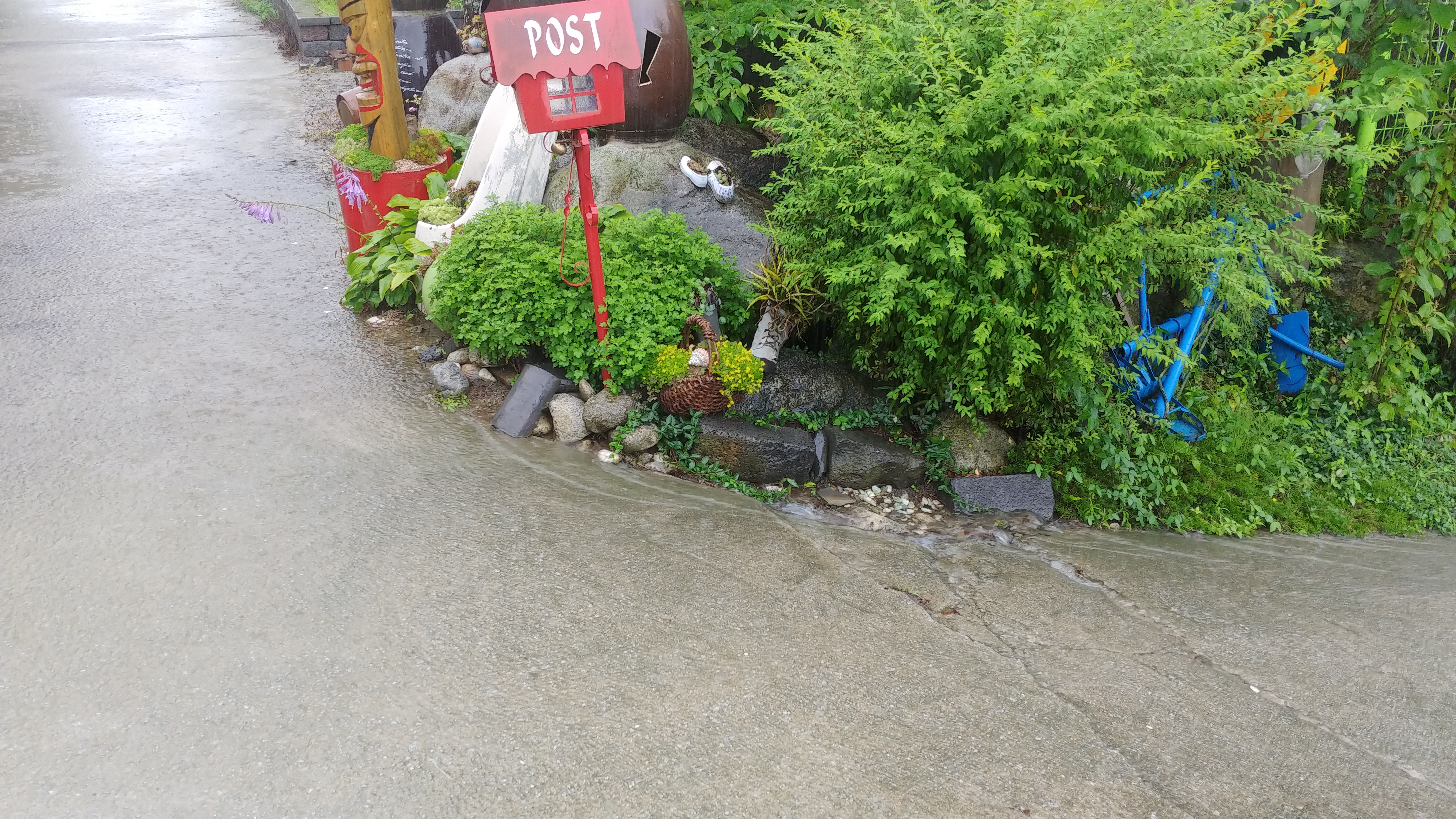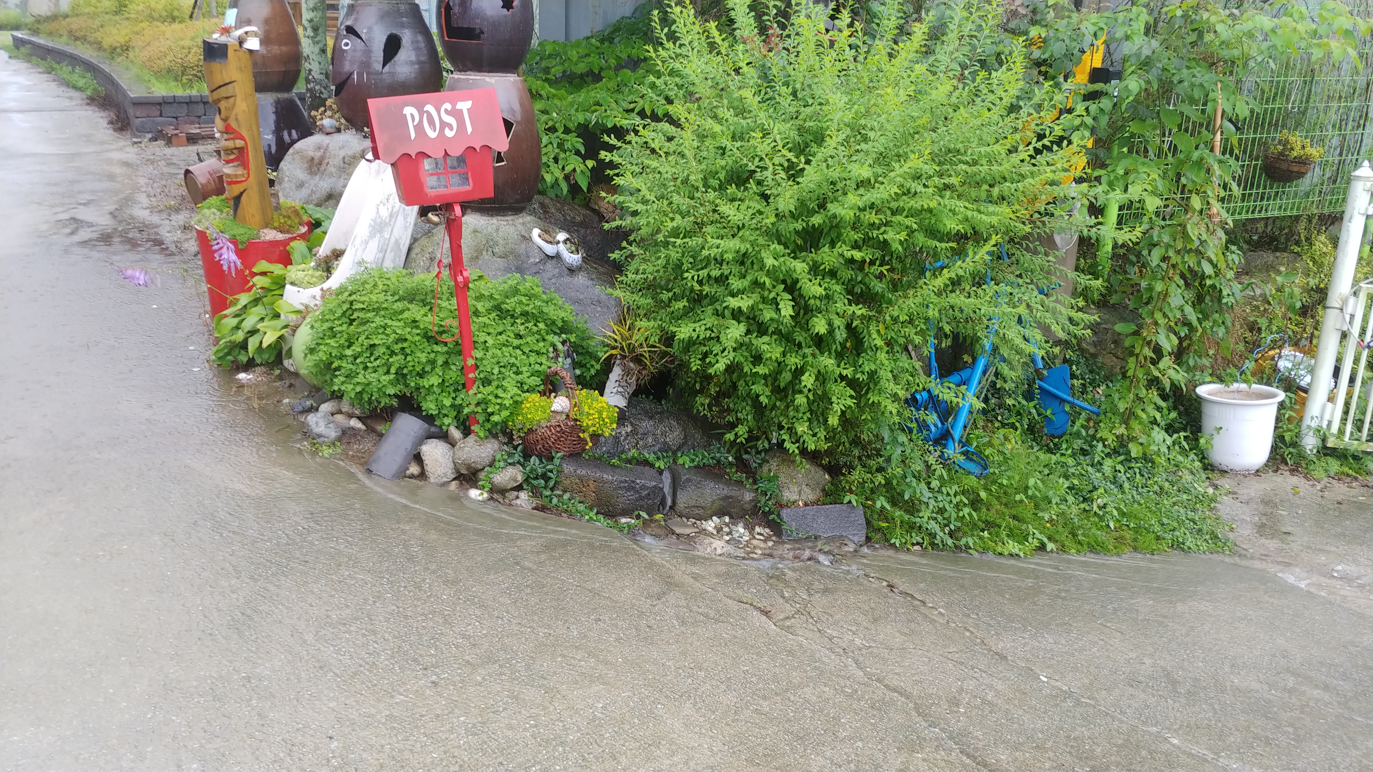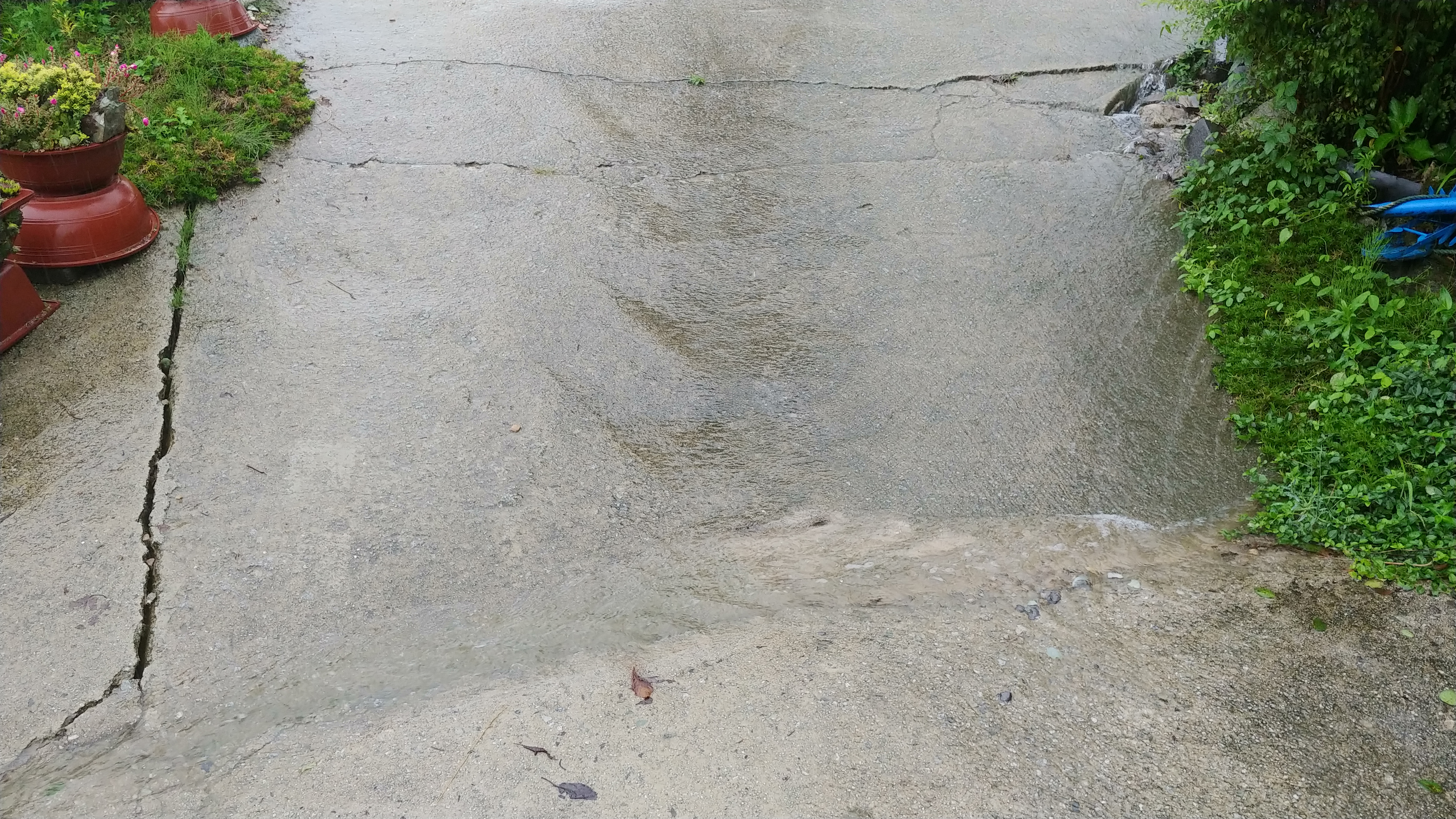 시간당 너무 많은 비가 내린 탓도 있지만, 도로 포장이 구배가 맞지 않아 도로 노면 높낮이 문제로 농장 안으로 빗물이 흘러 들어온다는 것이 문제입니다.