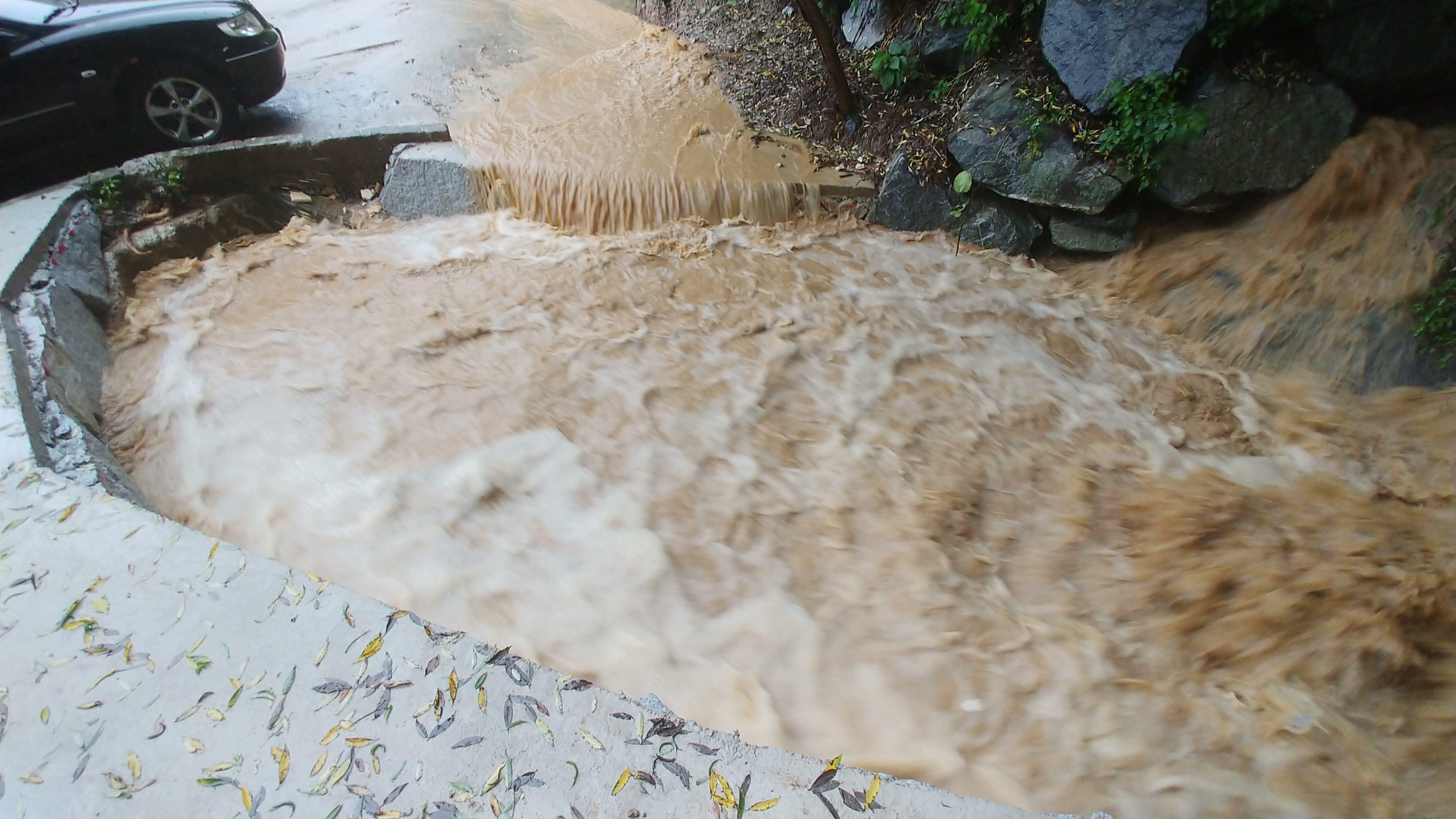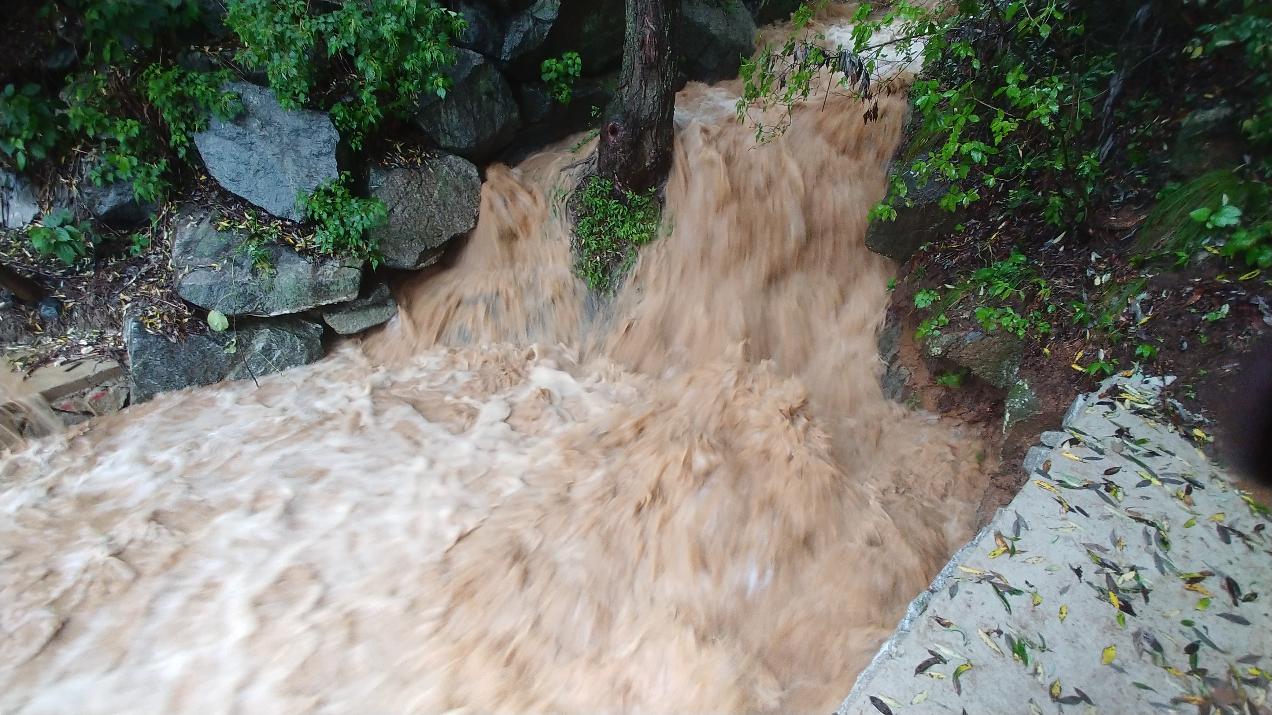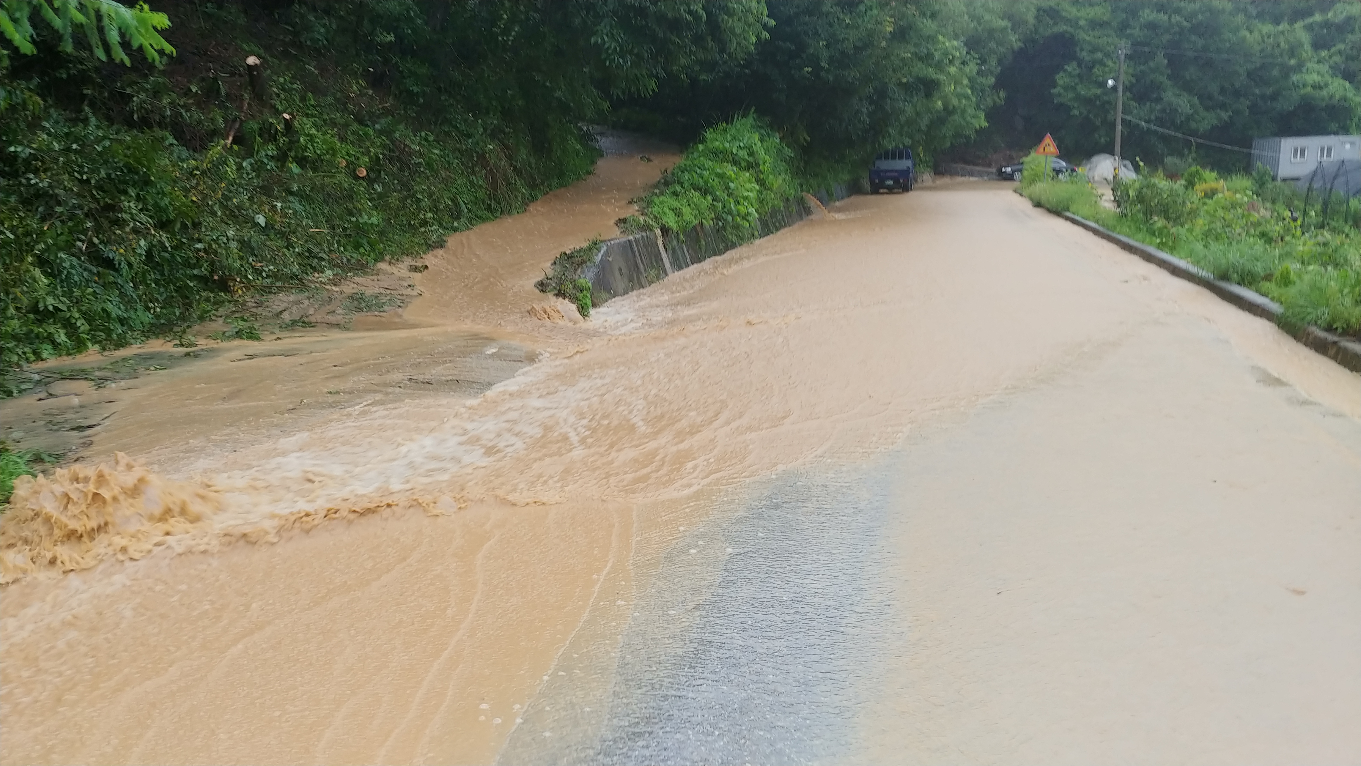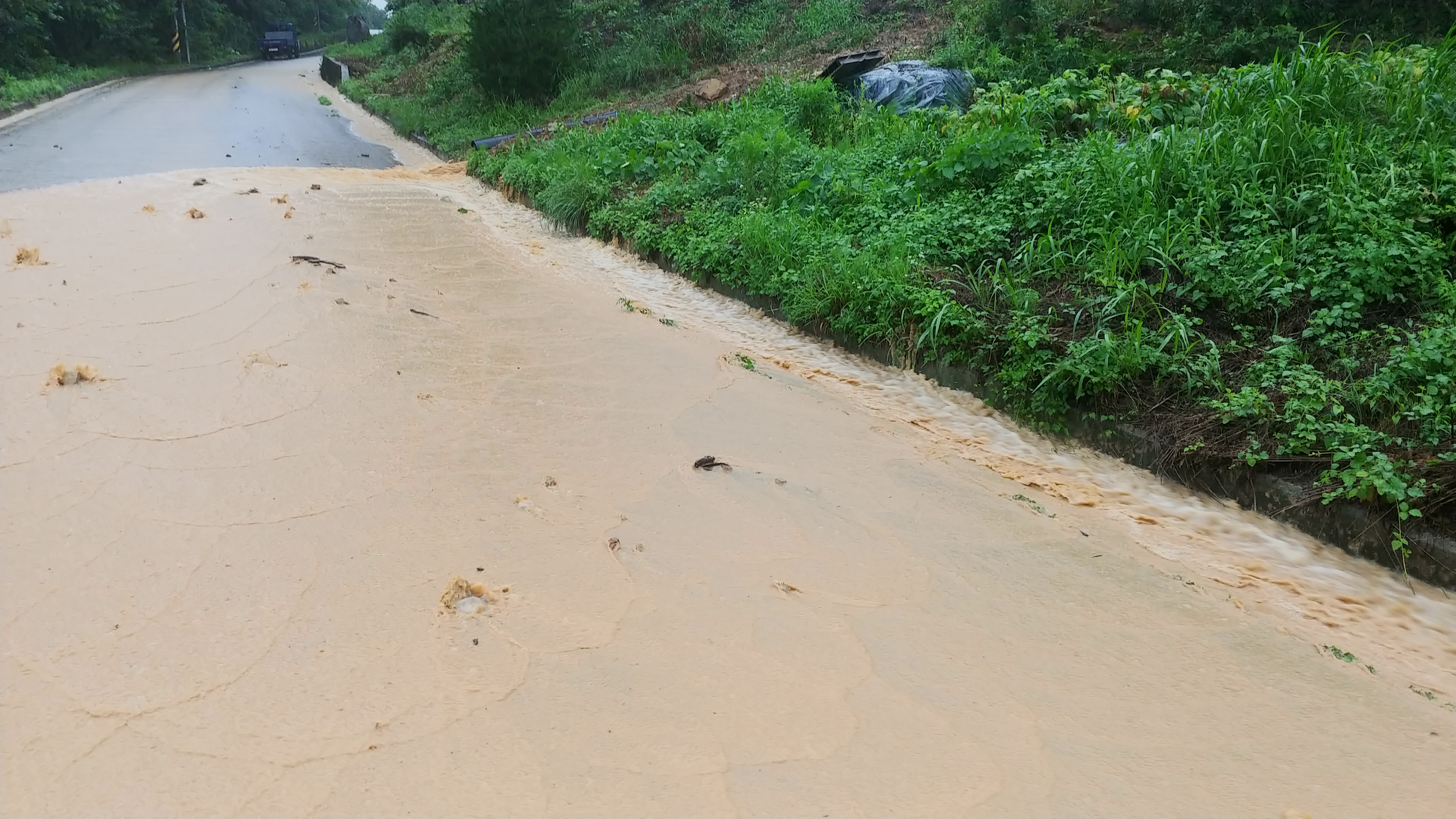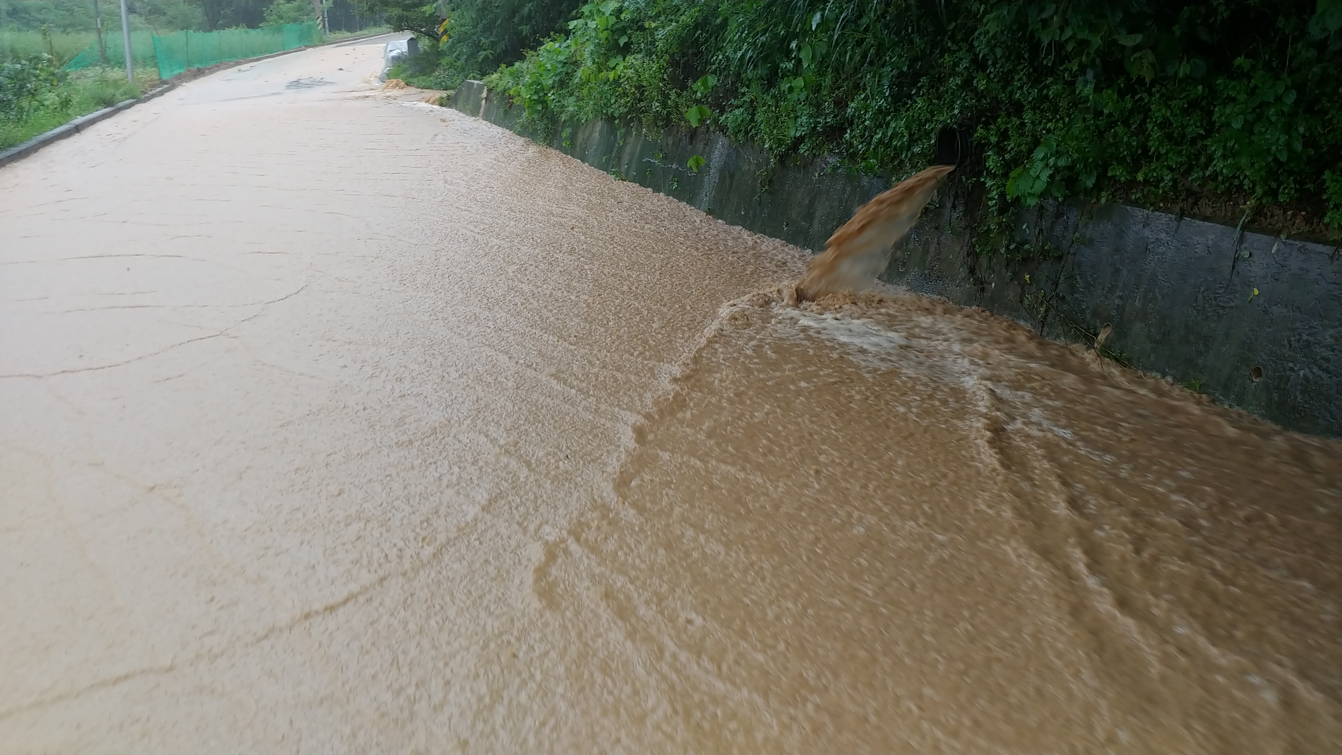 도로는 흙탕물이 물살을 이루며 아래로 치닫습니다.
