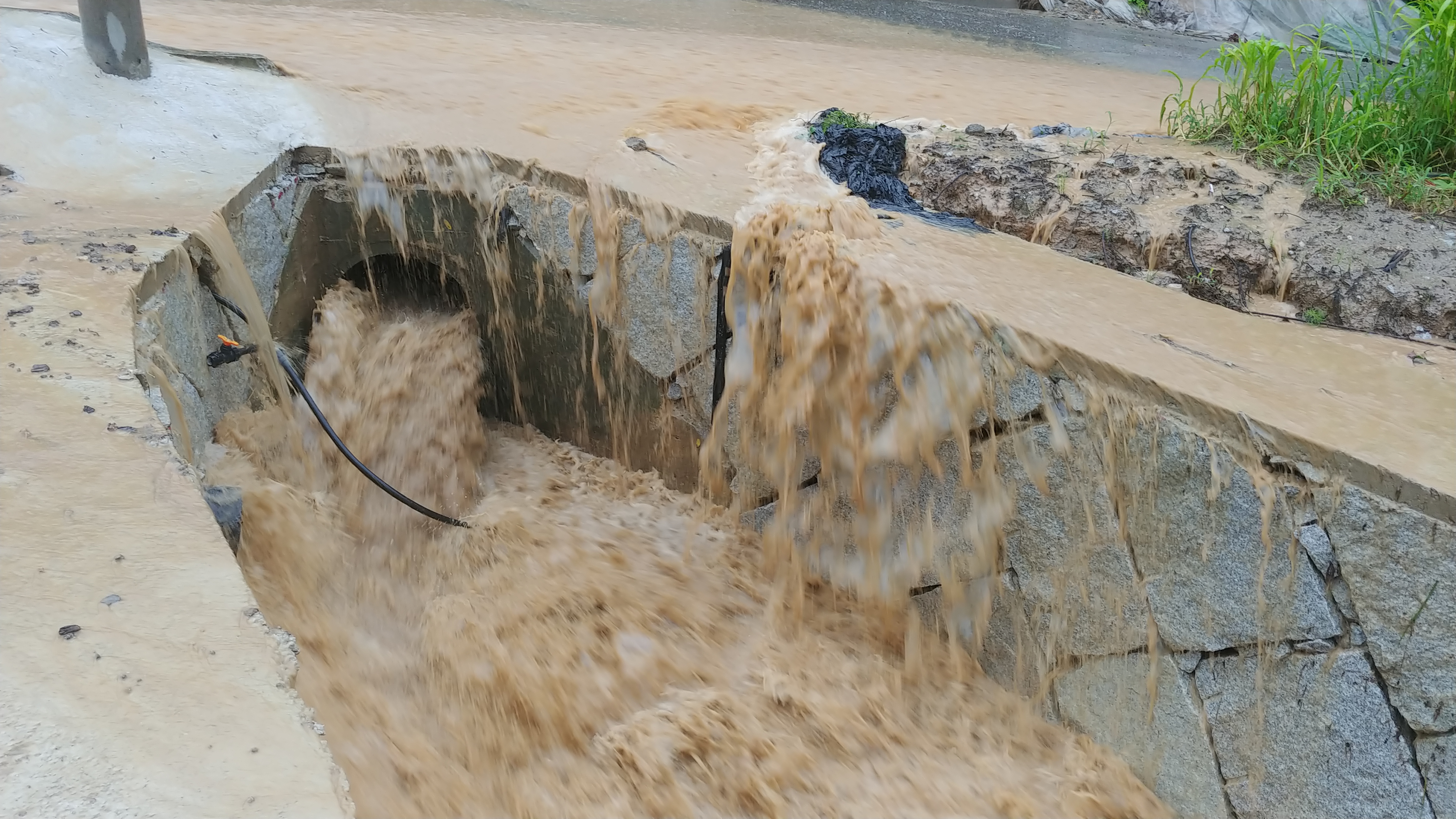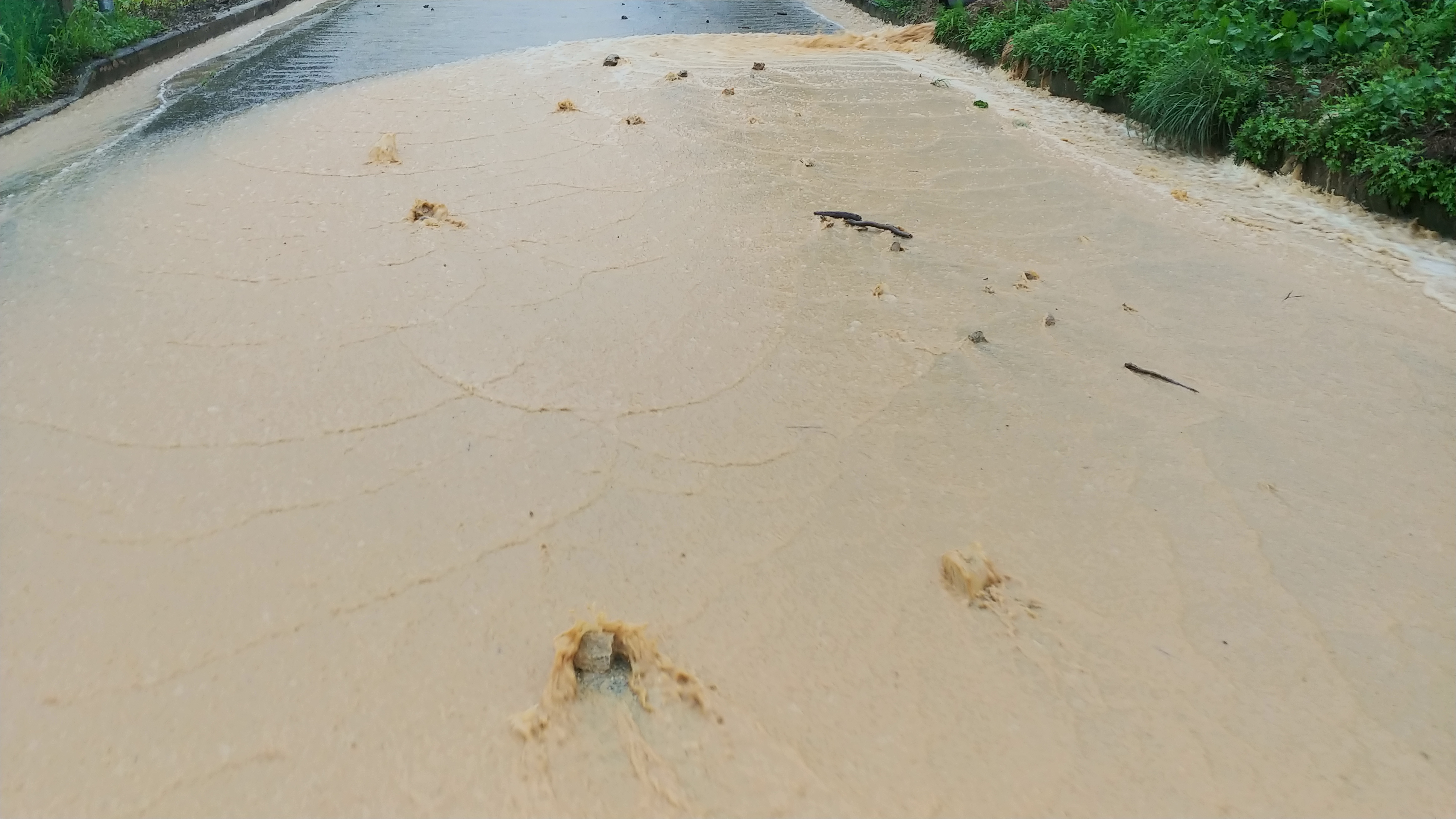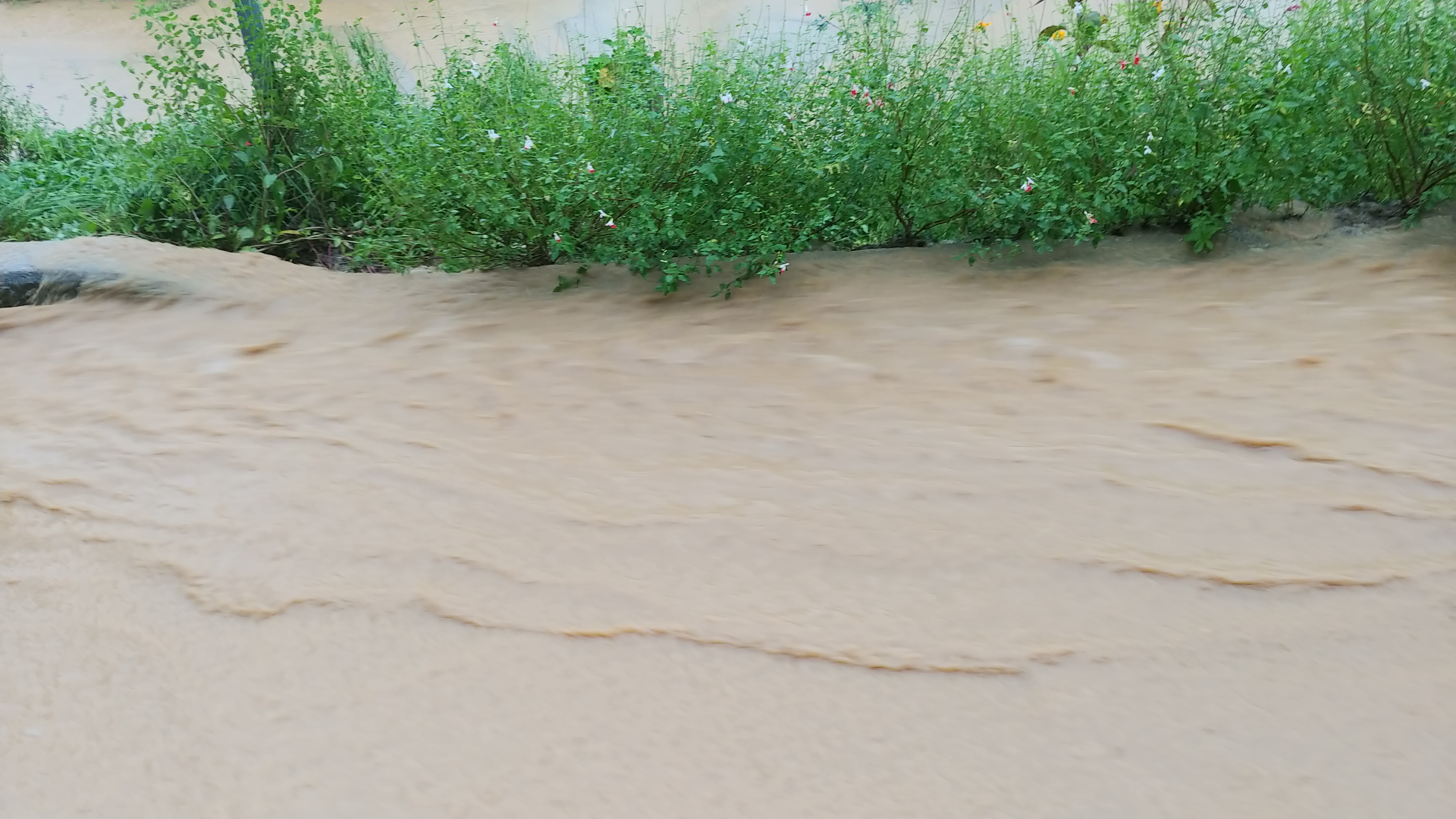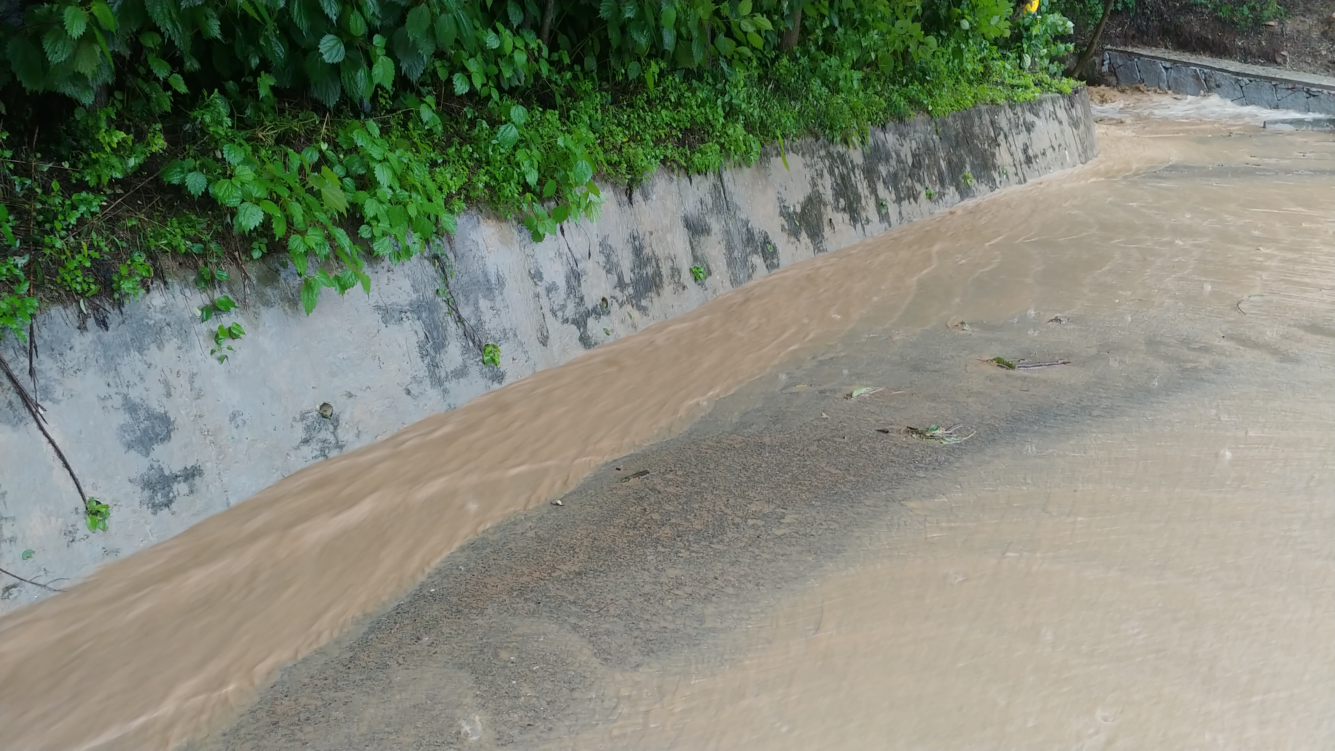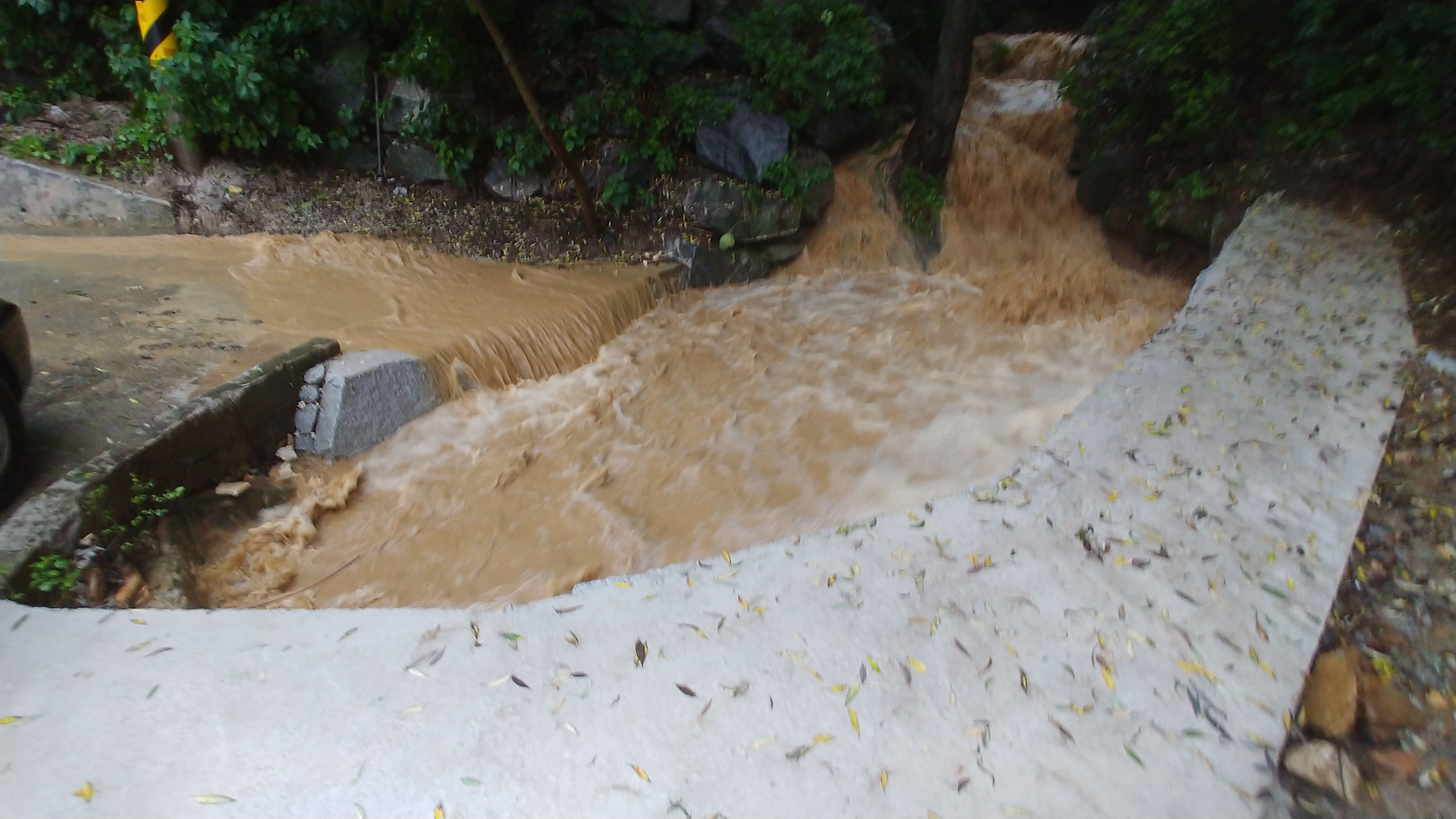 도로는 흙탕물이 물살을 이루며 아래로 치닫습니다.