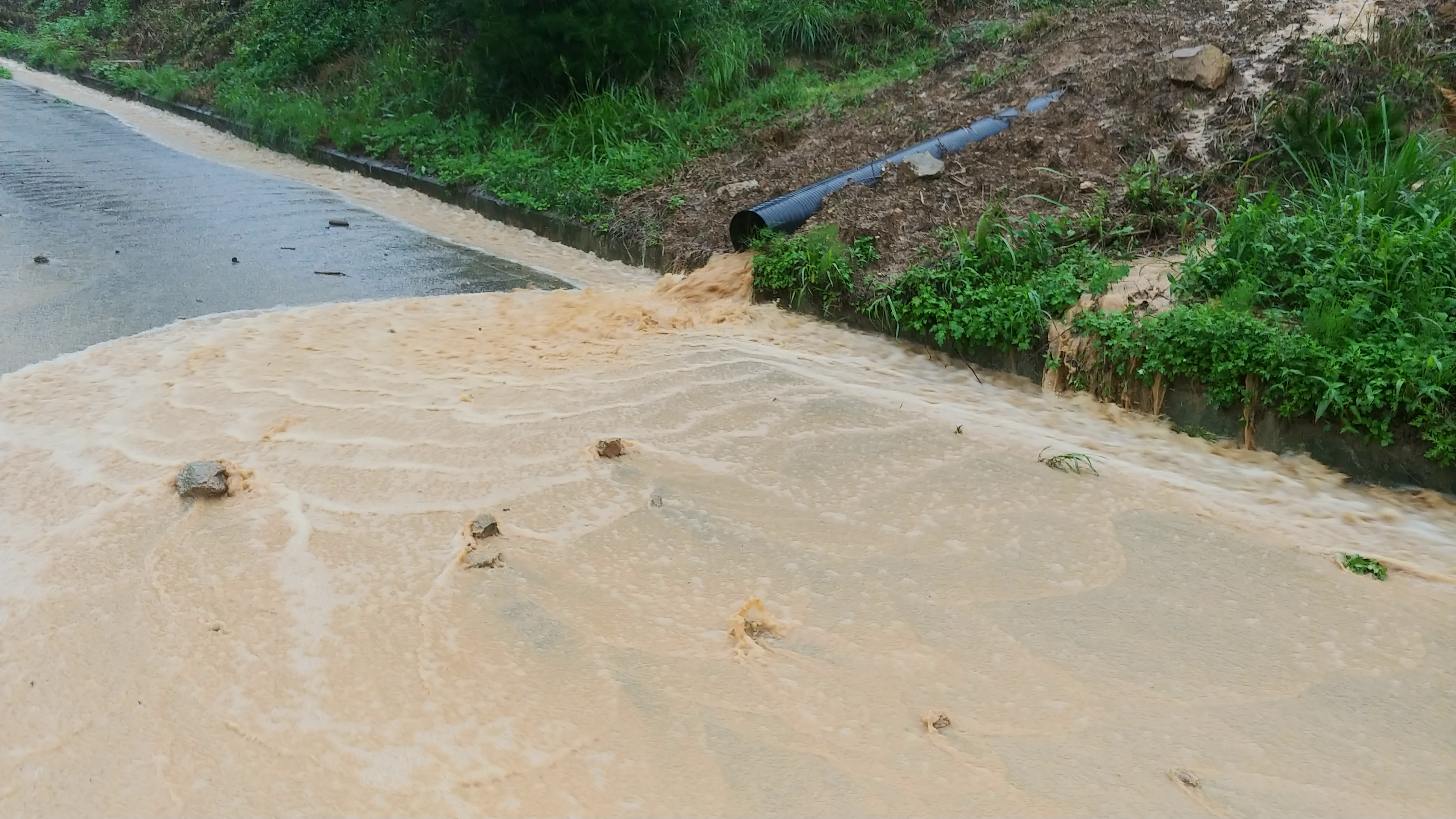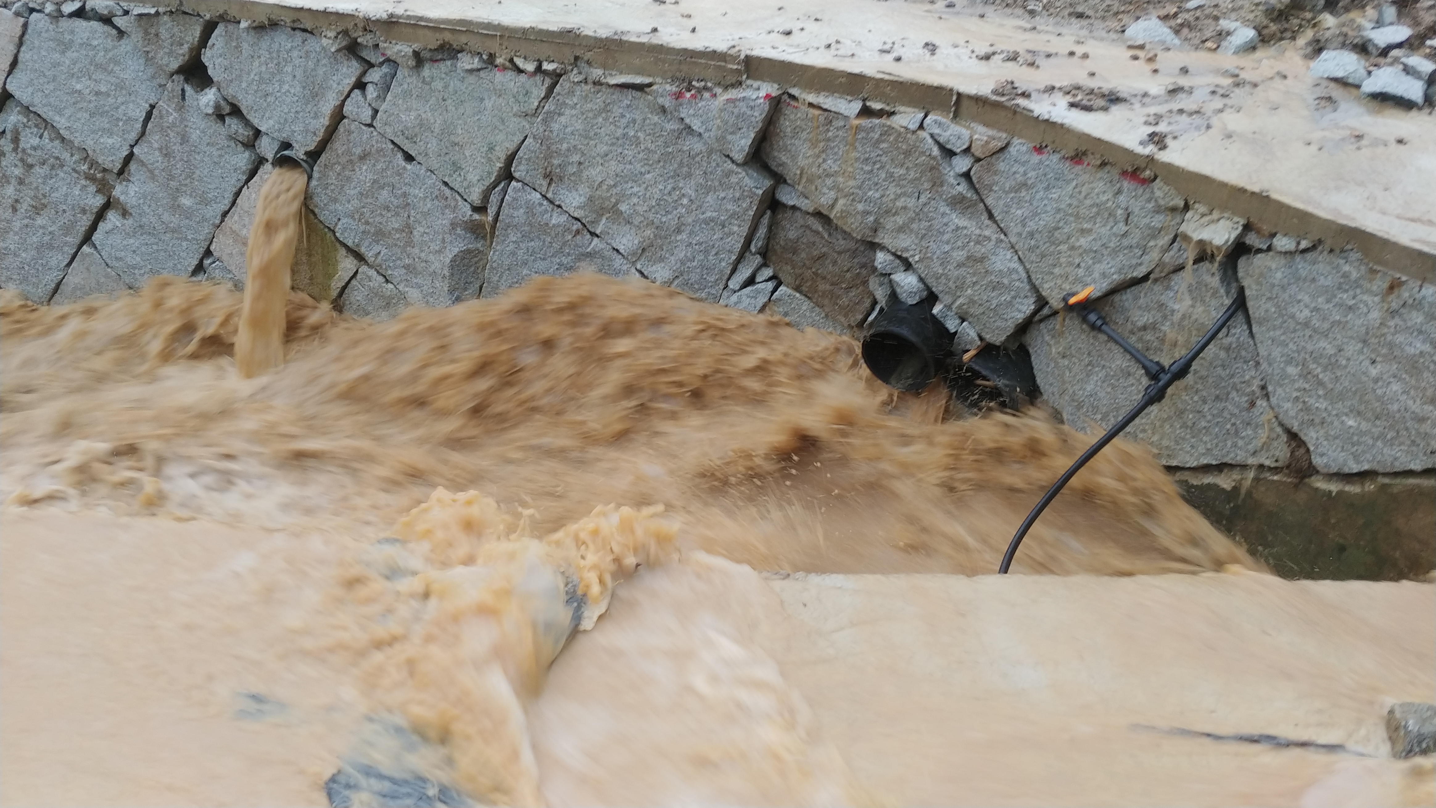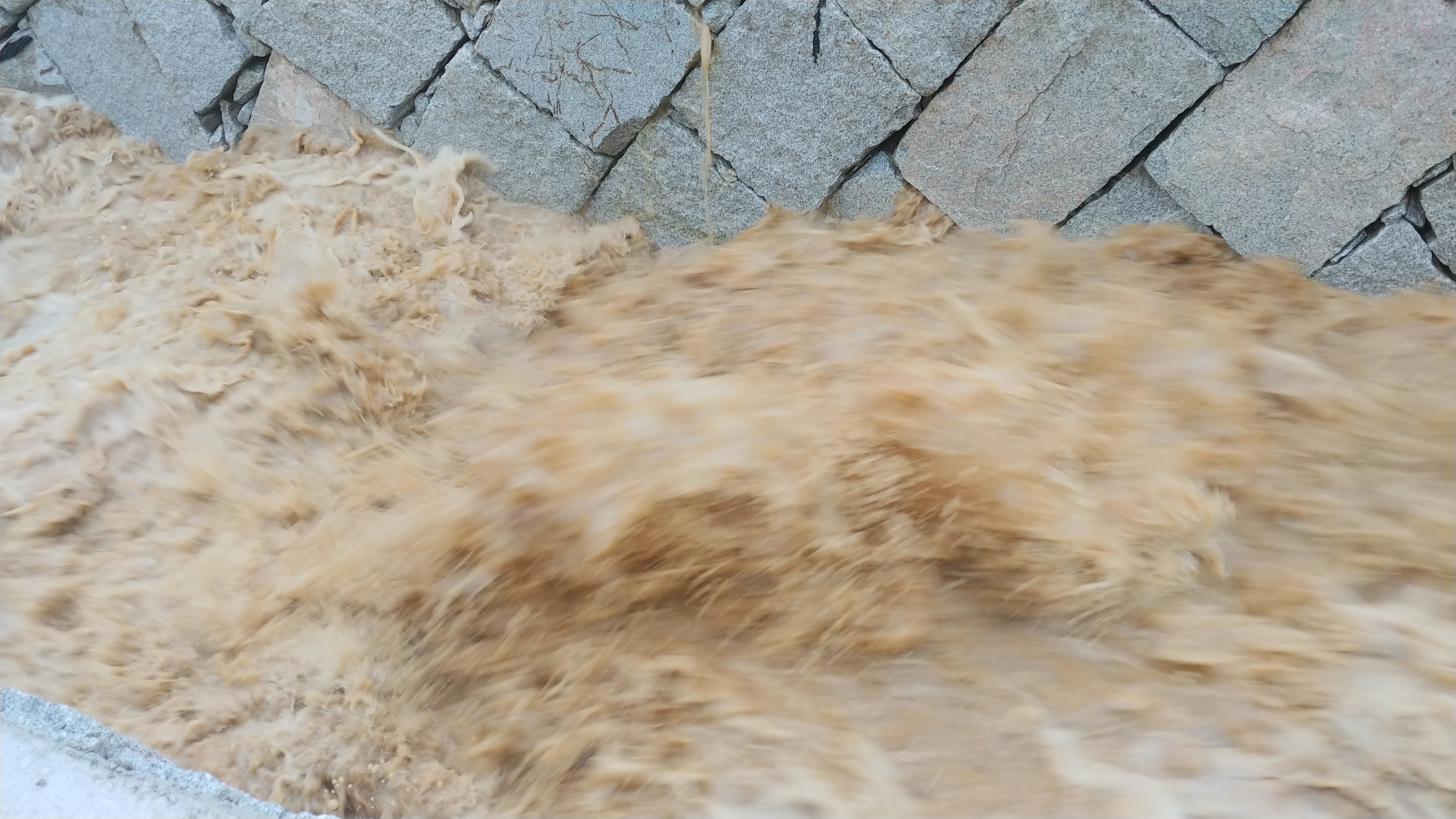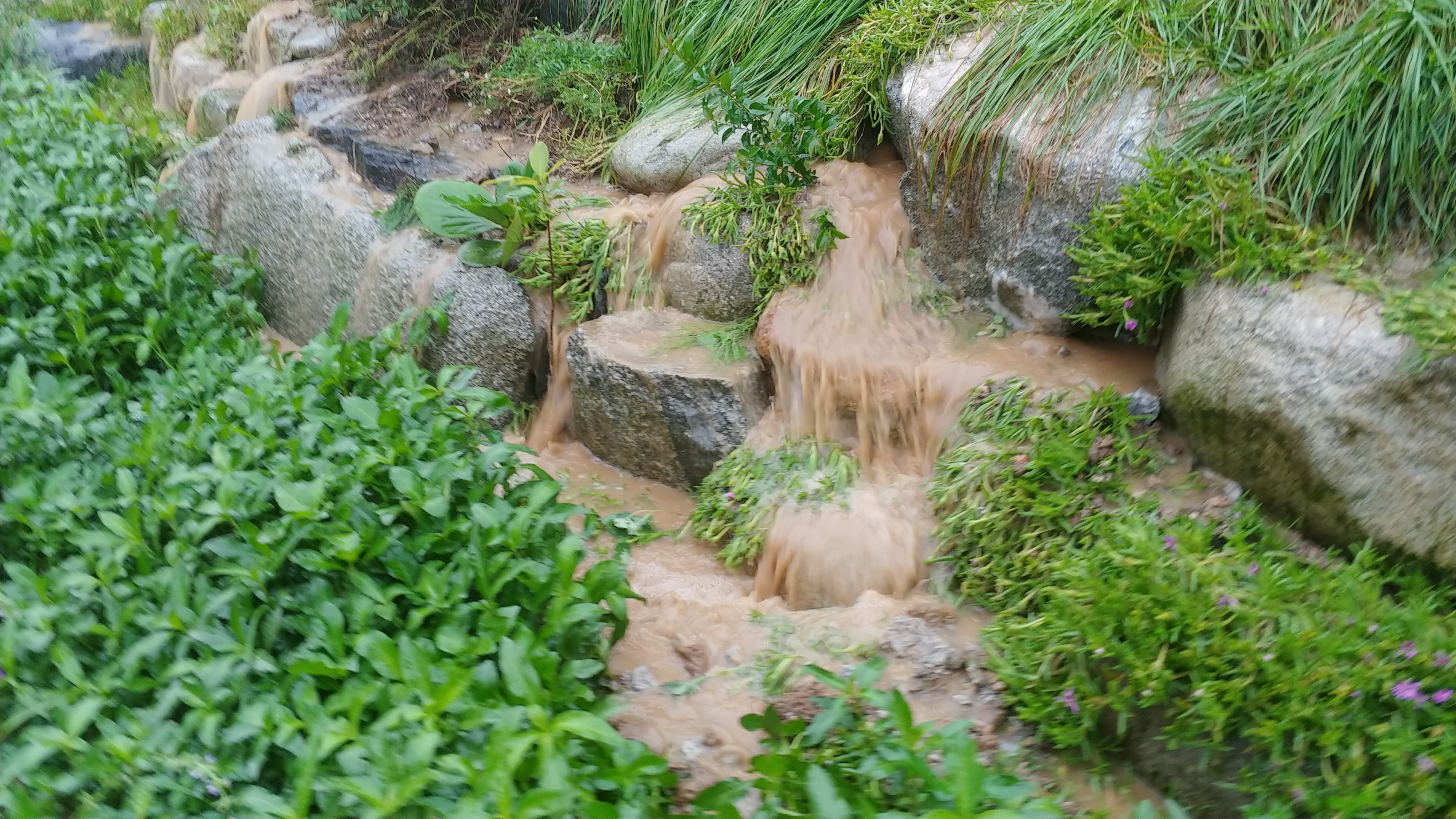도로는 흙탕물이 물살을 이루며 아래로 치닫습니다.