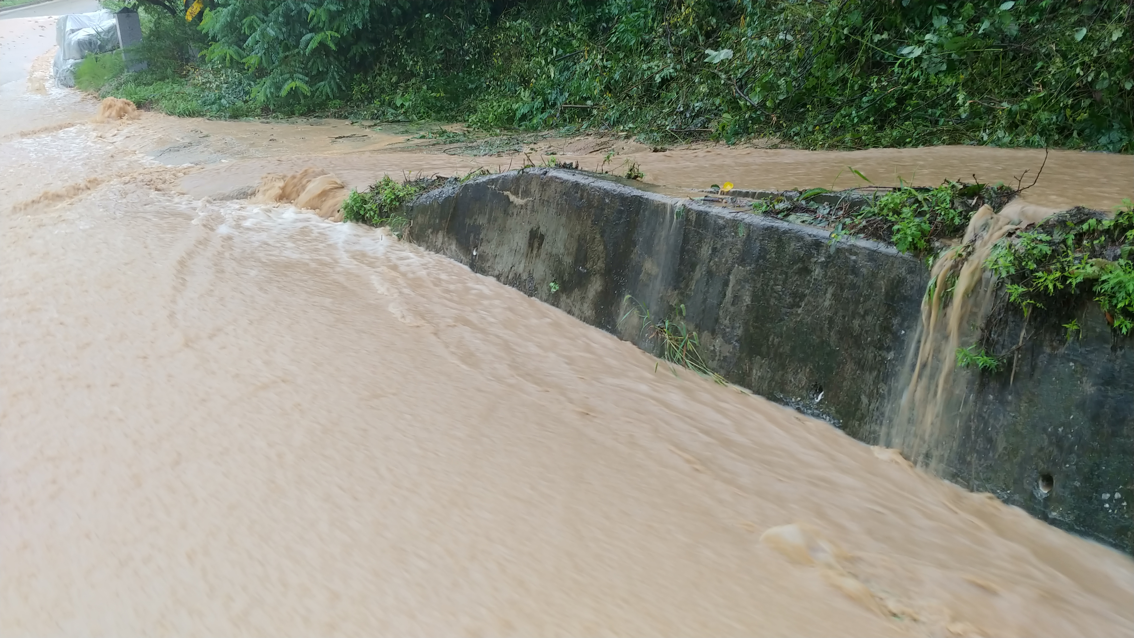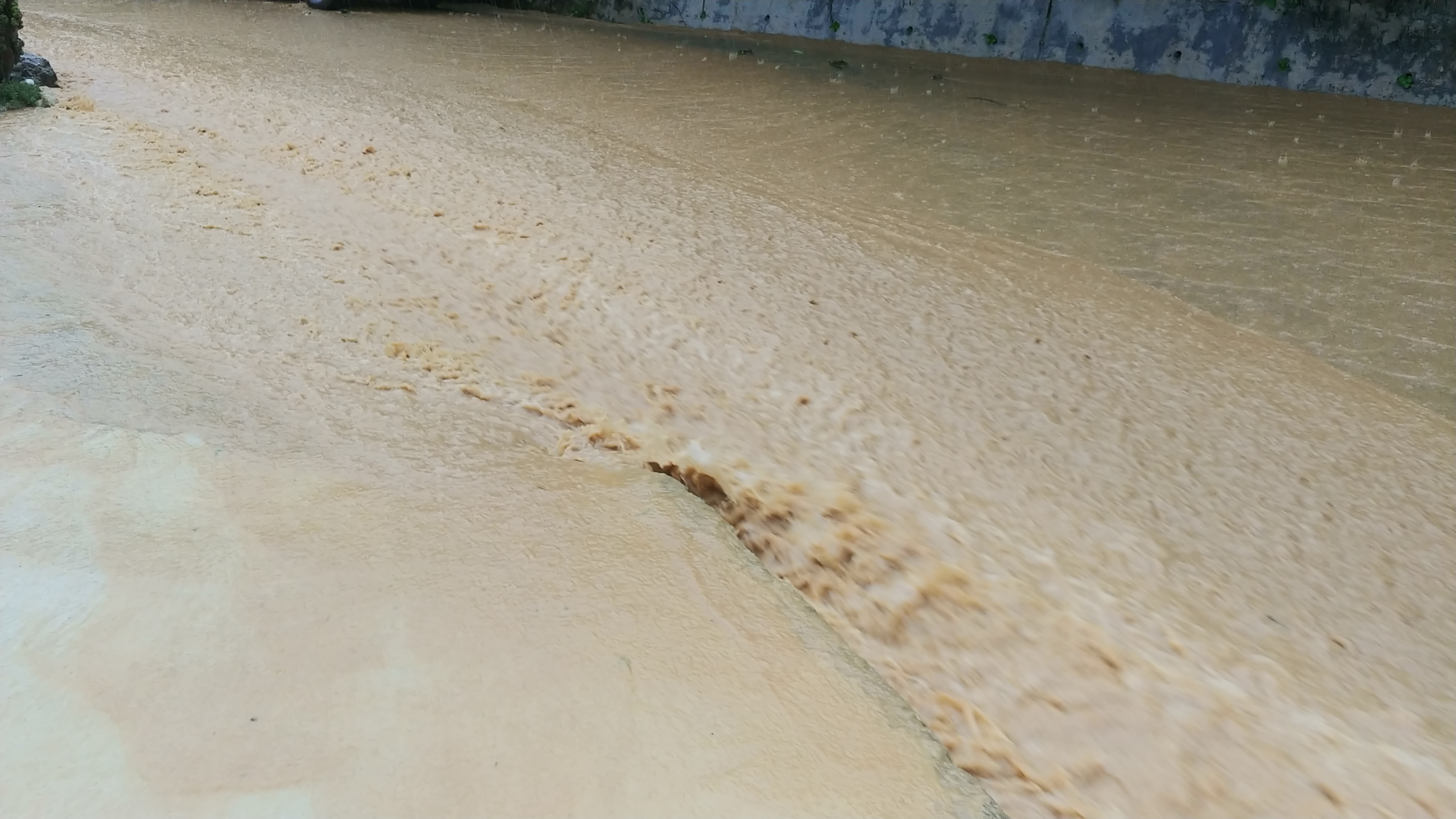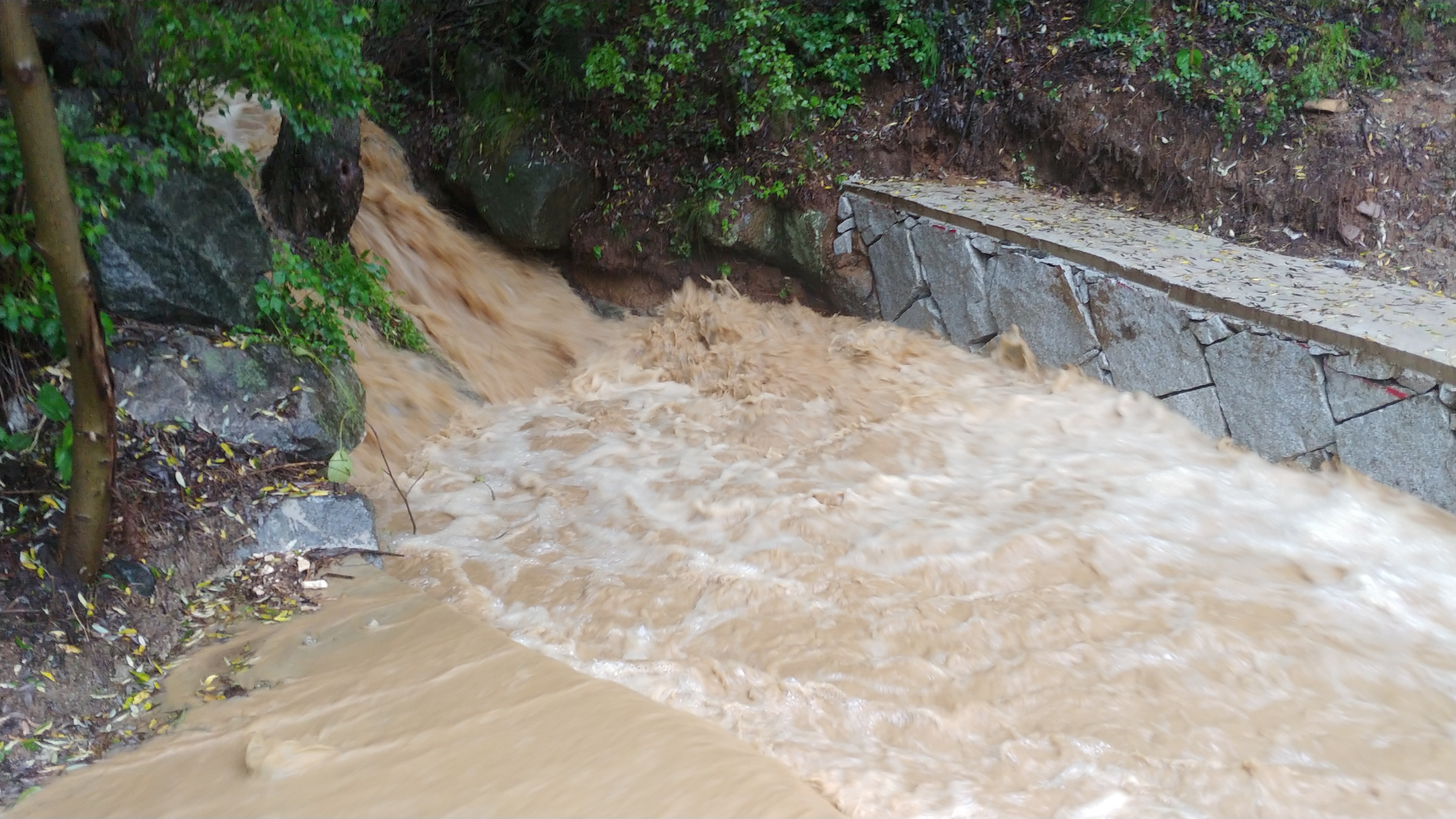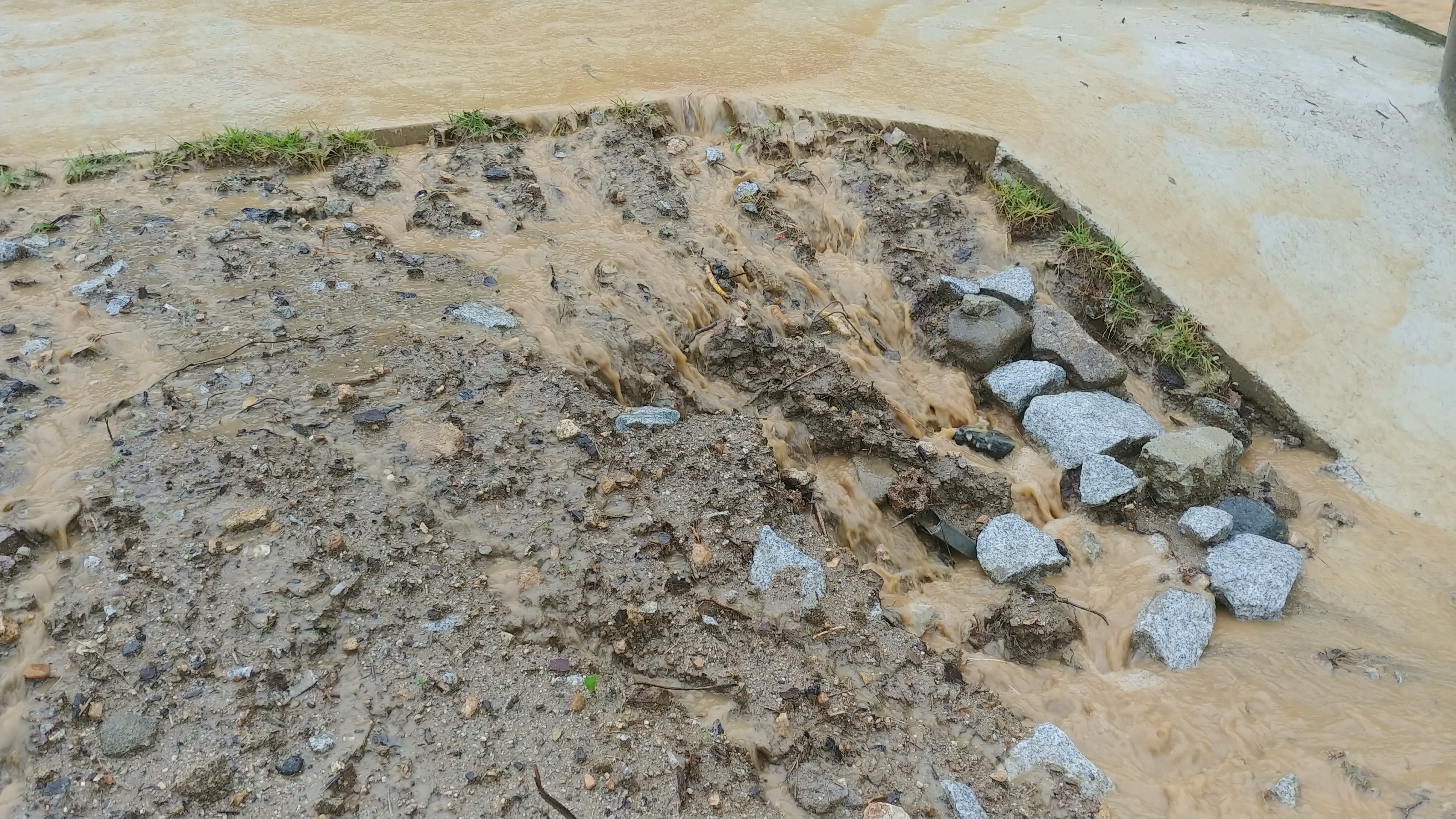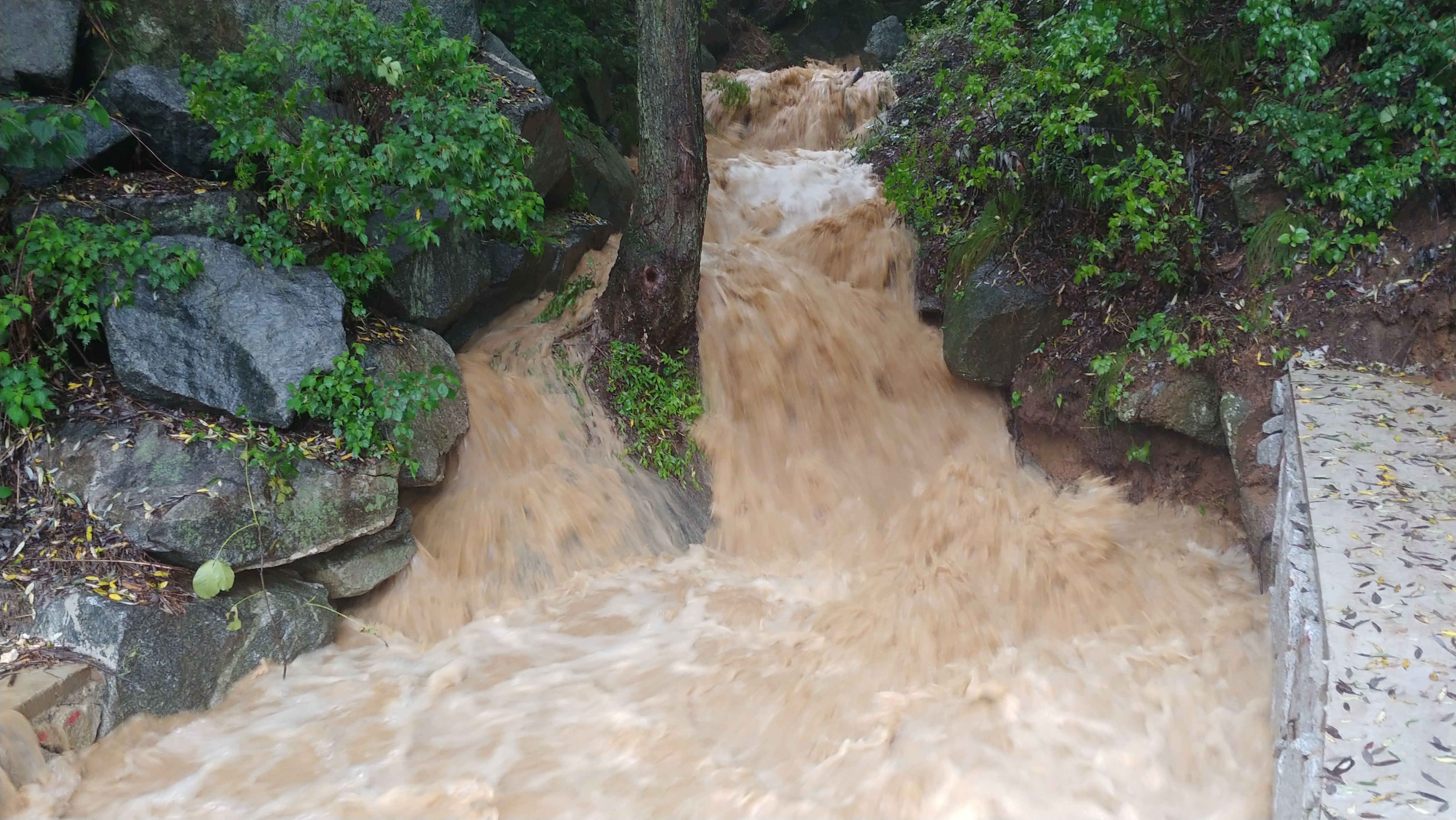 도로는 흙탕물이 물살을 이루며 아래로 치닫습니다.
