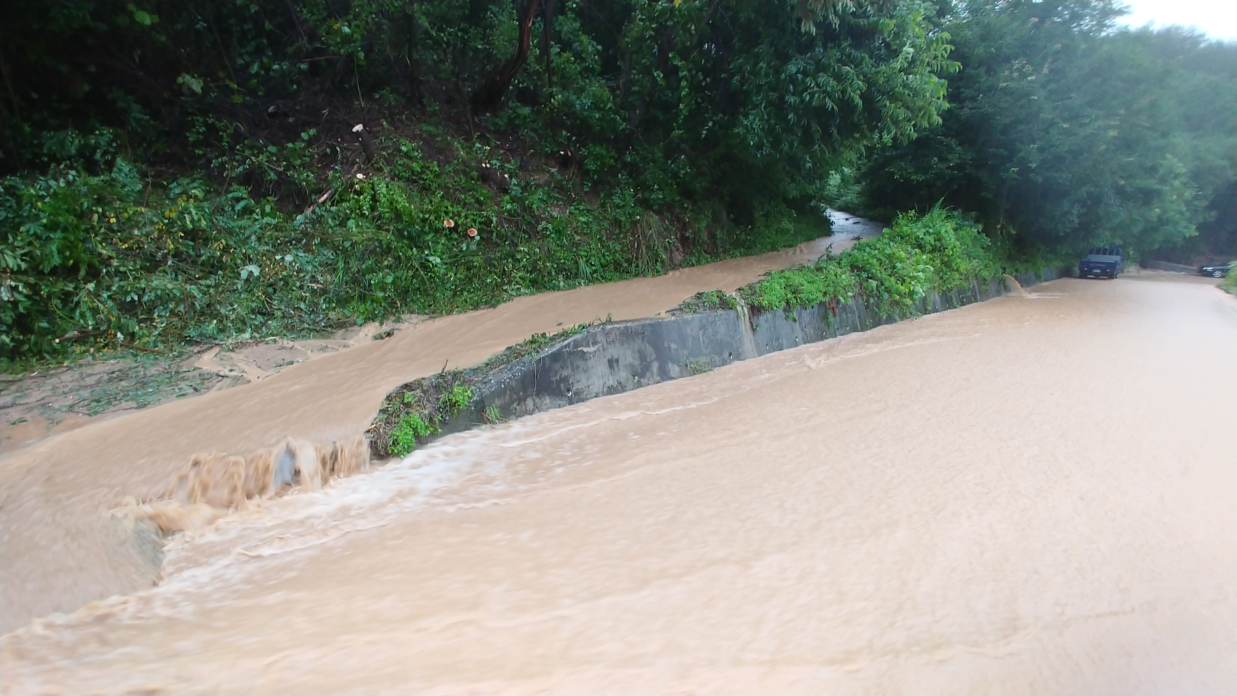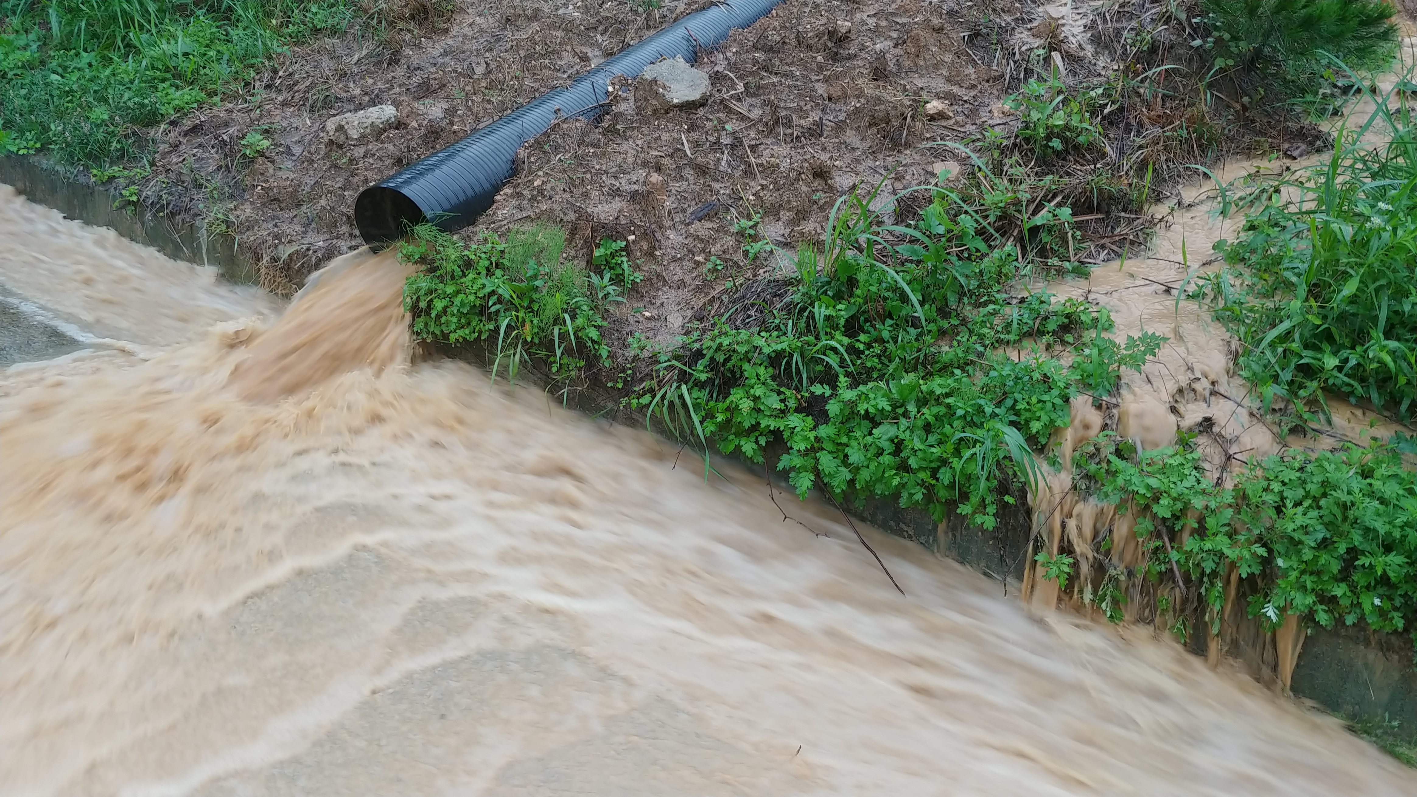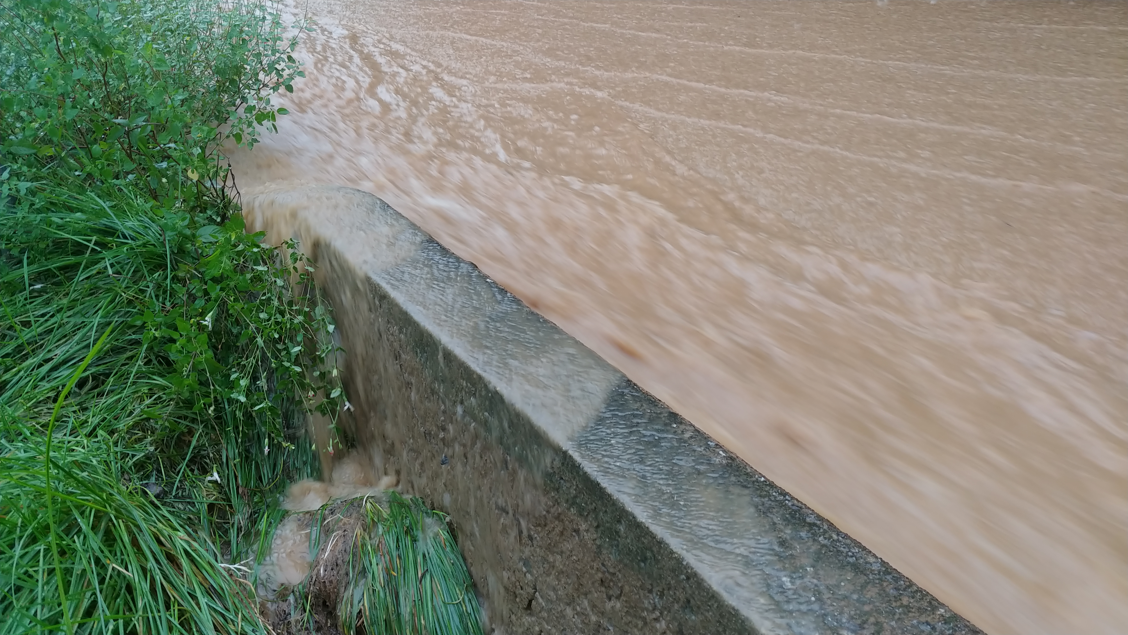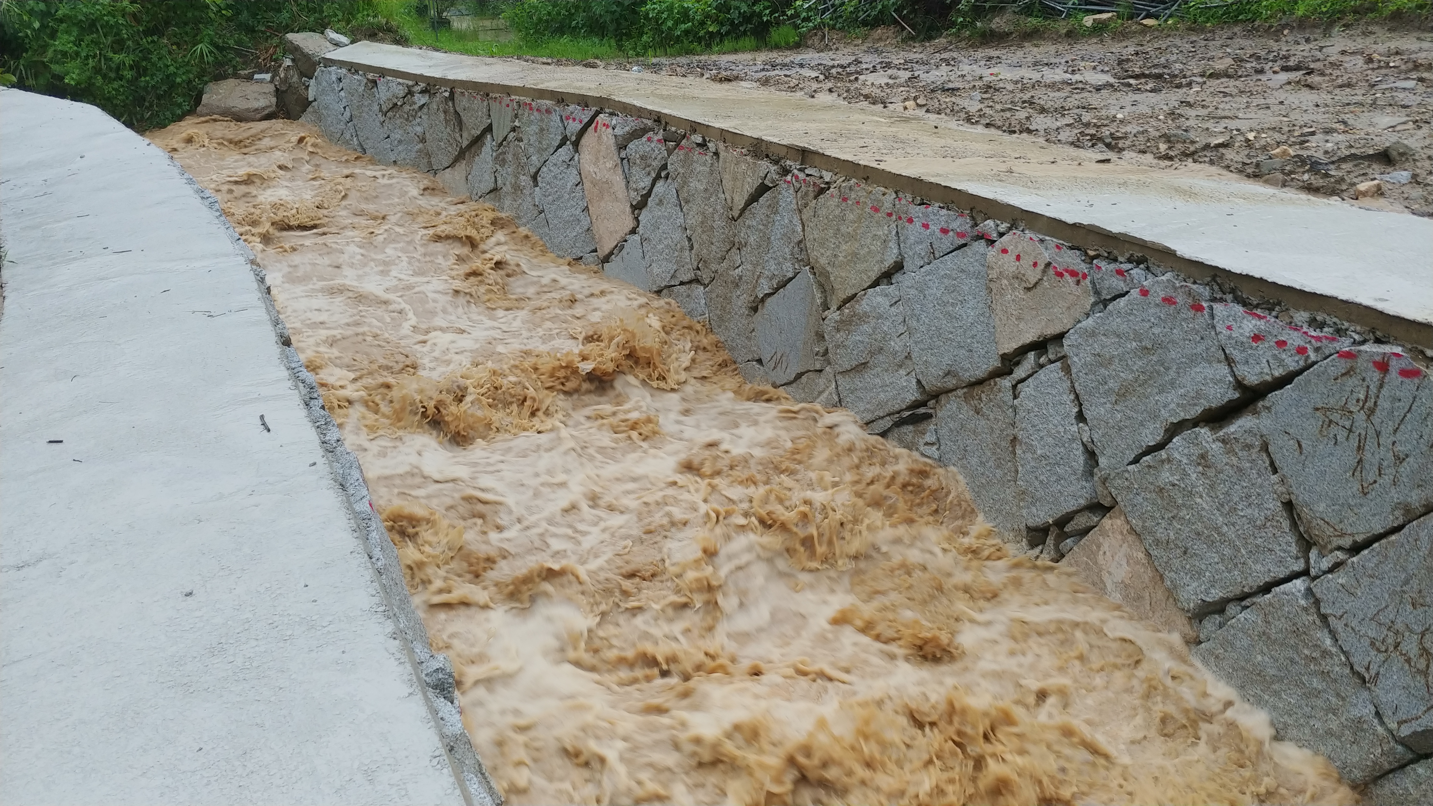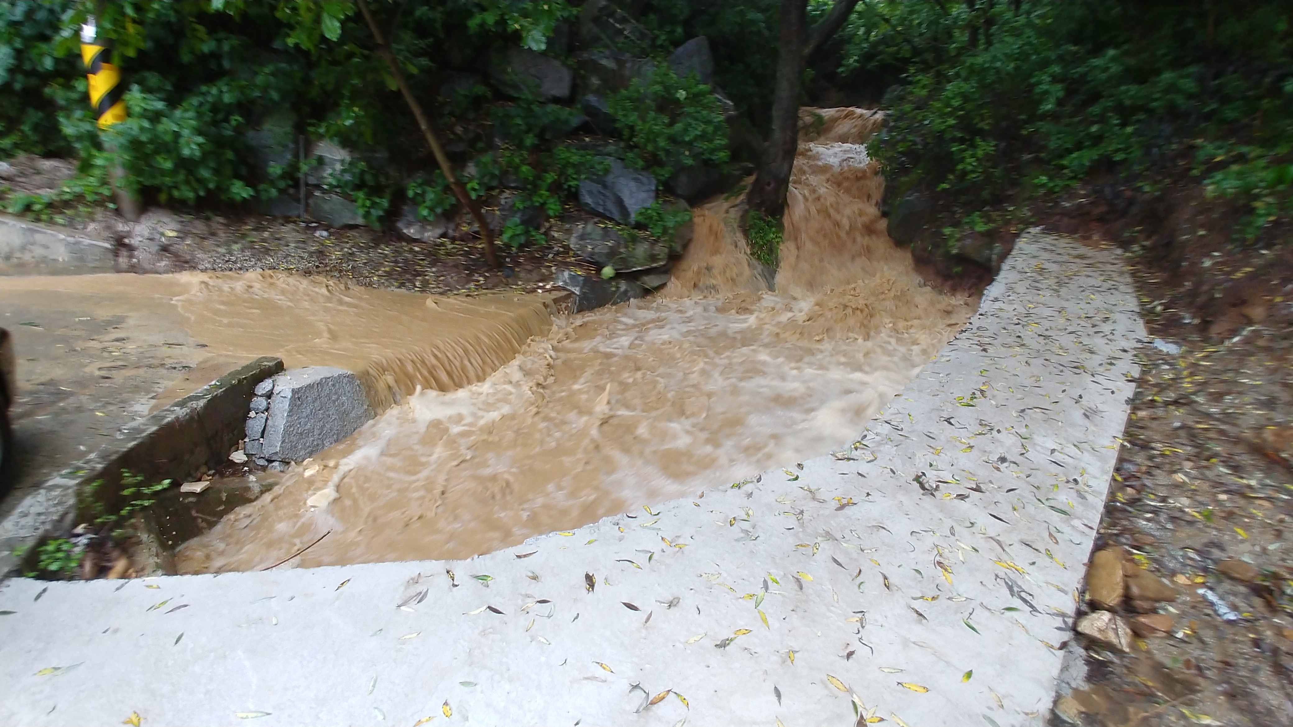 도로는 흙탕물이 물살을 이루며 아래로 치닫습니다.