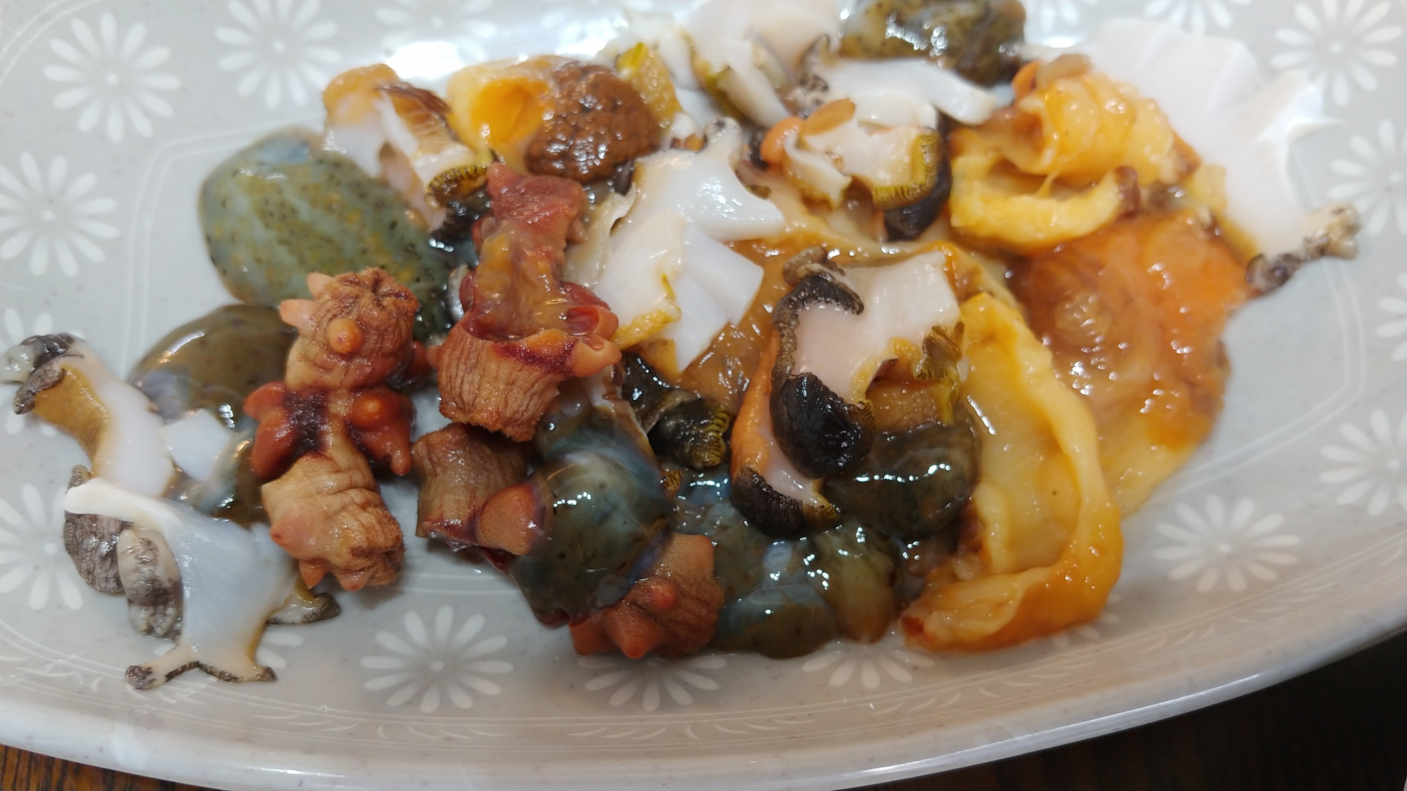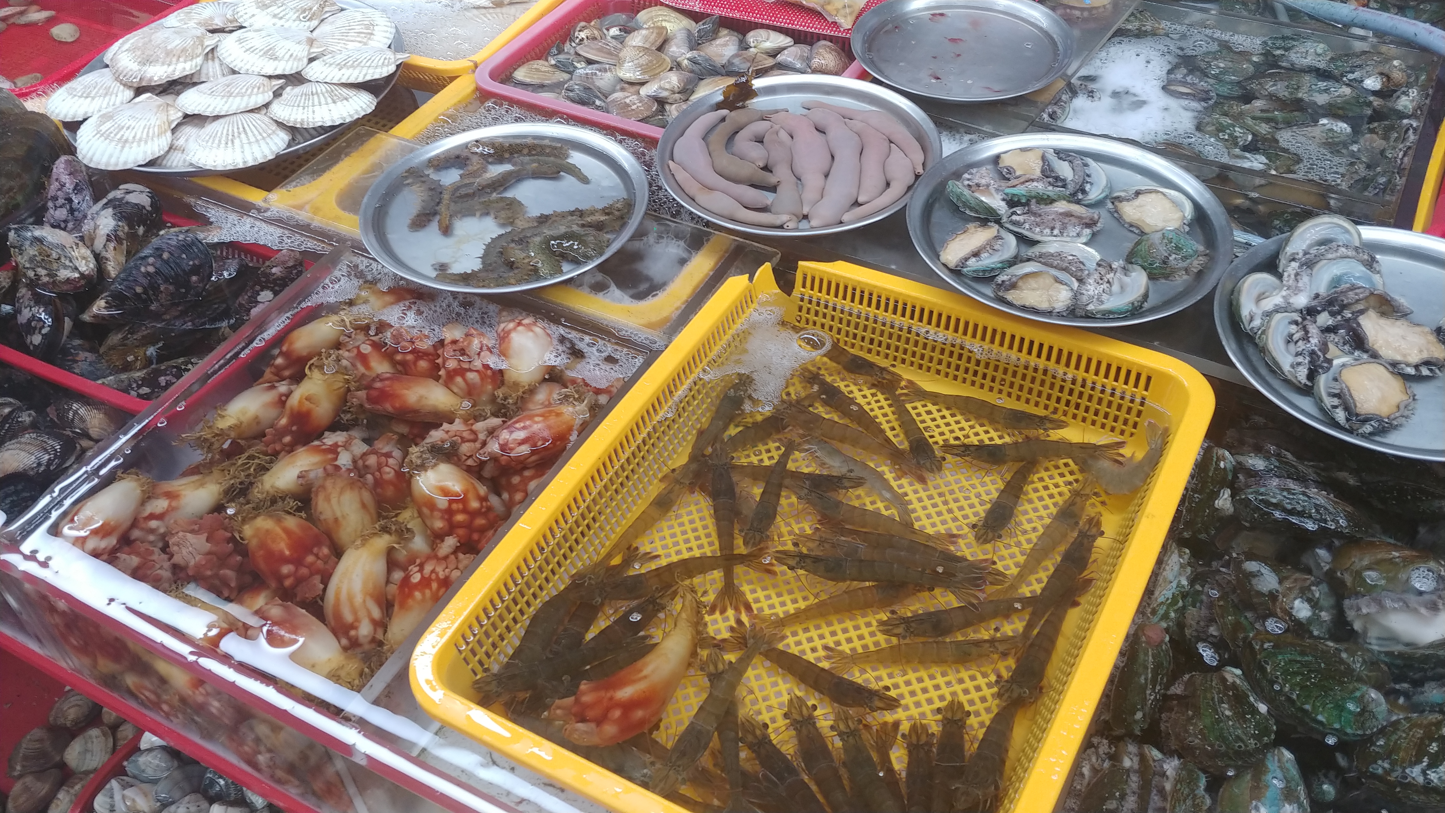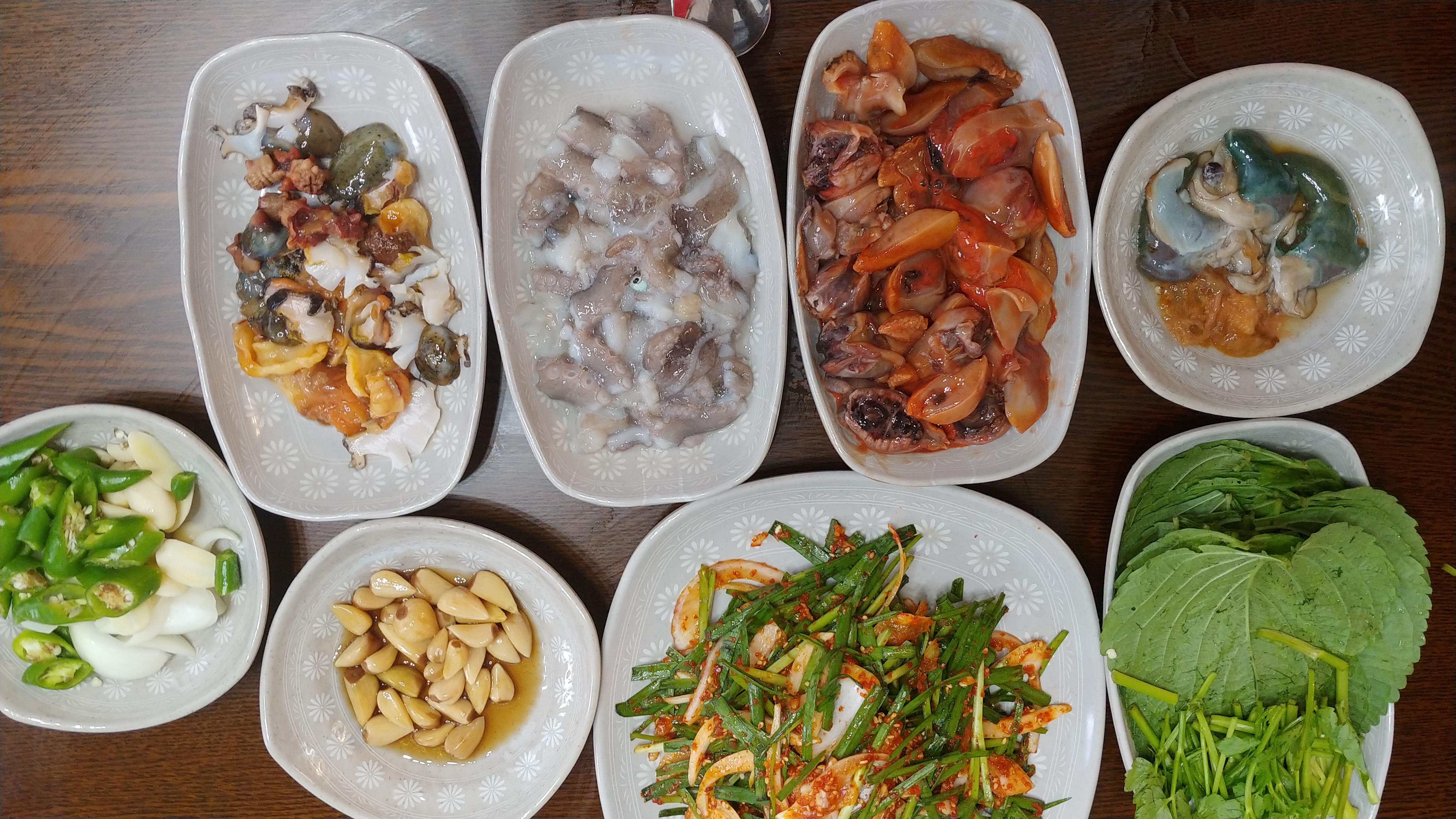 구입한 해산물은 멍게, 해삼, 전복, 소라, 낙지 그리고 피조개 등 6종류로 5만 원어치를 샀습니다.