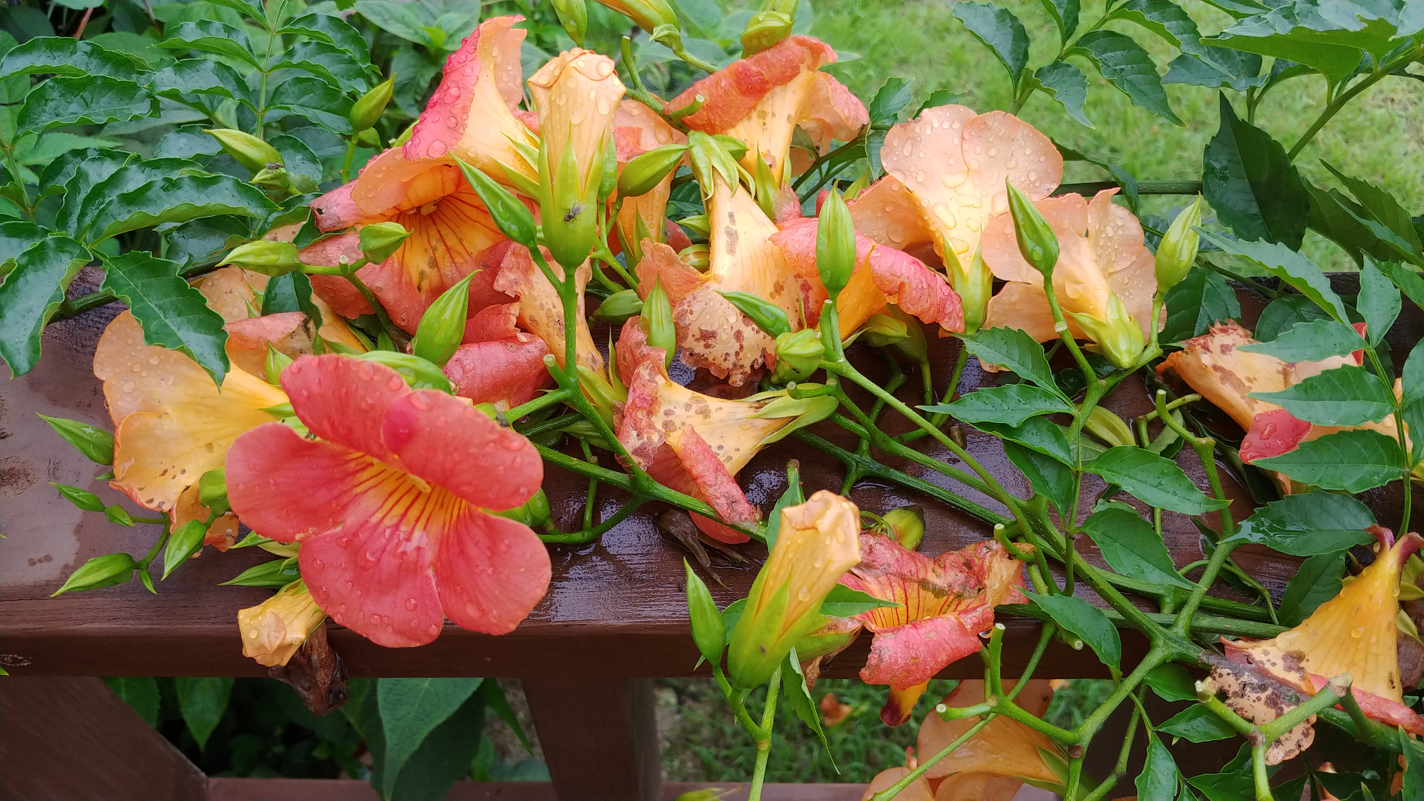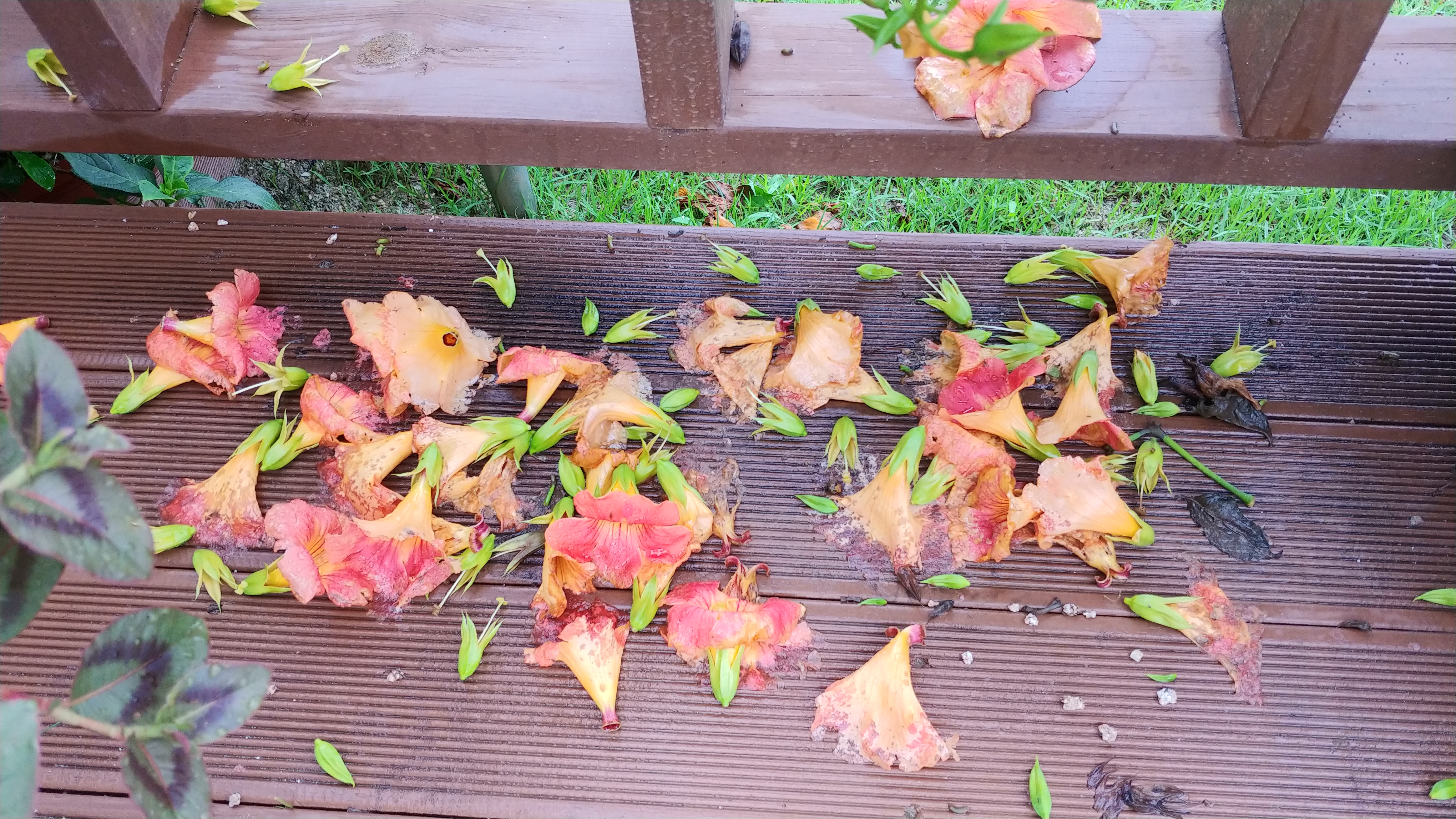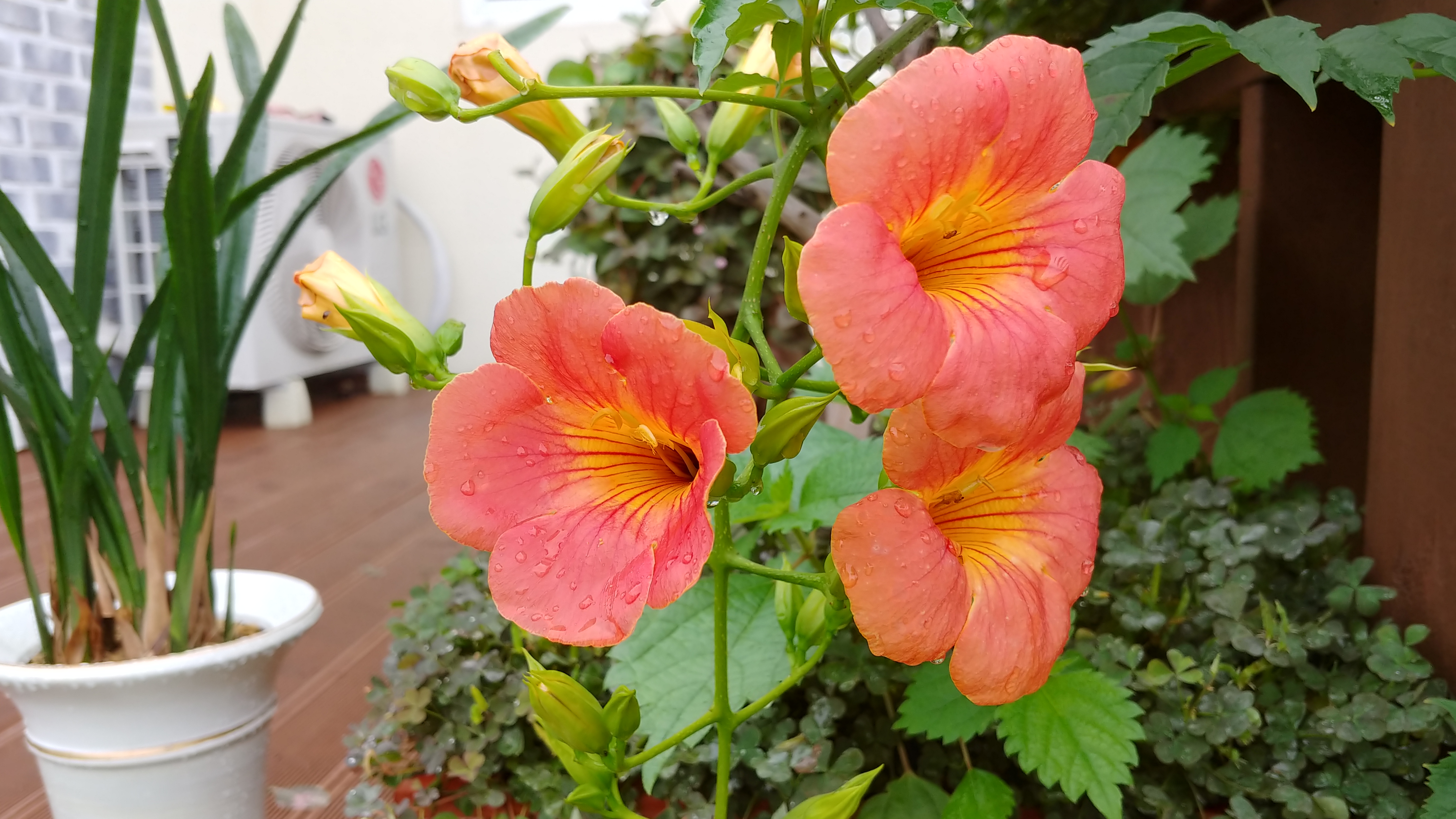 능소화는 주황색보다는 노랑이 많이 들어간 붉은 색에 가깝다.