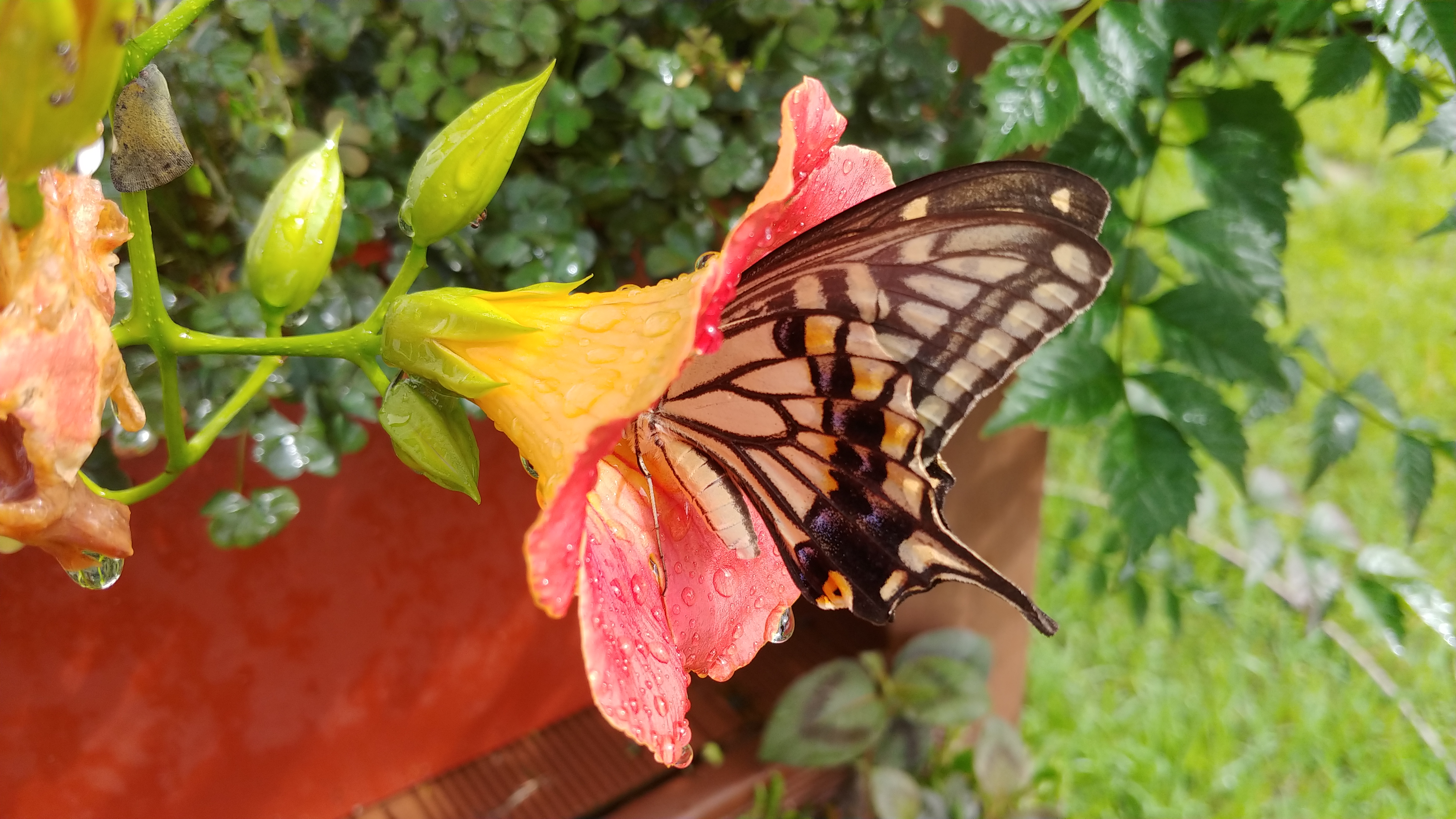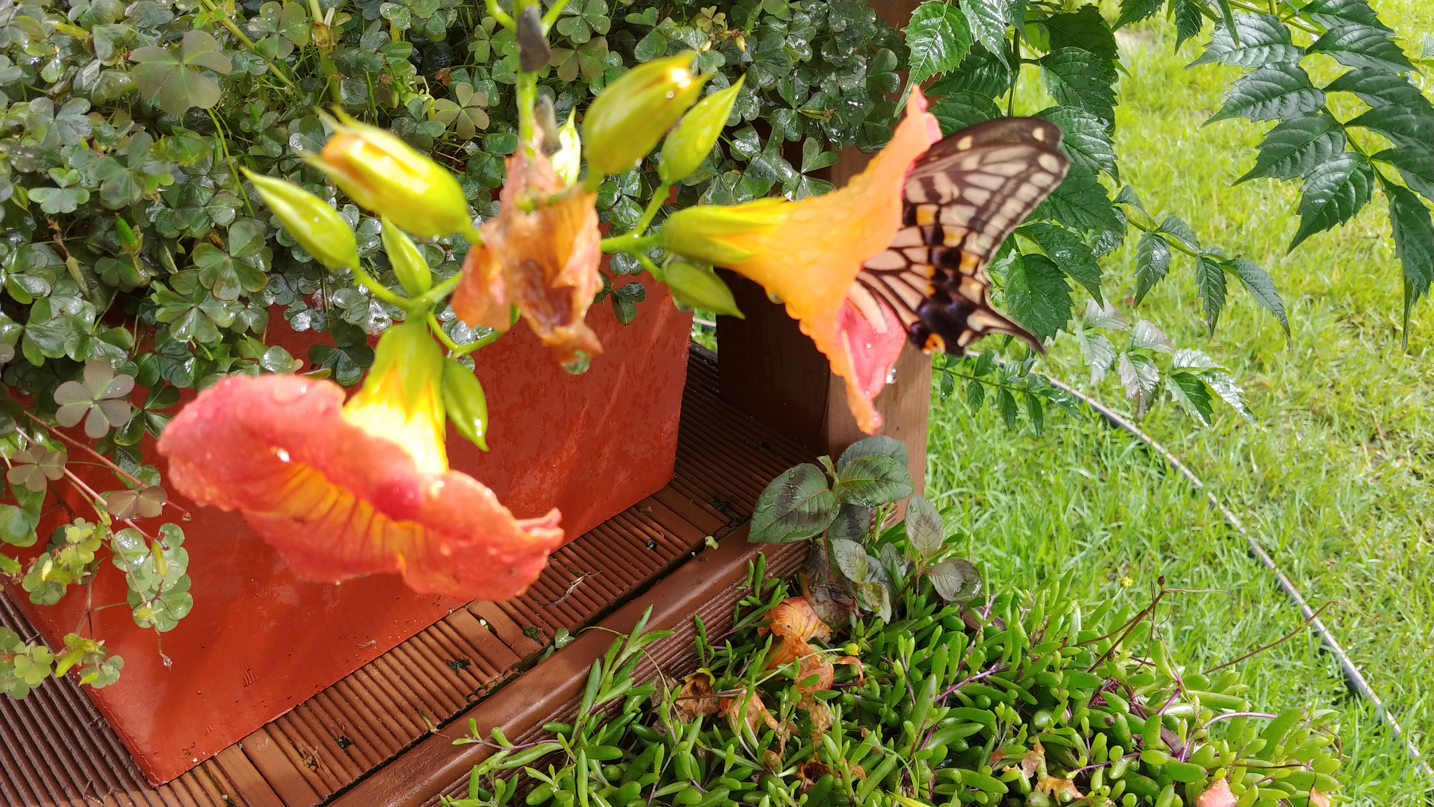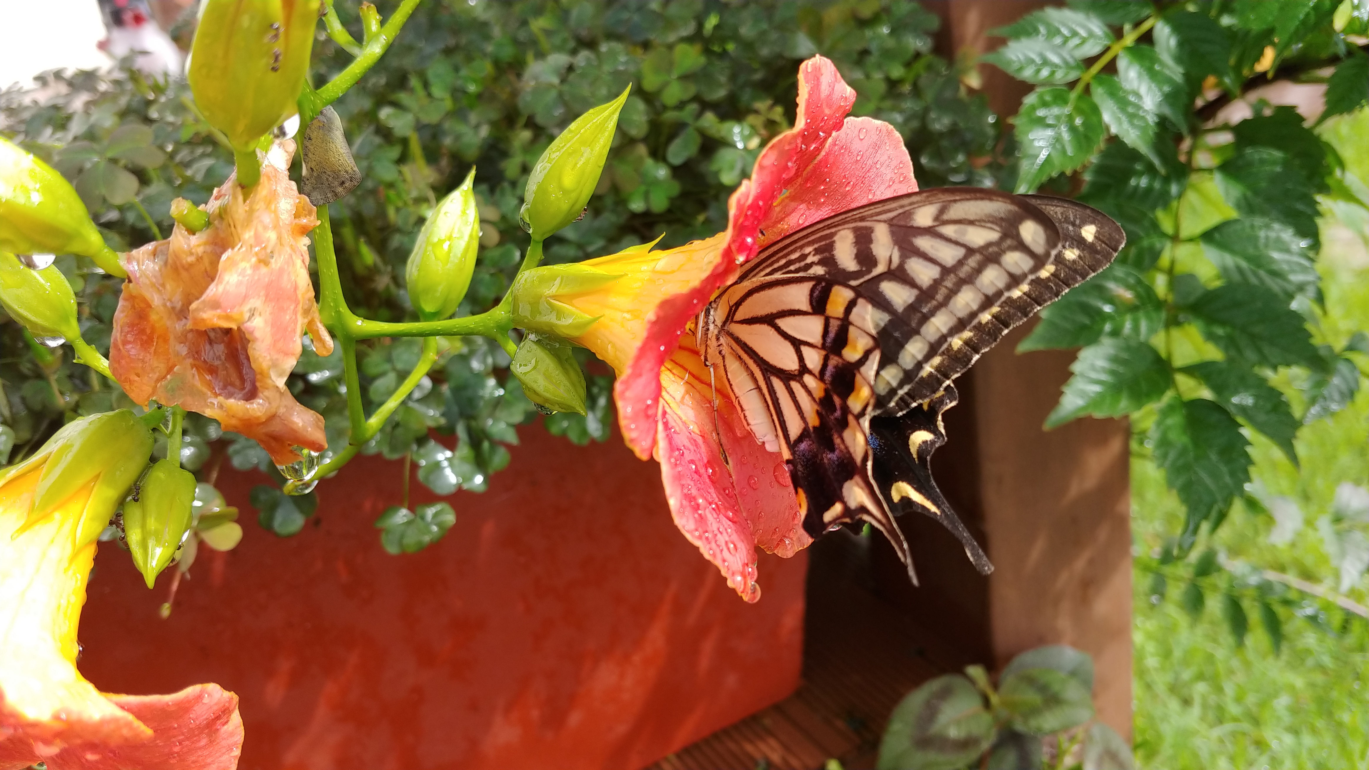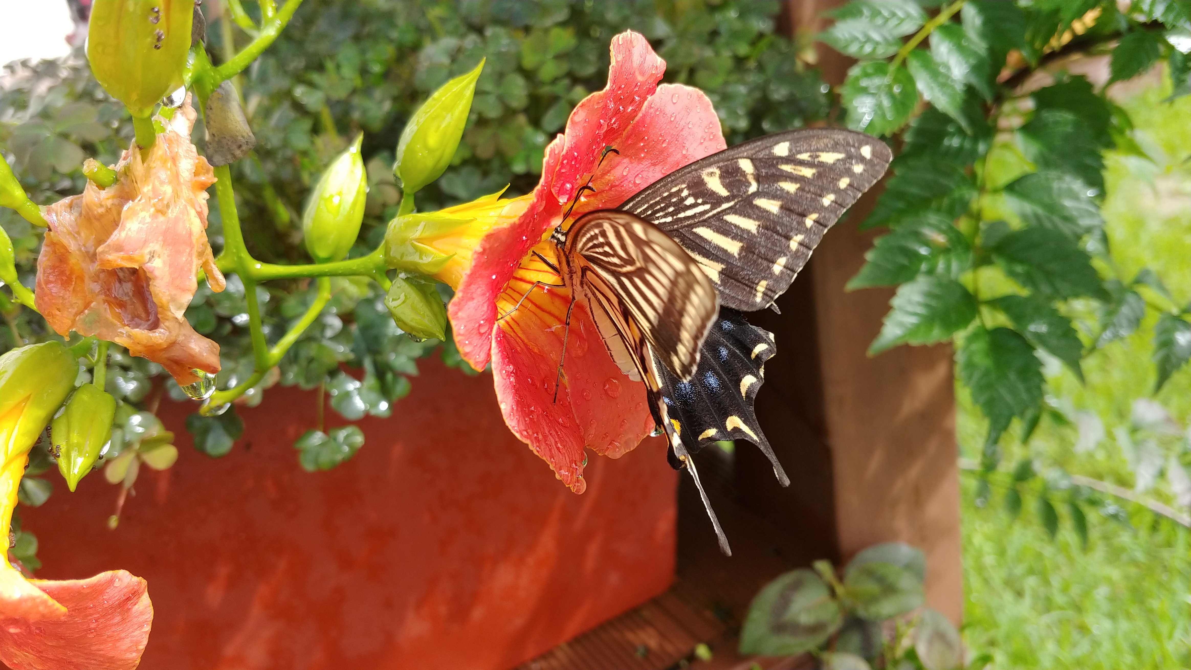 능소화에 큰 나비 한 마리가 꿀을 따고 있다.