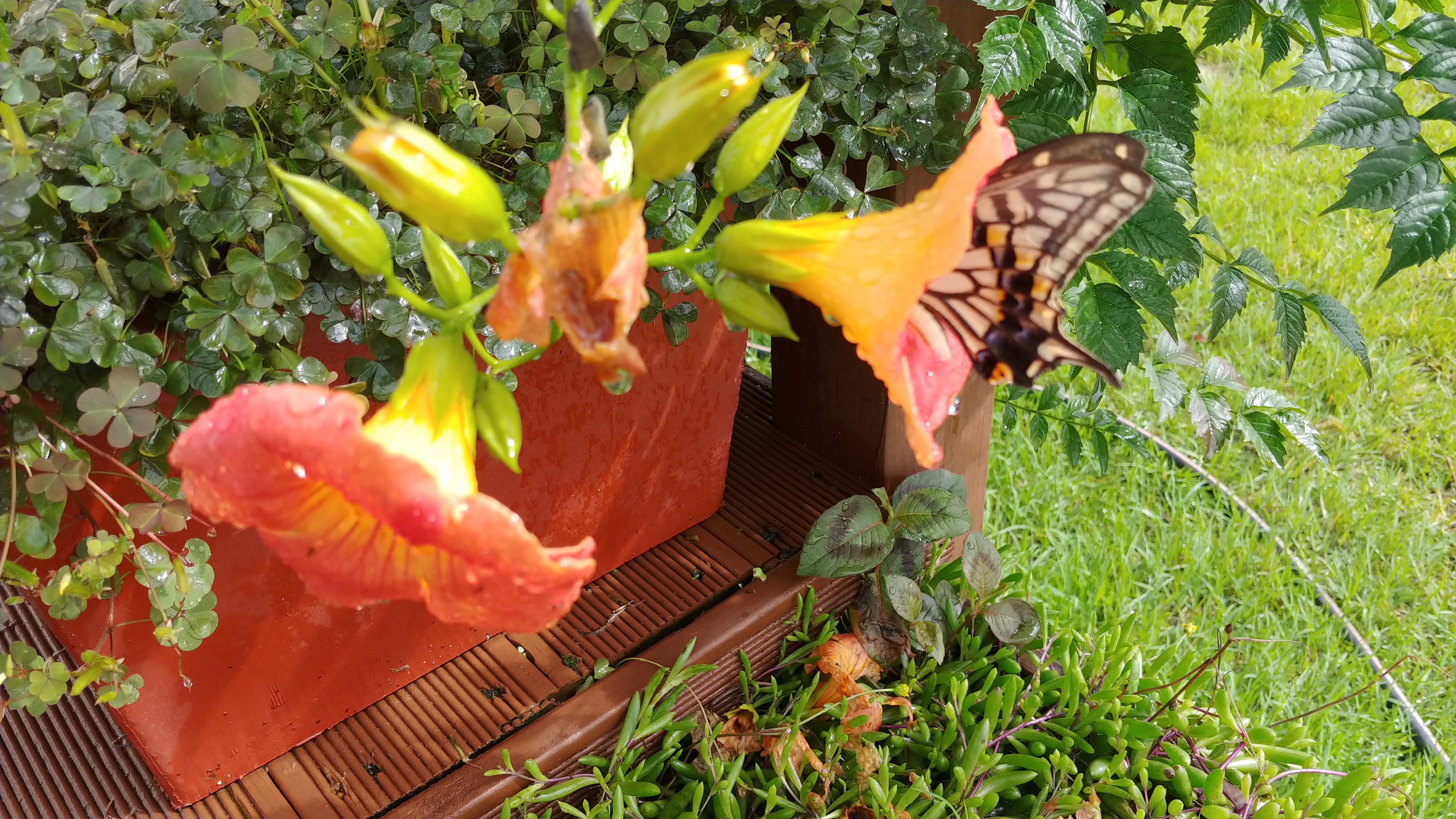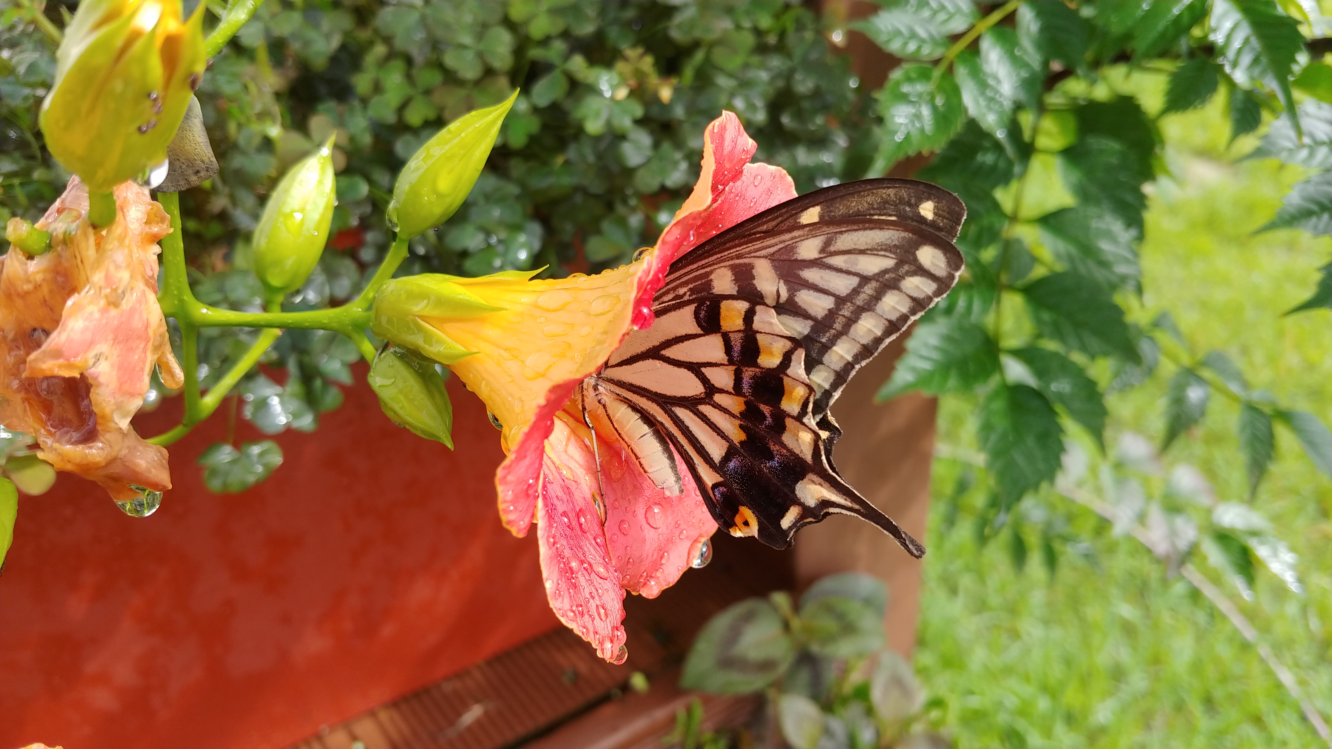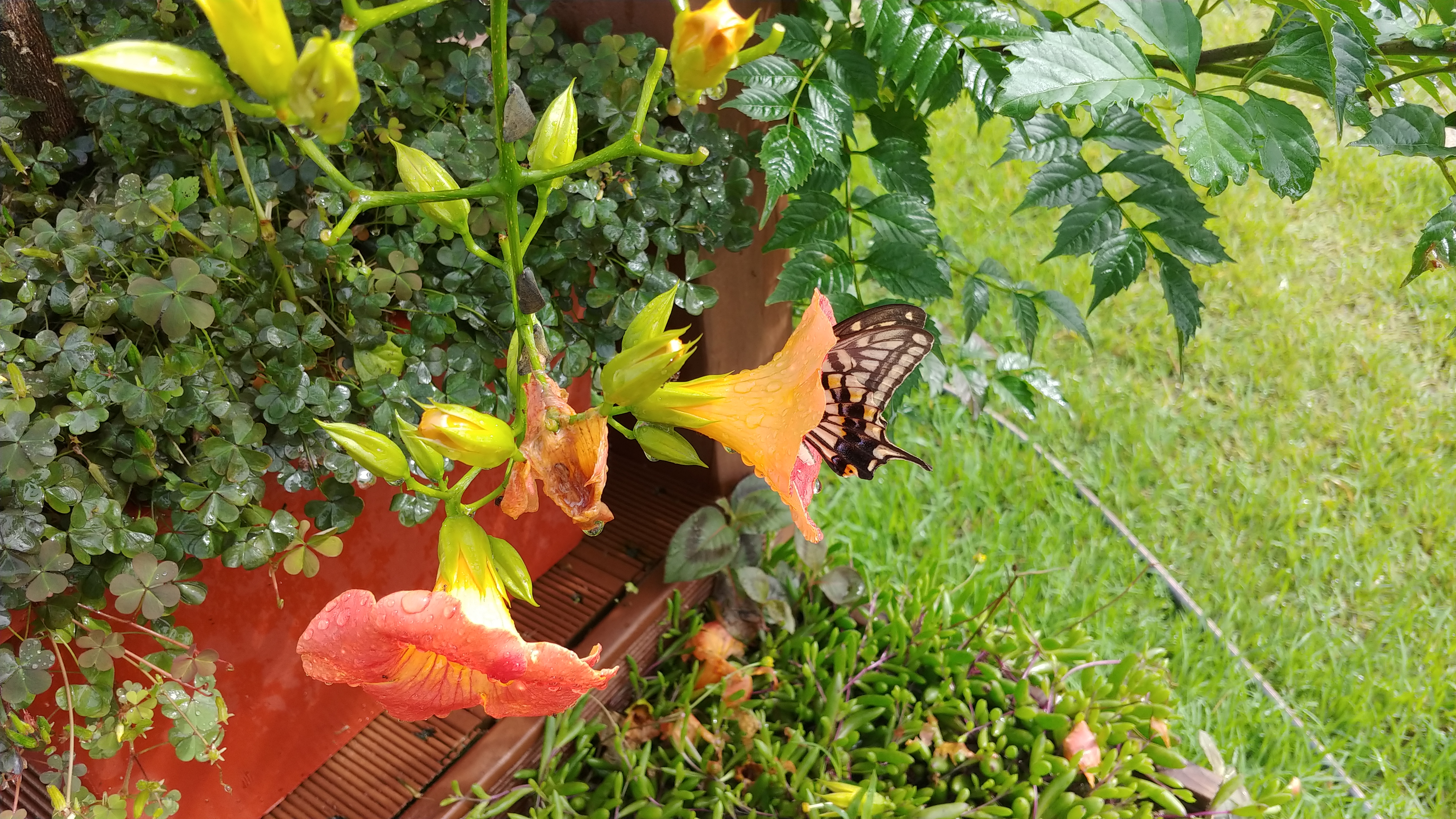 능소화에 큰 나비 한 마리가 꿀을 따고 있다.