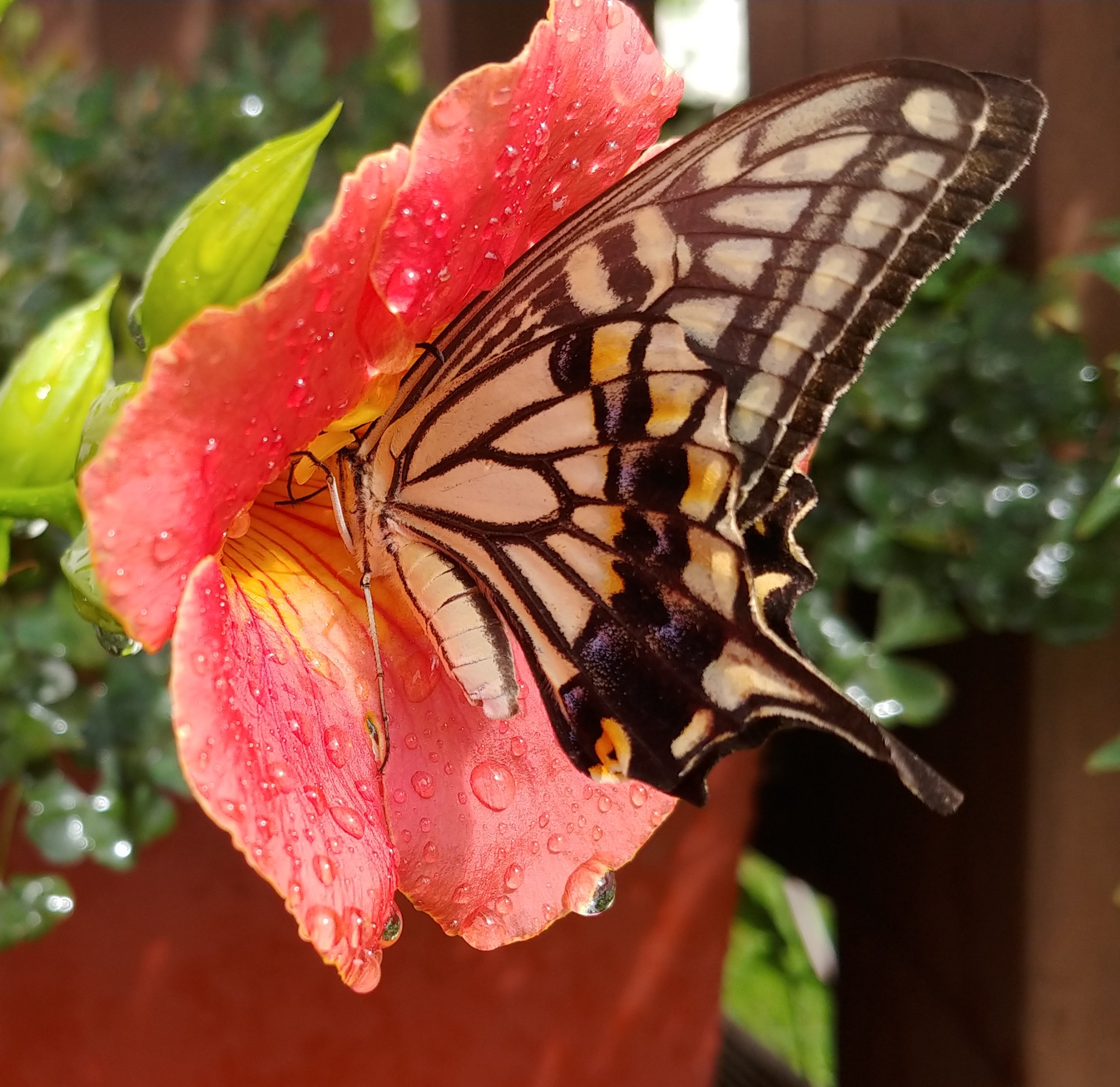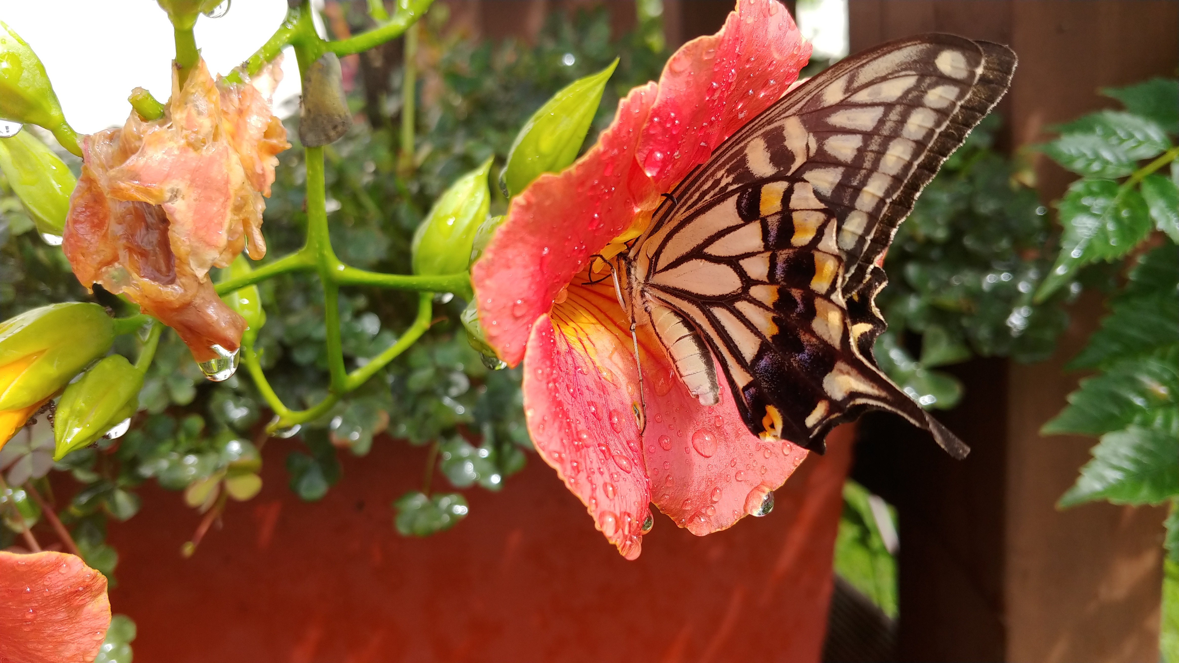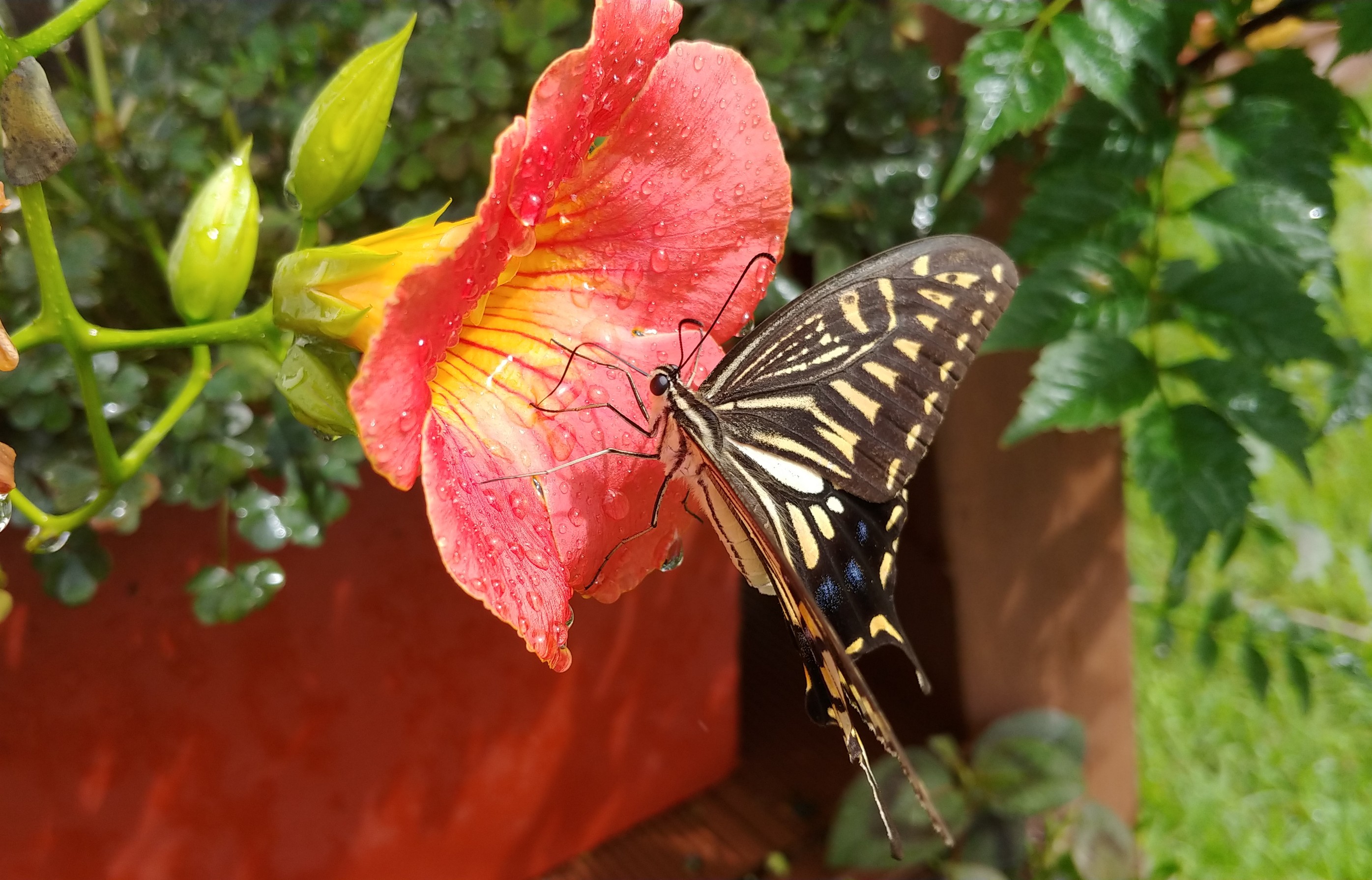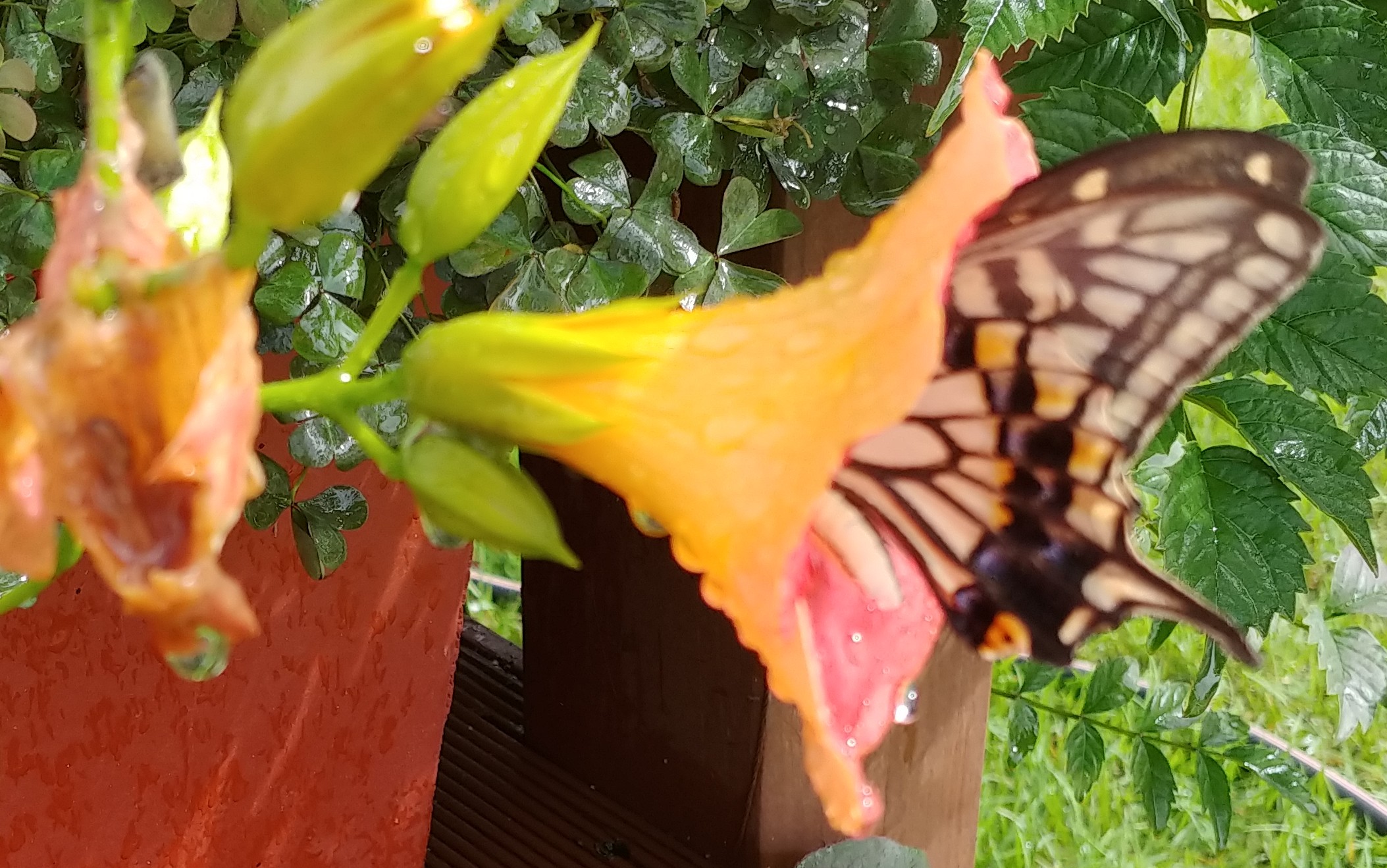 능소화에 큰 나비 한 마리가 꿀을 따고 있다.