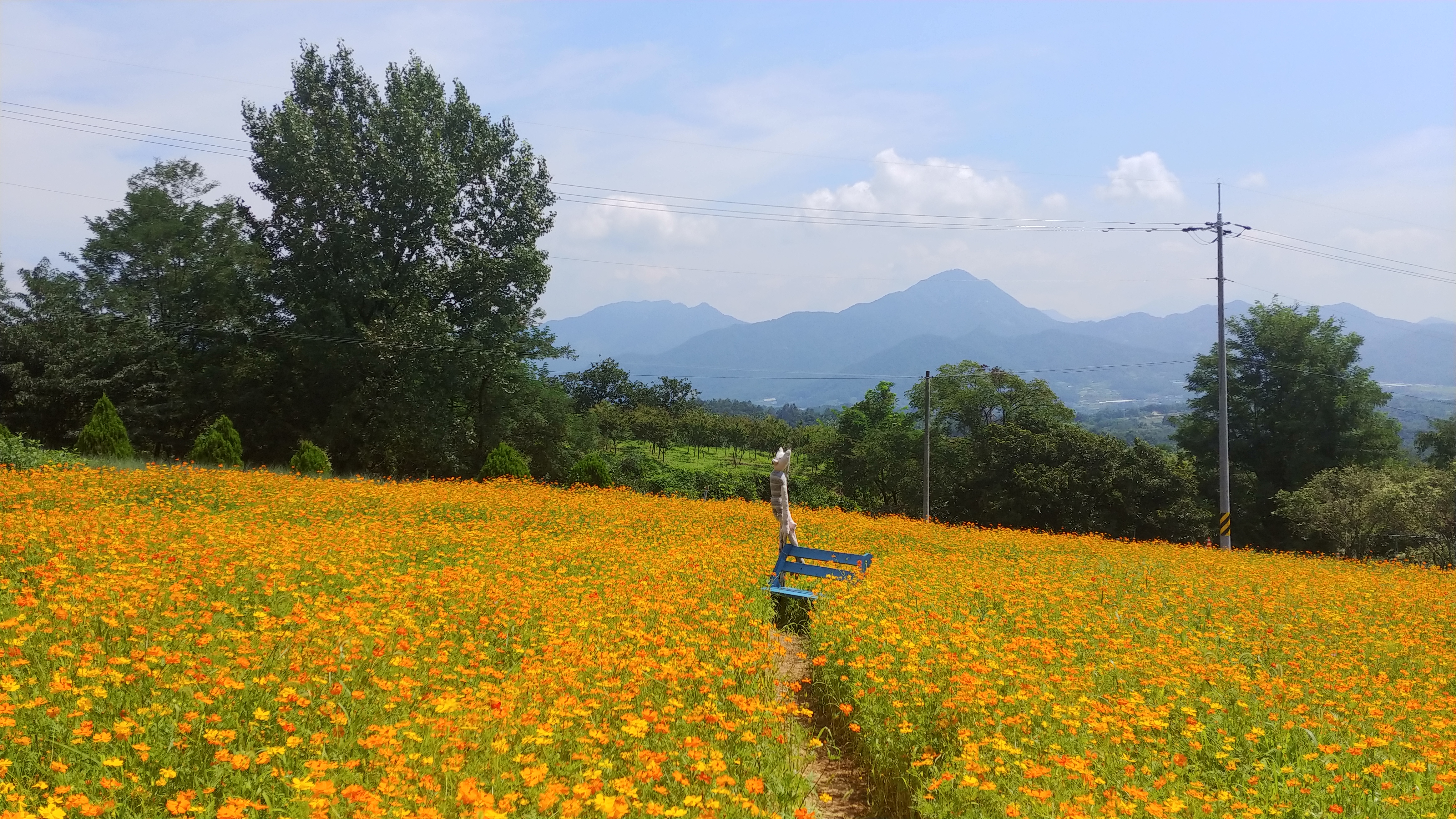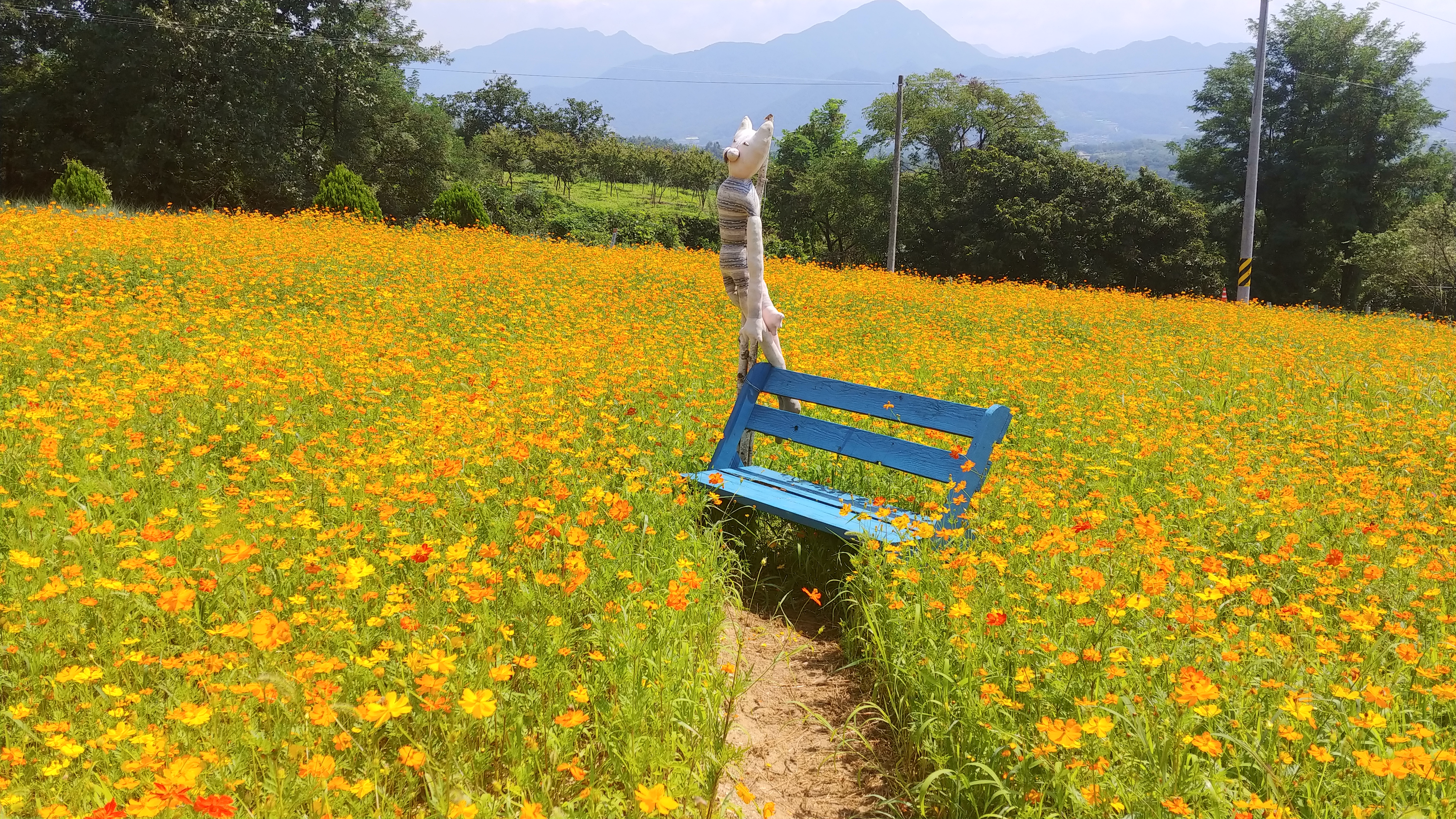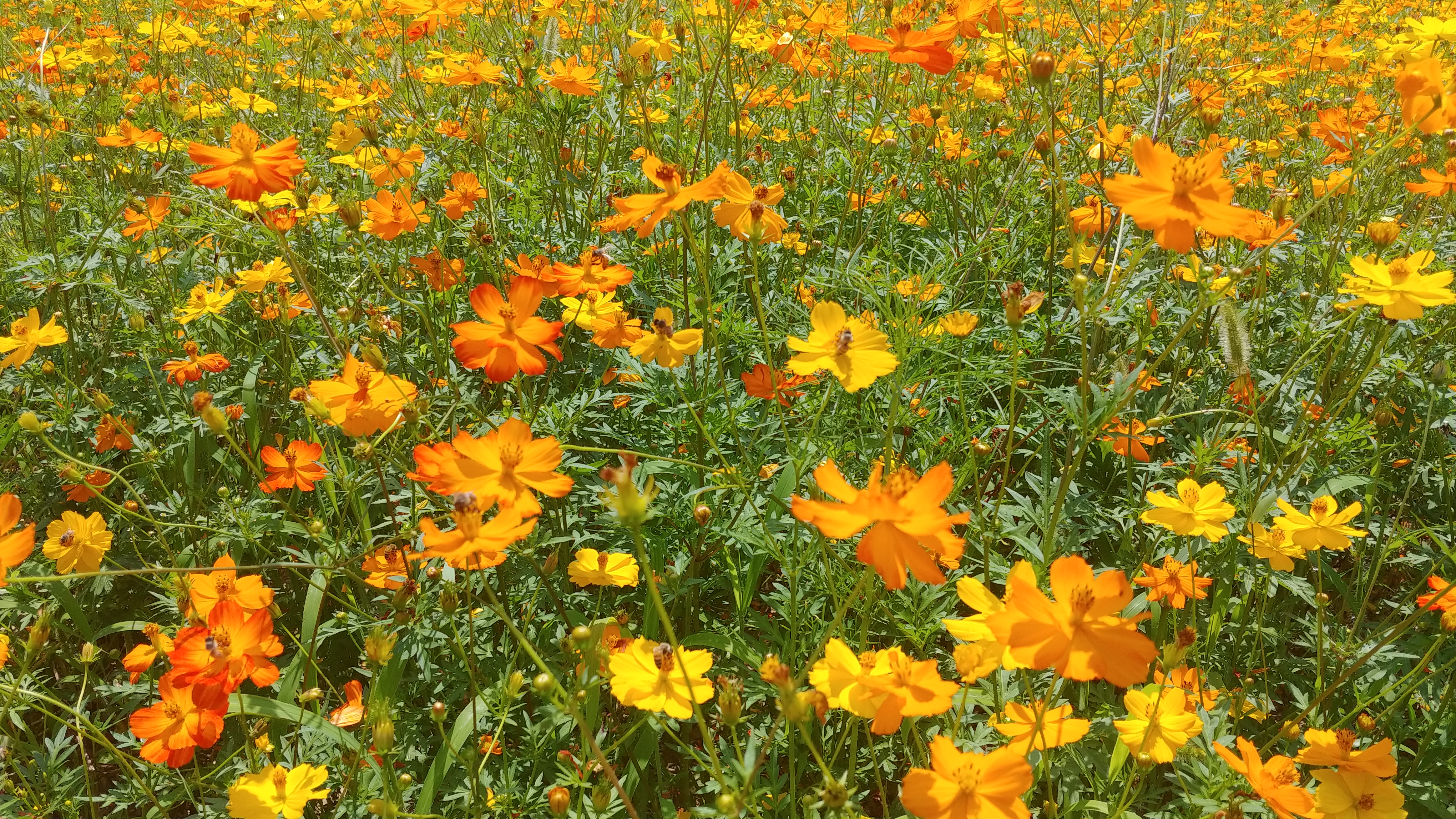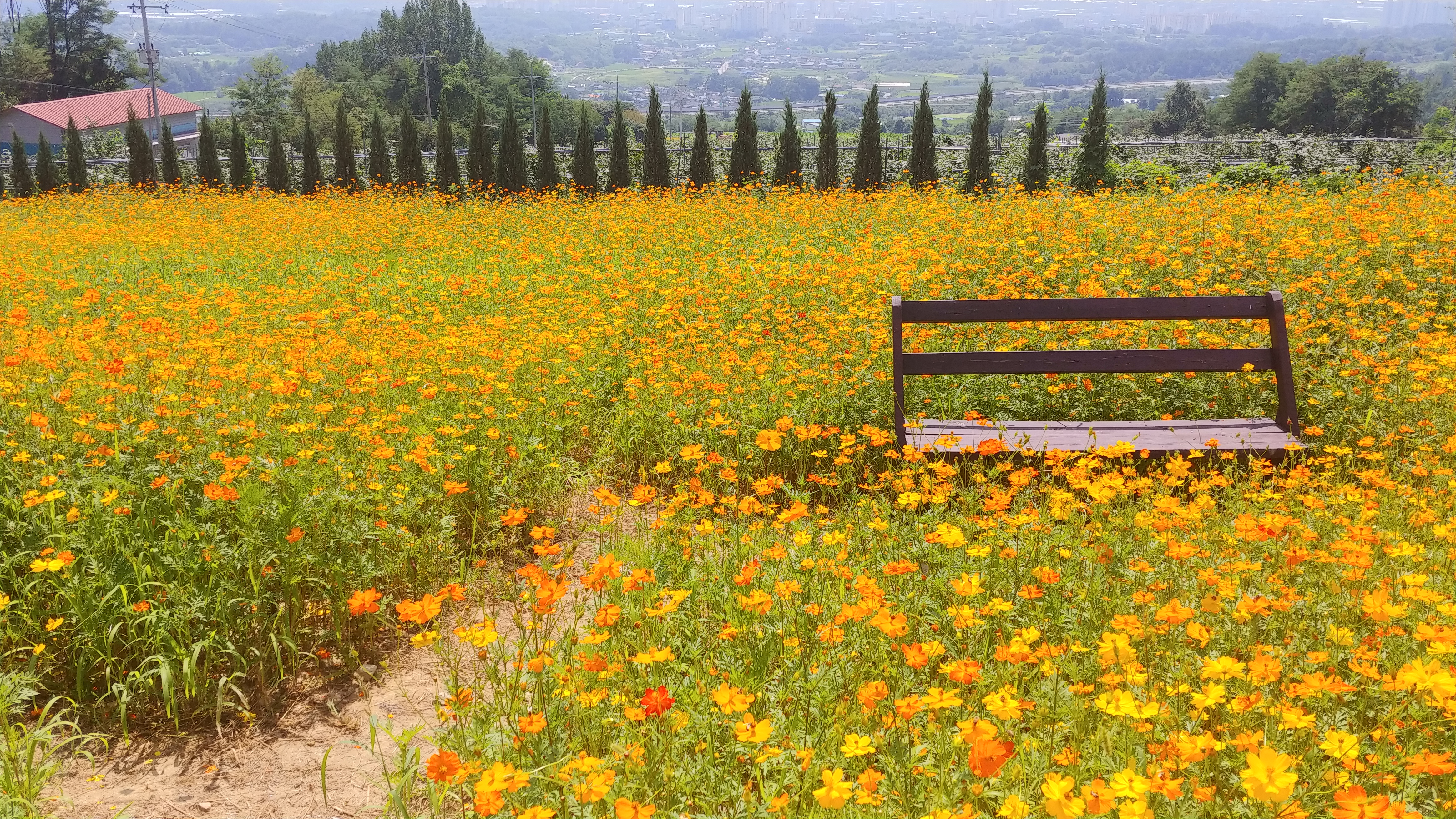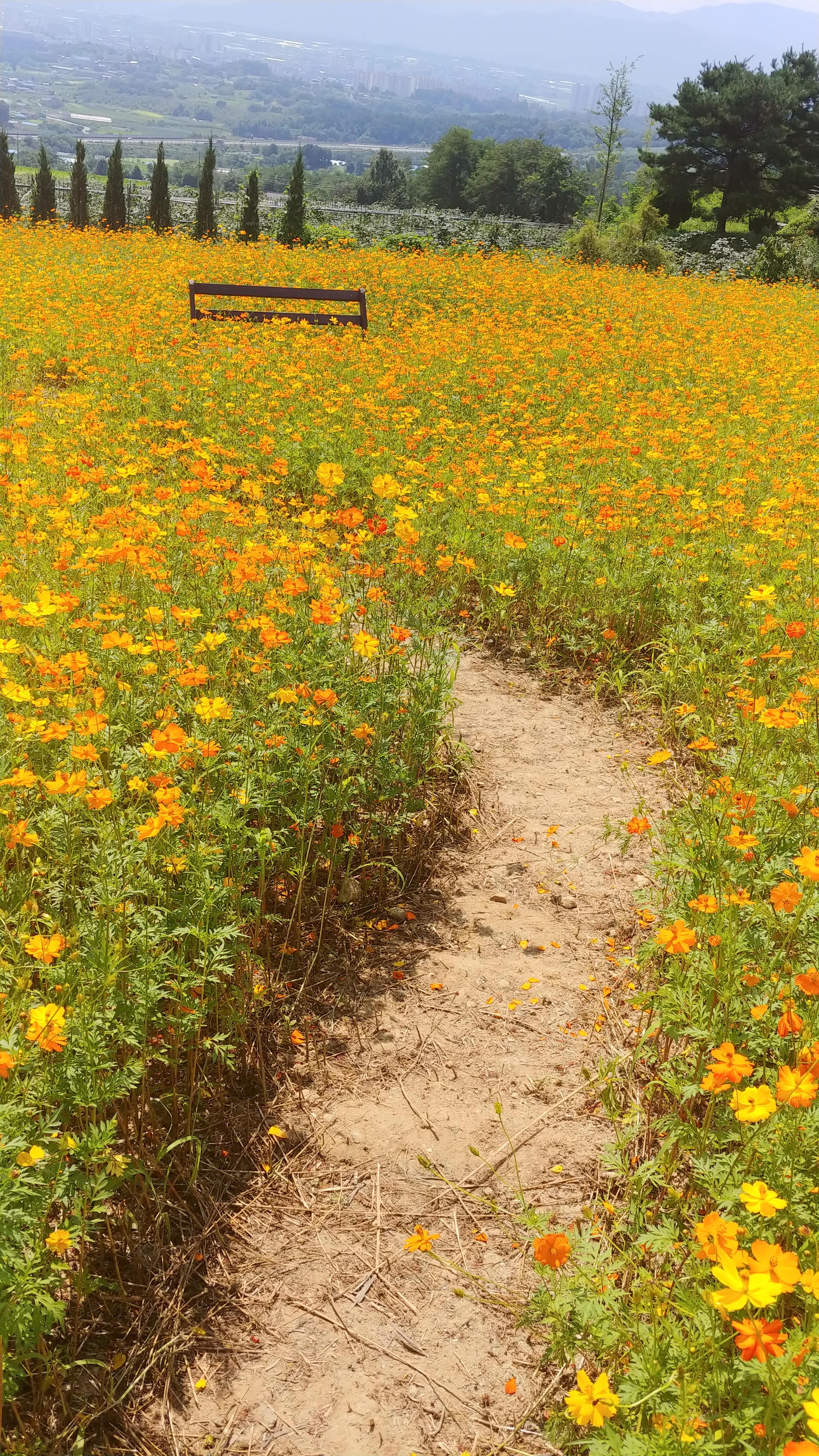 화려한 색으로 치장한 노랑코스모스가 꽃물결을 이루고 있기 때문입니다.