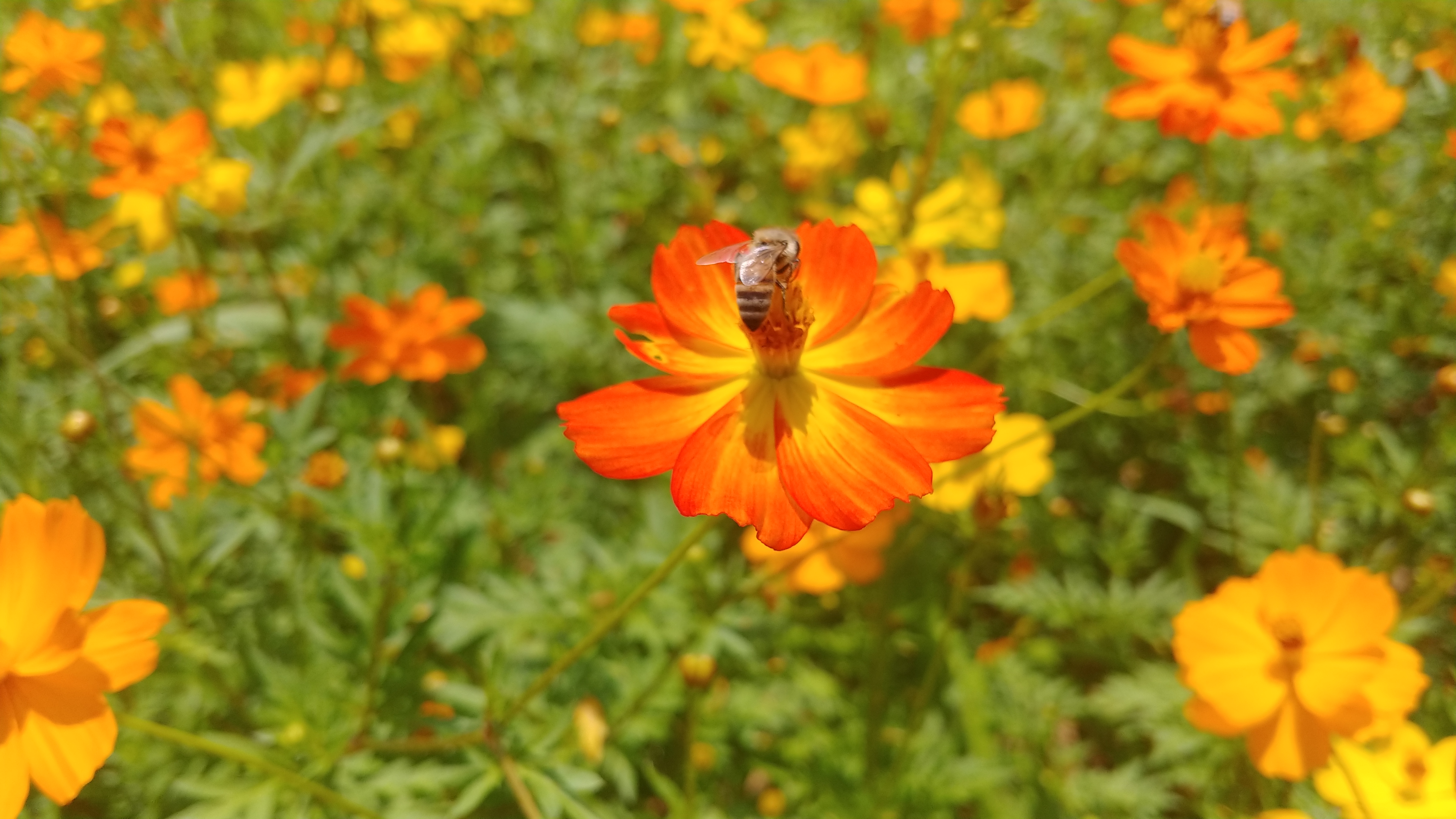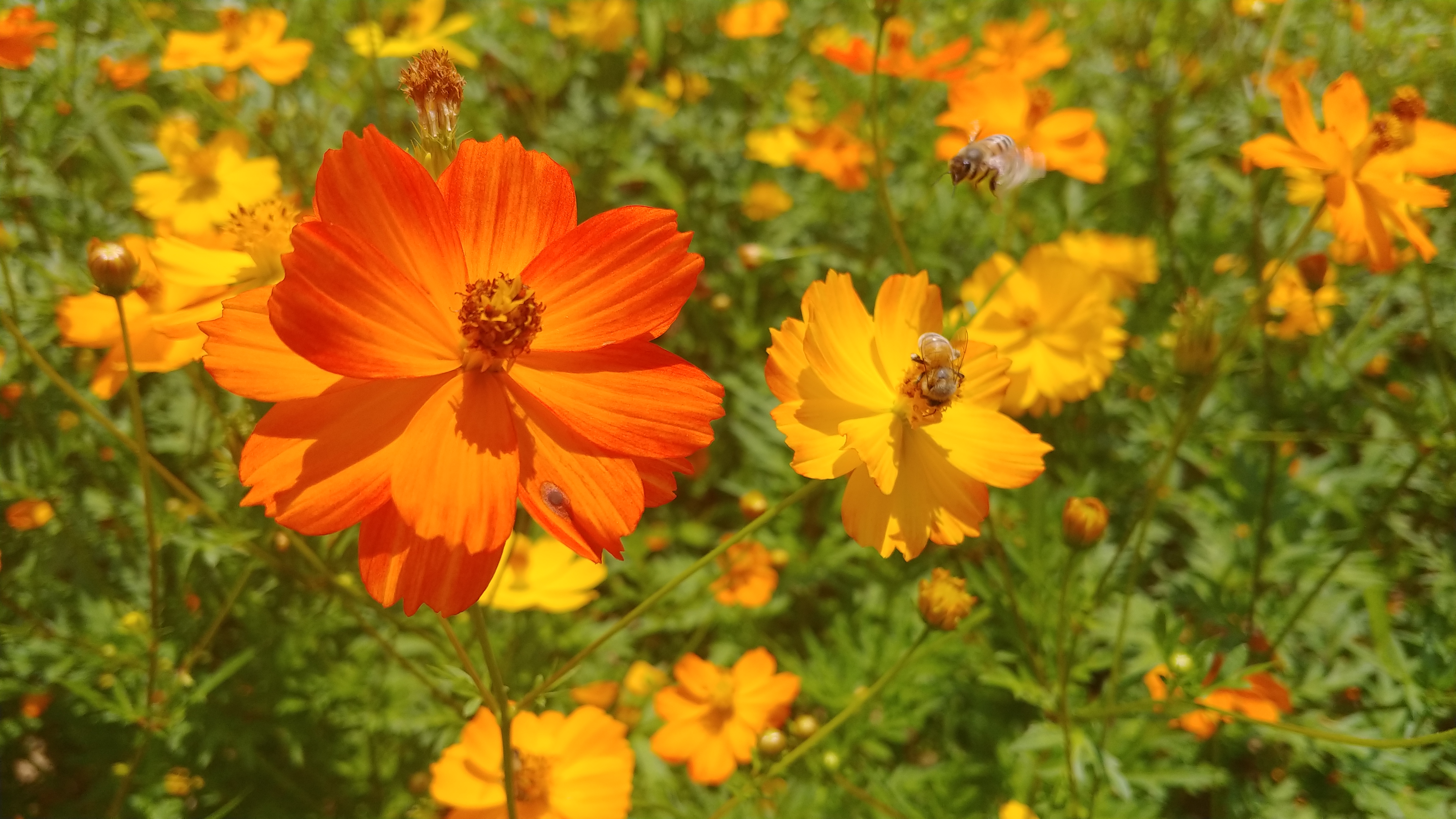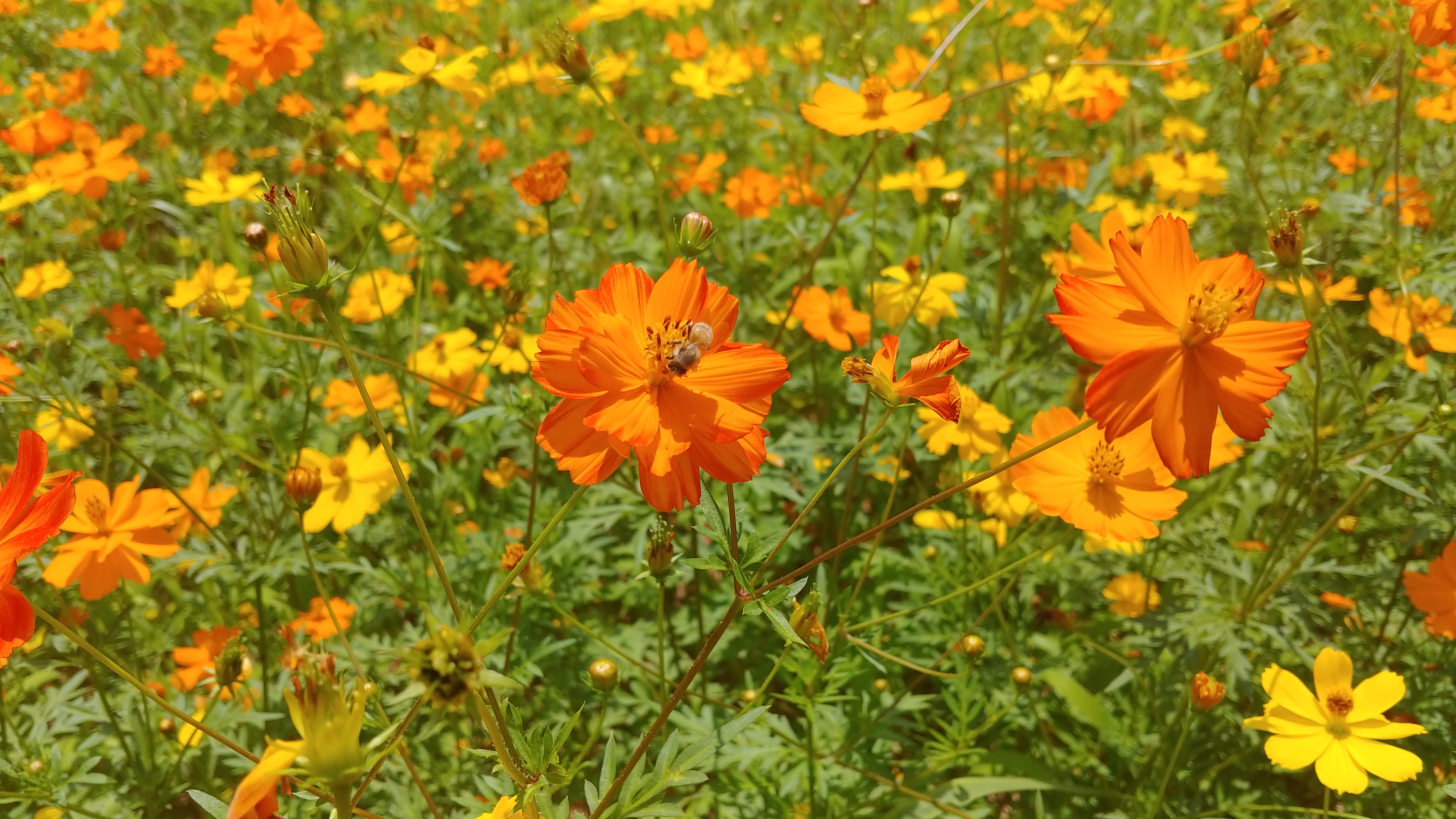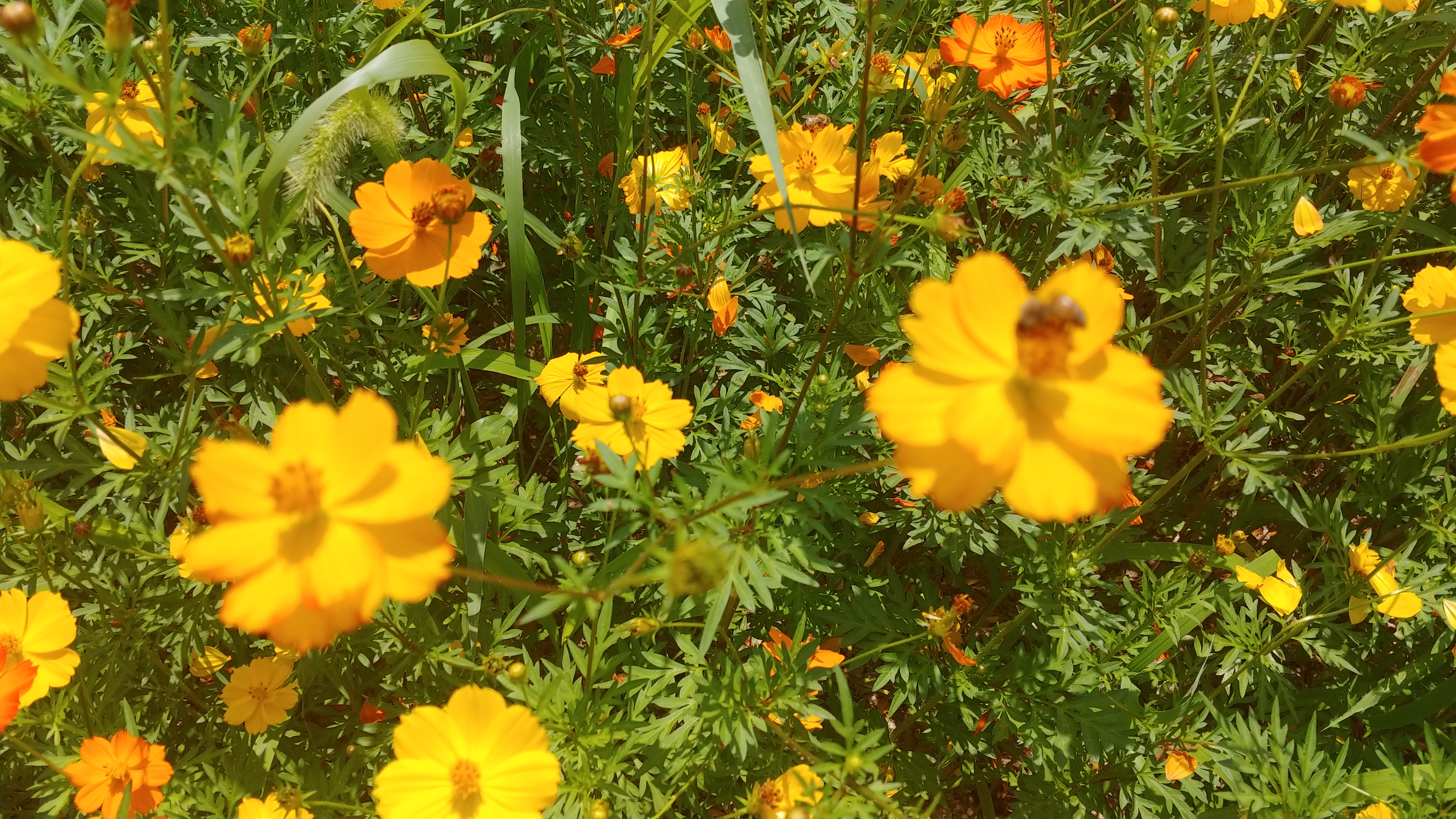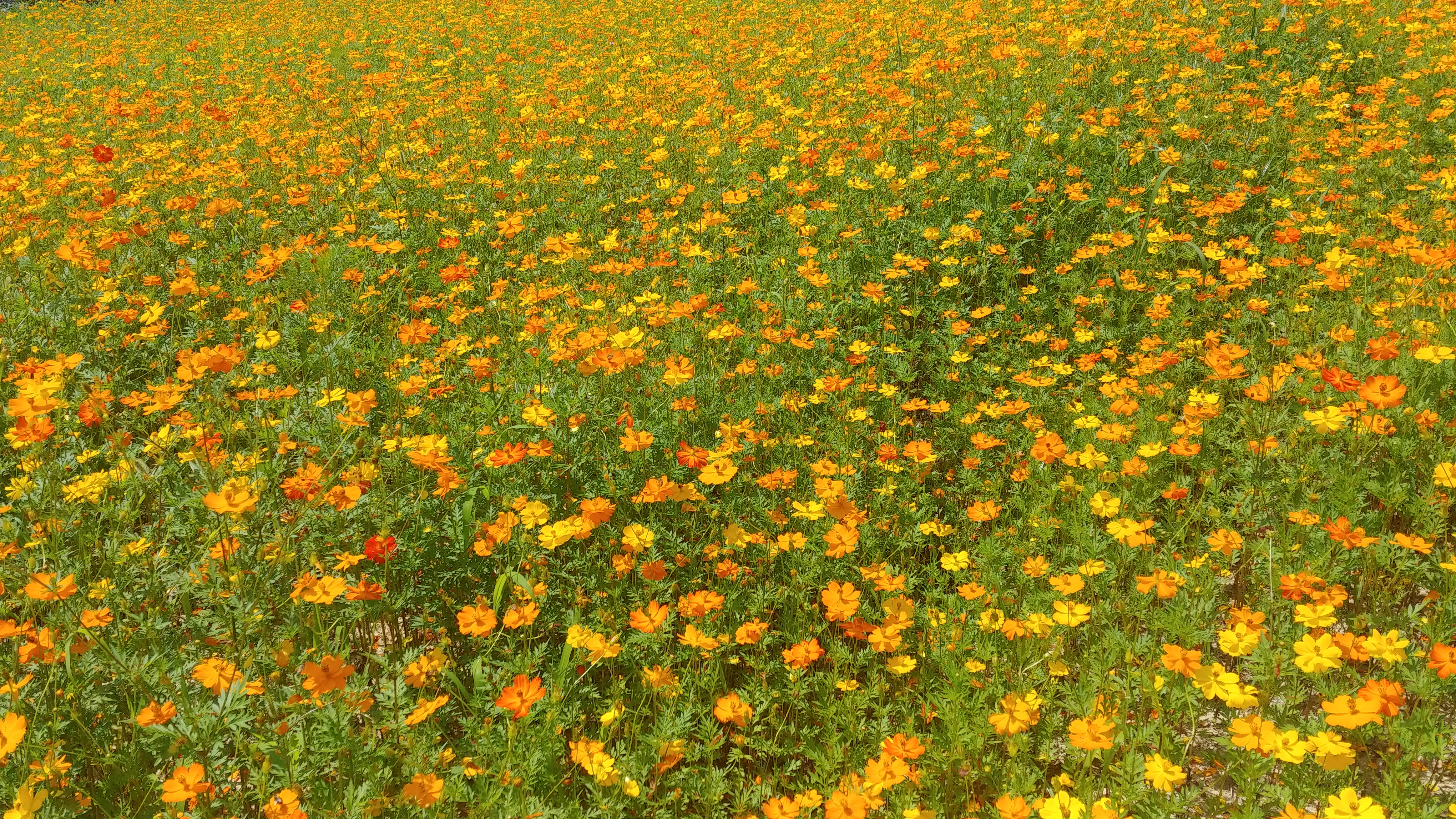 화려한 색으로 치장한 노랑코스모스가 꽃물결을 이루고 있기 때문입니다.
