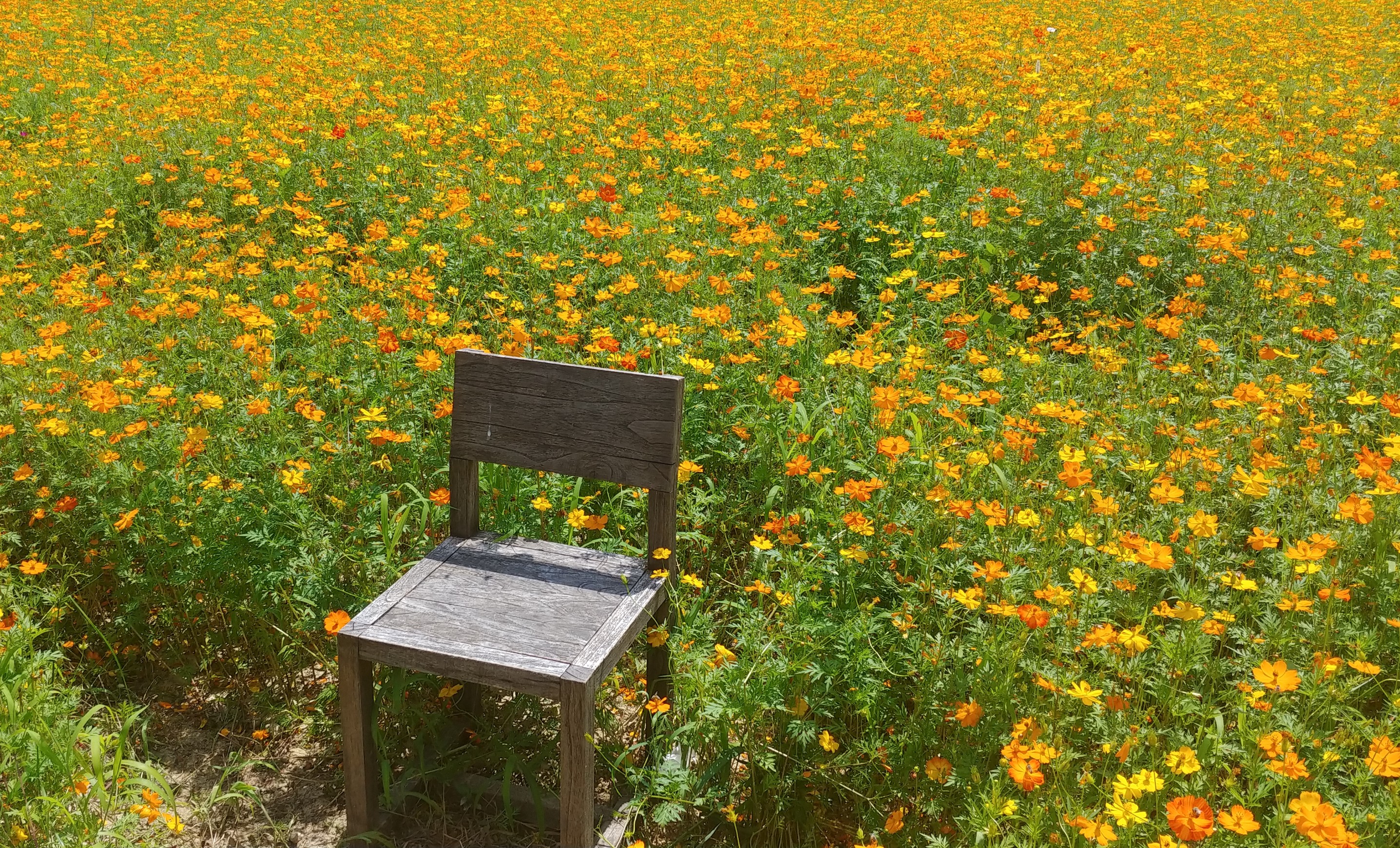 노랑코스모스 꽃밭 속에 자리한 빈 의자.