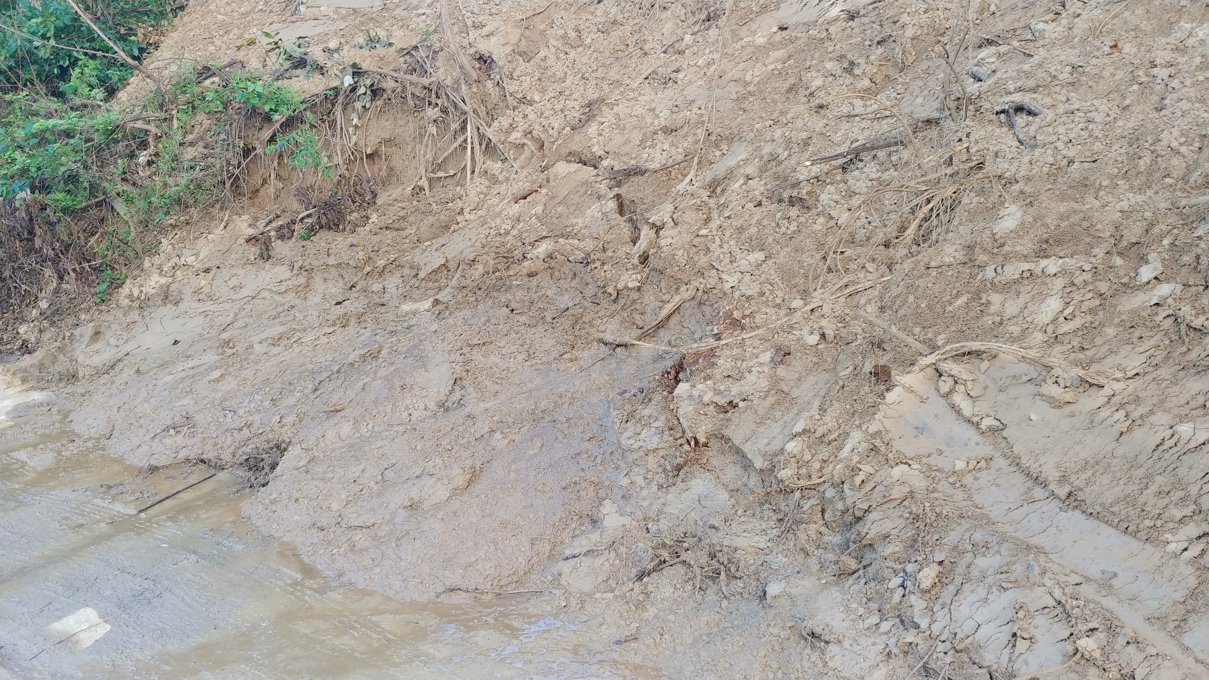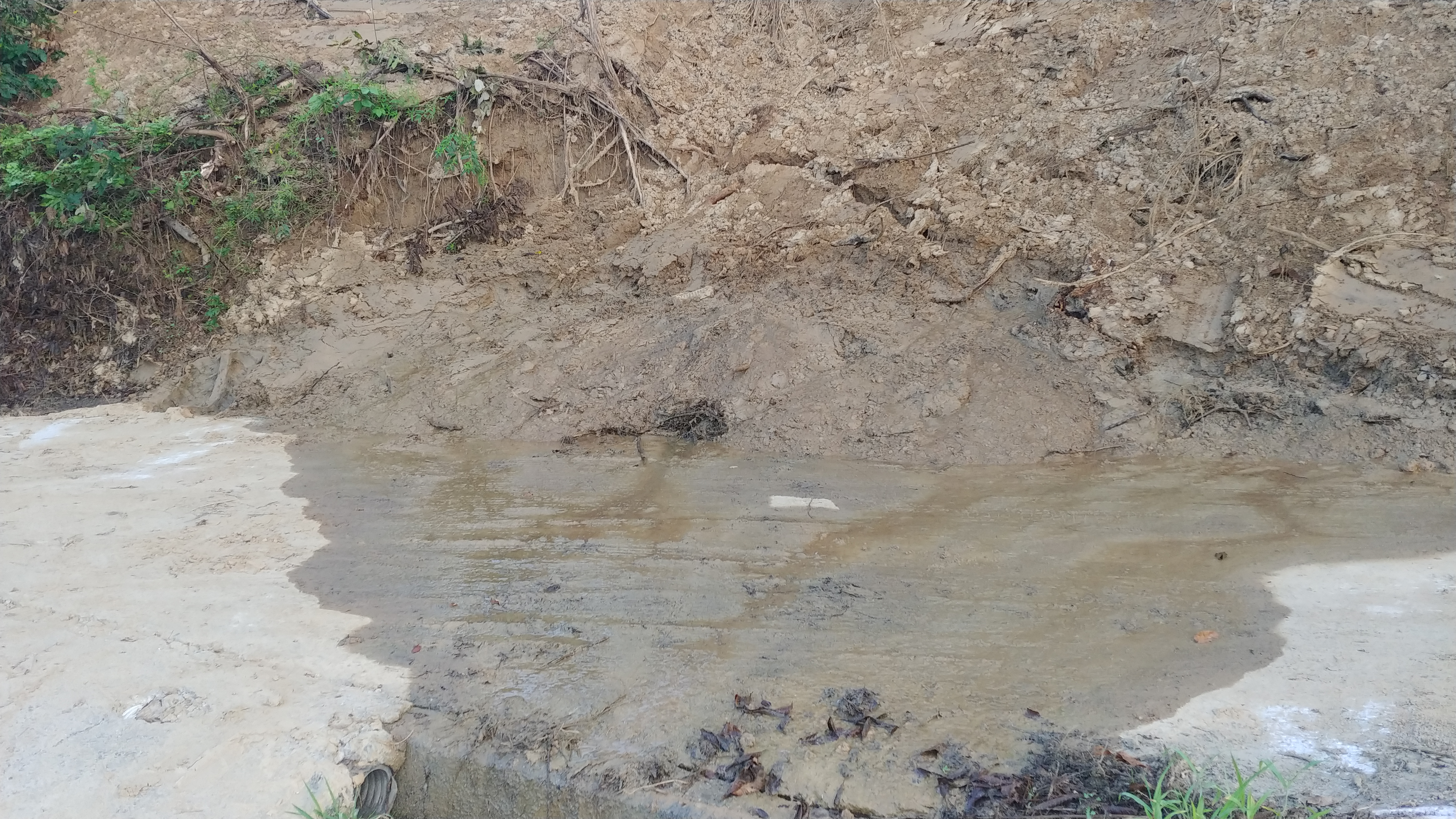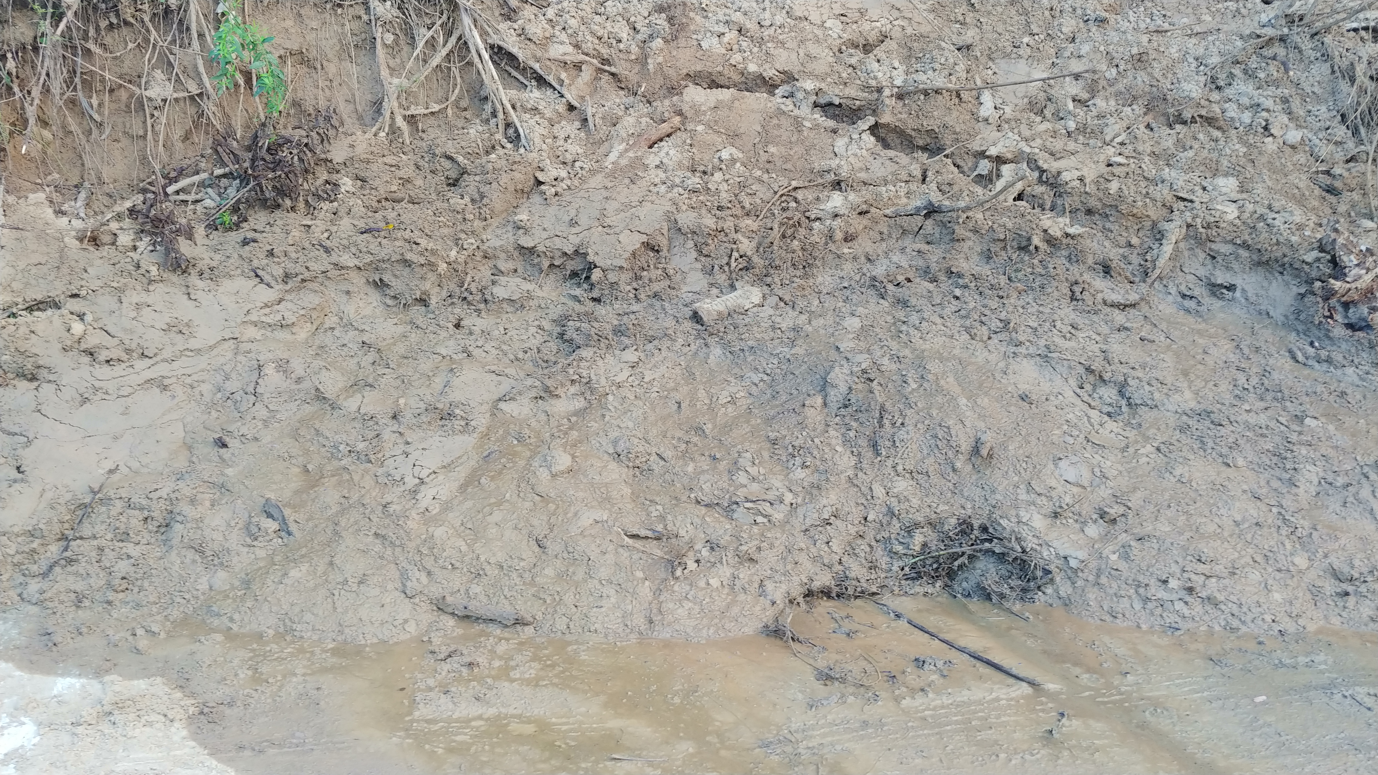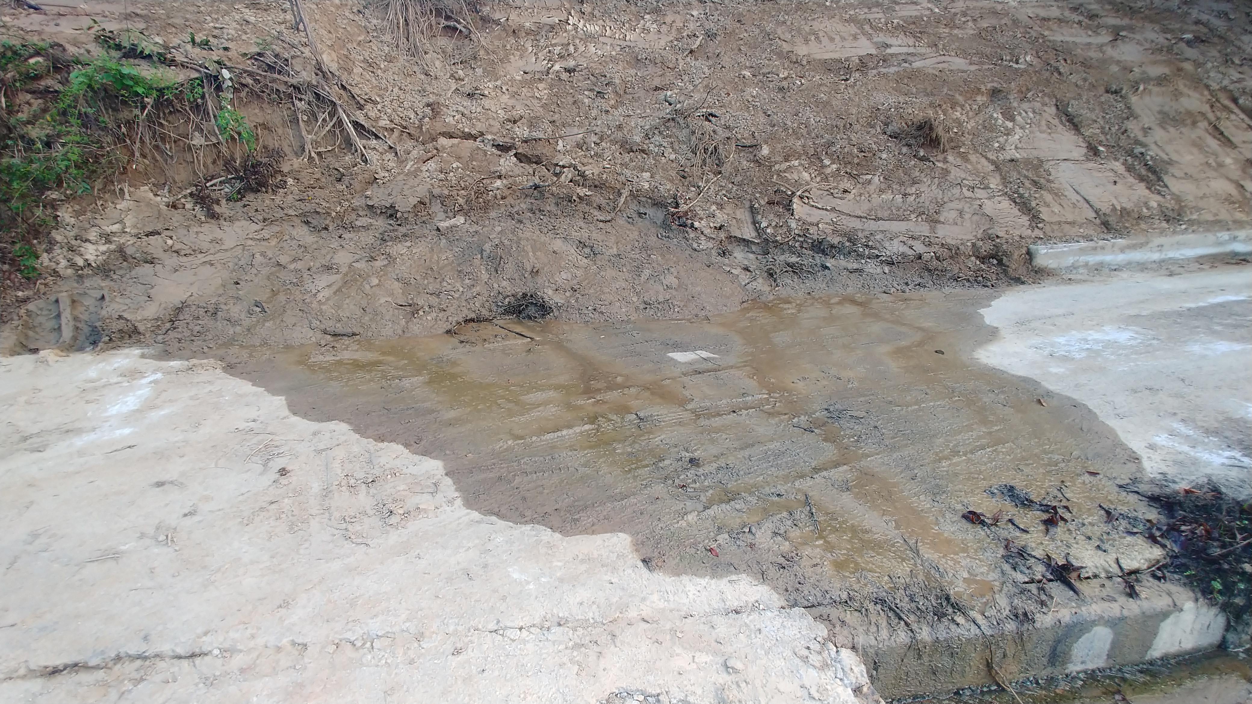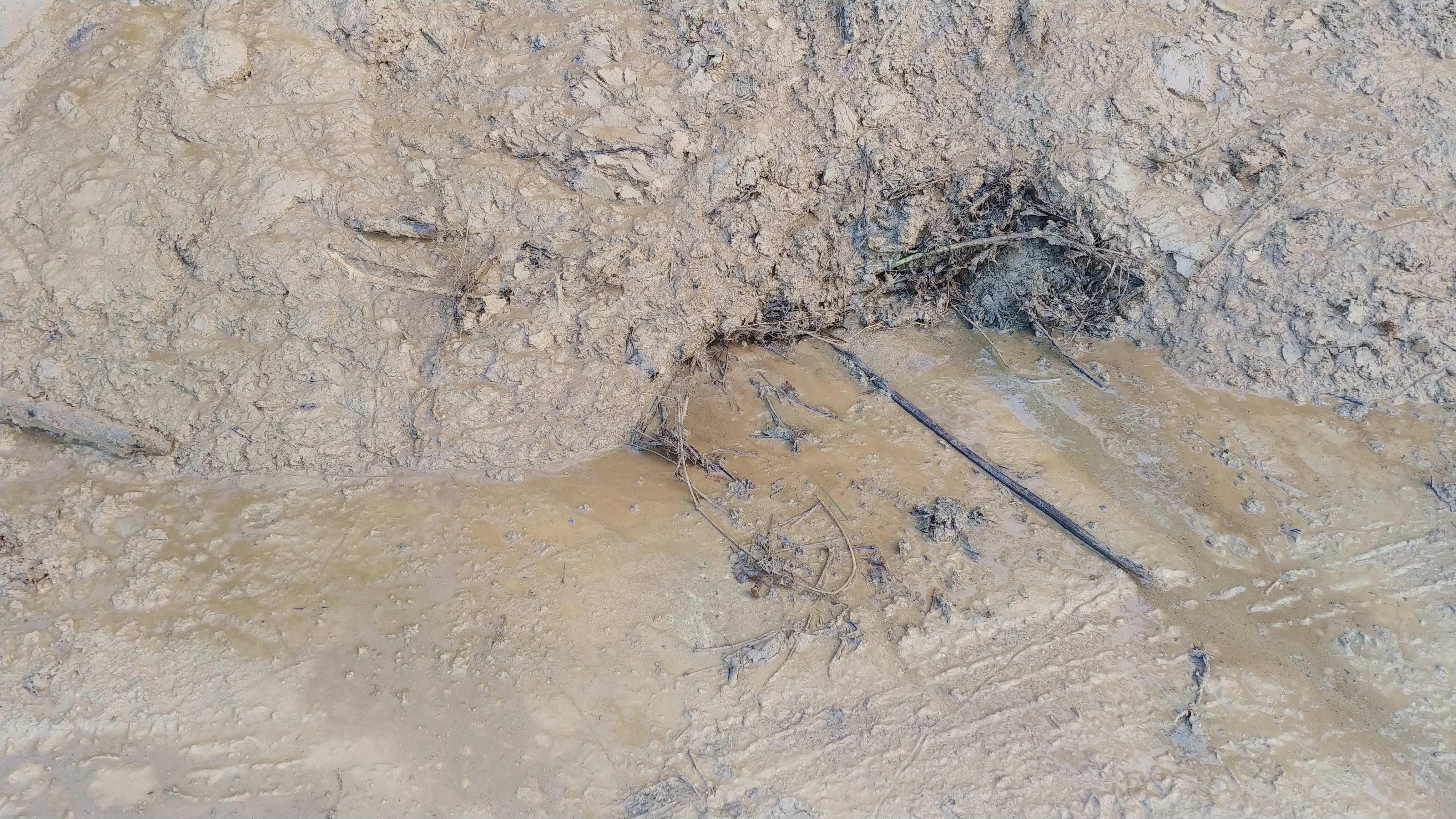 사진에서 보는 바와 같이 흙을 다진 경사면이 갈라지고 땅 밑으로 물이 새어 나와 땅바닥으로 흘러가는 모습을 볼 수 있다.