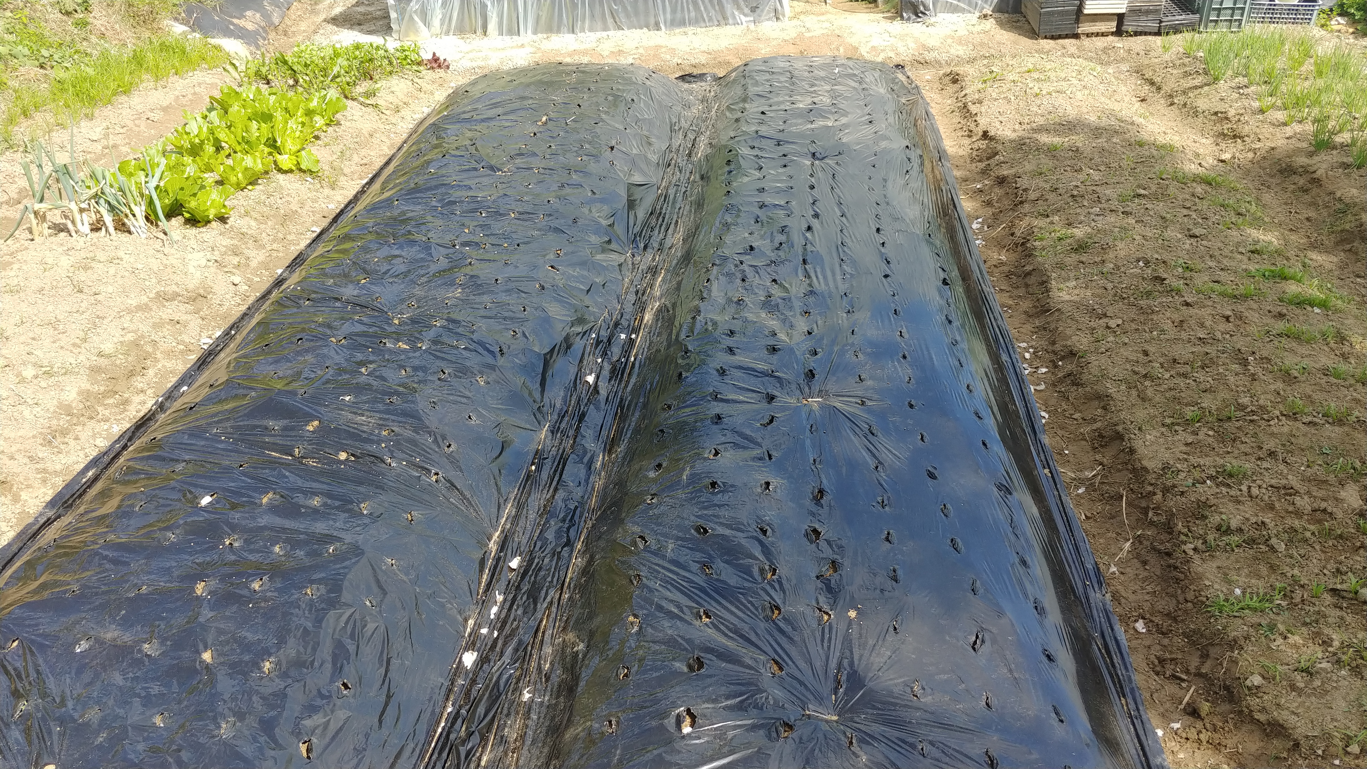 멀칭용 비닐은 구멍이 뚫려 있기에, 구멍 난 곳에 심으면 그리 어려울 일도 아닙니다.