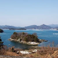 푸른색칠을 한 바다에 양식장에 설치된 하얀 부표는 그림 같은 분위기를 연출합니다.