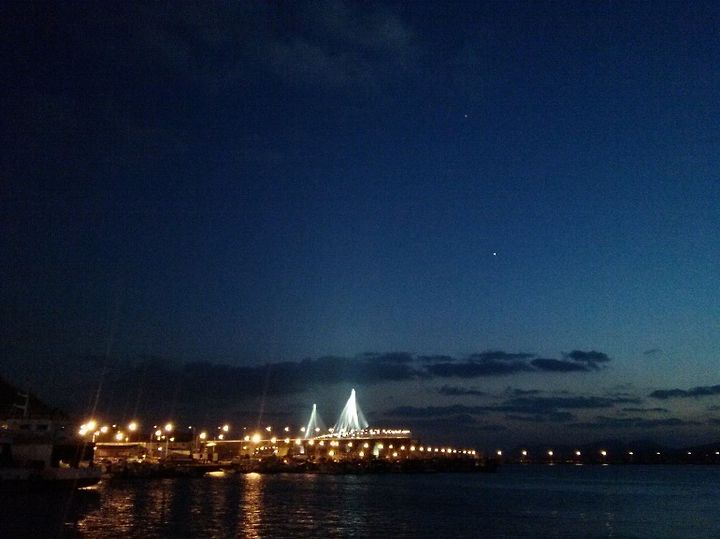 목포 북항 활어회어시장에서 본 목포대교 야경. 오른쪽 중간에 금성이 밝게 빛나고 있습니다.