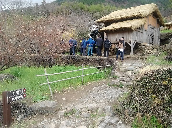 오랜만에 찾은 이곳은 예전과 다른 모습이 하나 보인다. '최참판댁' 토지 세트장이다. 물길 따라 도는 물레방아가 정겹다. 초가로 만든 집집마다 대형문패가 걸려있다. 소설 속 배경이라 하지만, 실제 조상들이 살아 온 애환이 깃든 삶이 묻어 있음을 느낀다. 최참판댁 입구에서 하동군청 관계자로부터 해설이 이어진다. "사랑채로 가는 길은 문이 없는데, 그 이유는 문을 열 때, 삐거덕거리는 소리를 내지 않기 위해서"라는 것과, "참판이란 관직은 지금으로 볼 때 차관급에 해당한다"는 것도 일러준다.
