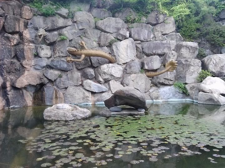 다시 길을 따라 걸으면 작게 조성한 연못 한 가운데 탑이 서 있고, 벽 쪽으로는 용 한마리가 승천을 하고 있다.