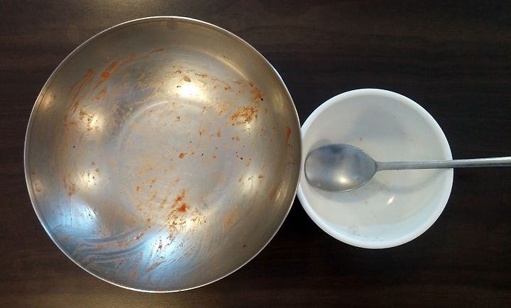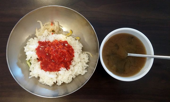저도 밥그릇에 담긴 반찬에 먹을 만큼 밥을 얹고, 고추장을 넣은 후 식탁으로 자리를 옮겼습니다.
