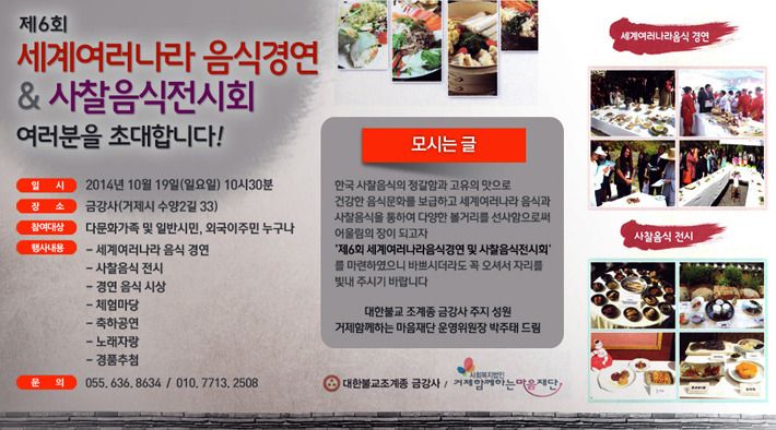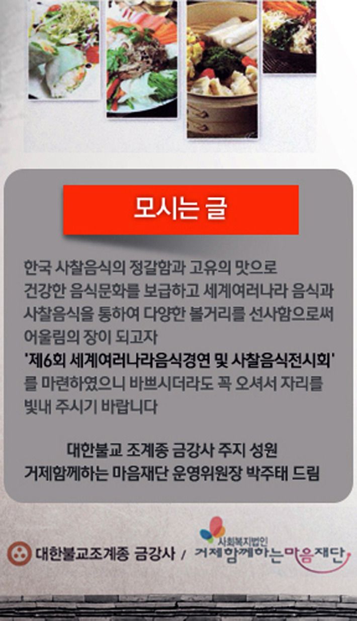올해로 여섯 번째 맞이하는 제6회 세계 여러 나라 음식 경연 및 사찰음식 전시회.
