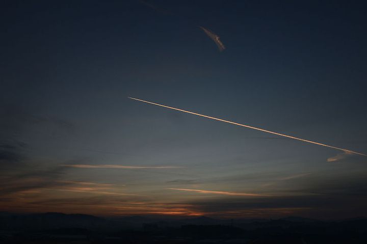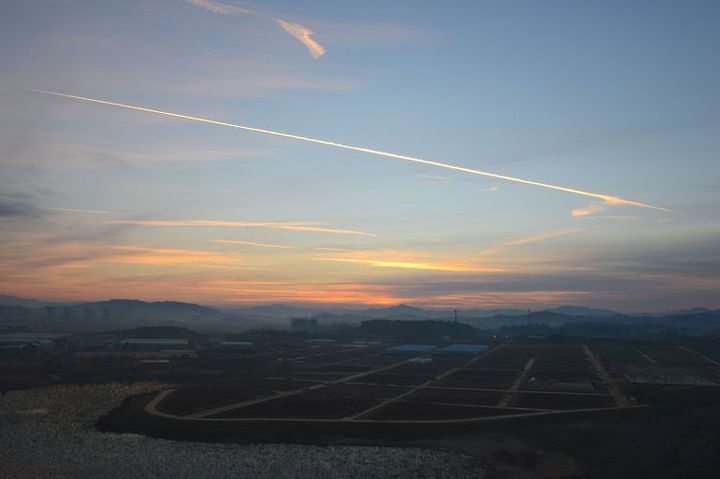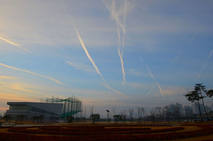 비행기가 그려놓은 긴 선은 한 폭의 그림 같은 풍경을 보여줍니다.