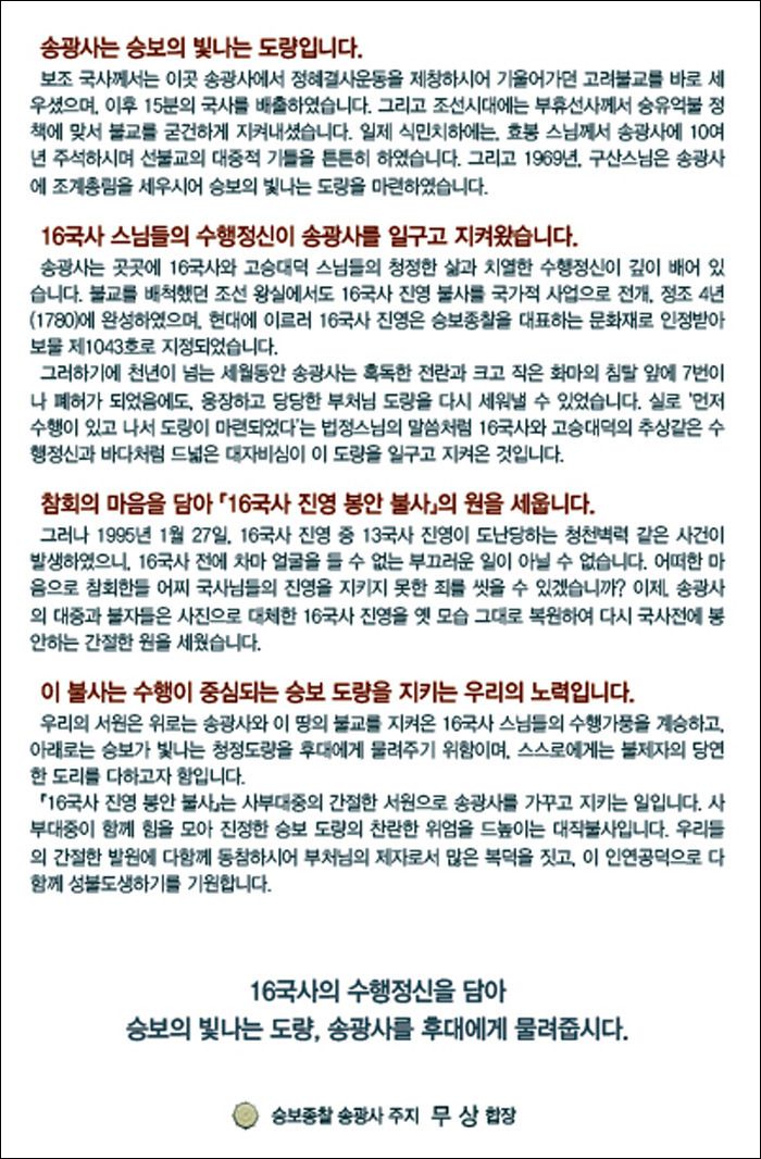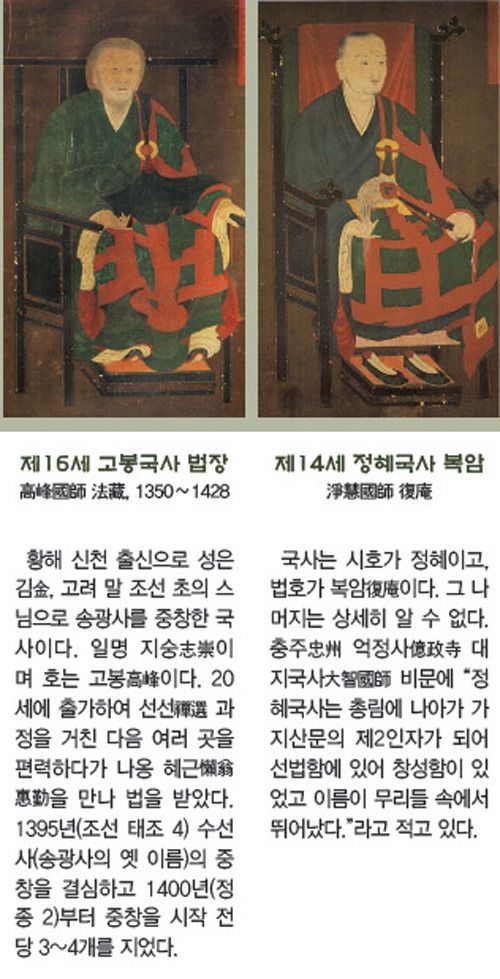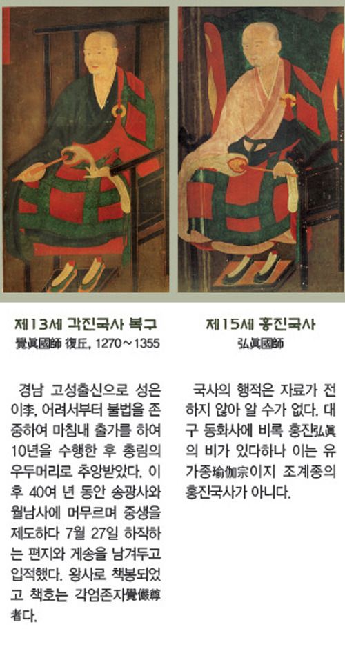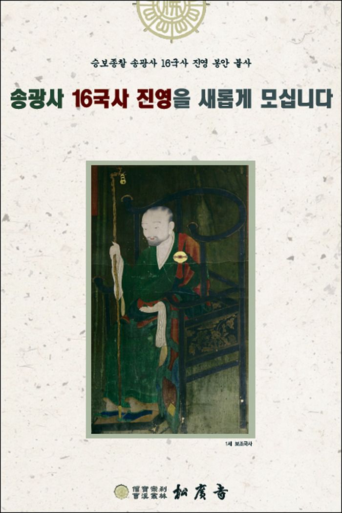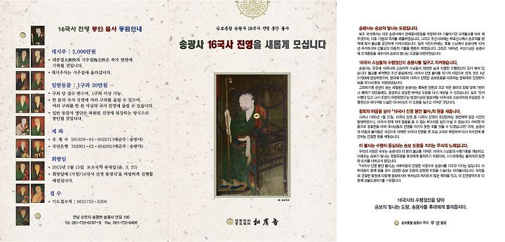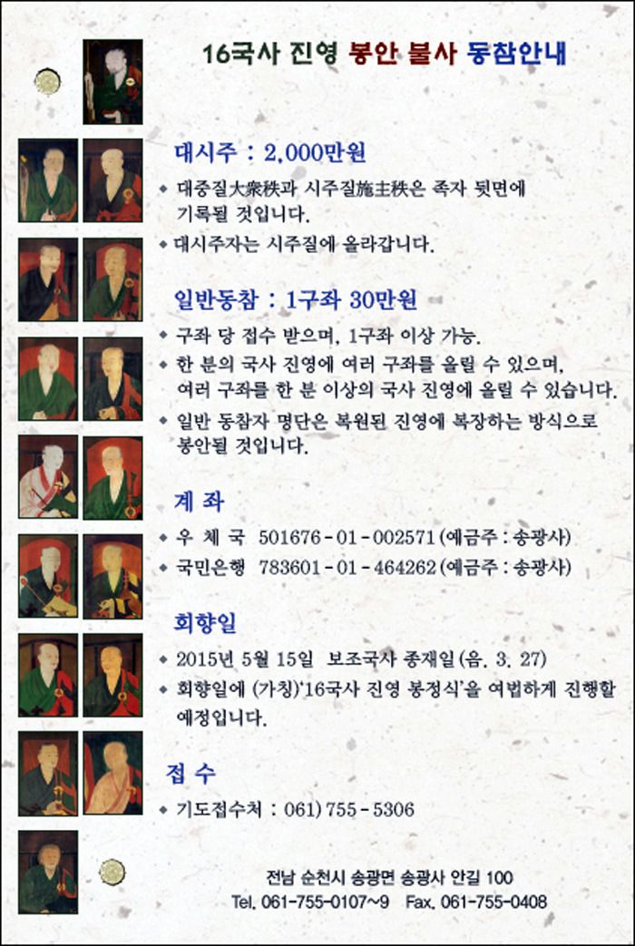 이에 송광사외 대중과 불자들은 사진으로 대체한 16국사 진영을 옛 모습 그대로 복원하여 다시 국사전에 봉안하는 간절한 원을 세웠다고 합니다.