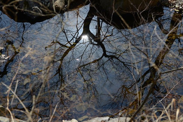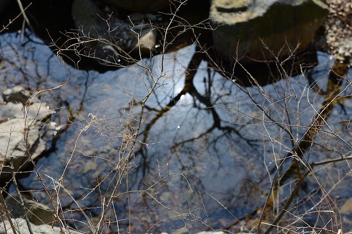 냇가 고인 물에 비추어진 나무 형태와 그림자 하나.