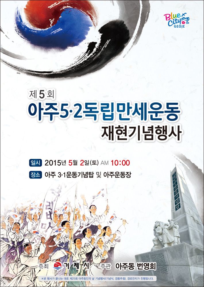 거제시에서는 선조들의 영혼을 기리기 위해 2011년부터『아주 5·2 독립만세운동』재현 기념행사를 열고 있습니다.