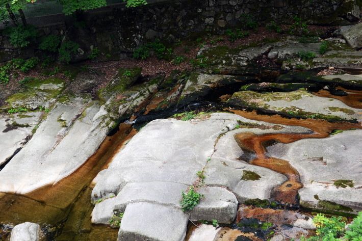 그림은 사람만 그릴까. 계곡에서 흘러내린 물이 아름다운 수채화 한 폭을 그렸다. 가공미가 들어간 인위적인 그림보다는 순수함과 자연미가 한층 넘쳐난다. 한 폭의 그림을 전시하고 있는 반듯한 돌바닥을 내려다보는 침계루. '시냇물을 베개 삼아 잠자는 누각'이란 뜻을 가진 침계루는 계곡을 건너 절의 중심으로 들어가는 언덕에 있는 경우가 많다. 해남 대흥사, 순천 송광사도 계곡을 건넌 곳에 이런 누각이 있다. 침계루는 계곡을 건너야 하기에 다리도 있어야 하는데, 반야교가 그 역할을 하고 있다. 반야교와 침계루, 사람이 짠 구도의 그림이라 할 수 있지만, 자연의 조화로움이 돋보이는 작품이 아닐 수 없다.