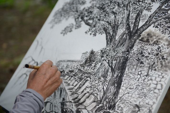 점과 점은 선으로 변하고, 선은 사면팔방으로 퍼져 나가면서 다리와 집 한 채를 뚝딱 만든다. 불교에서 말하는 '시방삼세'가 그림 한 장에 그대로 반영됨을 보고 있다. 대구지역에서 활동하는 화가협회 회원들은 이날 영천사 곳곳에서 백지에 불심을 가득 담고 있었다.