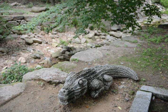 일주문을 지나니 갈림길이다. 왼쪽은 '비슬산용연사적멸보궁'으로, 오른쪽은 본 법당으로 가는 길. 천왕문 입구에서 목이 말라 물 한 모금 떠 마시려니 웬 악어 한 마리가 길을 막고 섰다. 사찰에 웬 악어가 나타났을까. 불법을 수호하고 화재로부터 사찰을 보호하기 위해, 코끼리나 용, 사자, 거북이 등이 조각되는 것은 흔히 볼 수 있었어도, 악어 조각상을 보는 것은 이번이 처음이다. 이뿐만이 아니다.