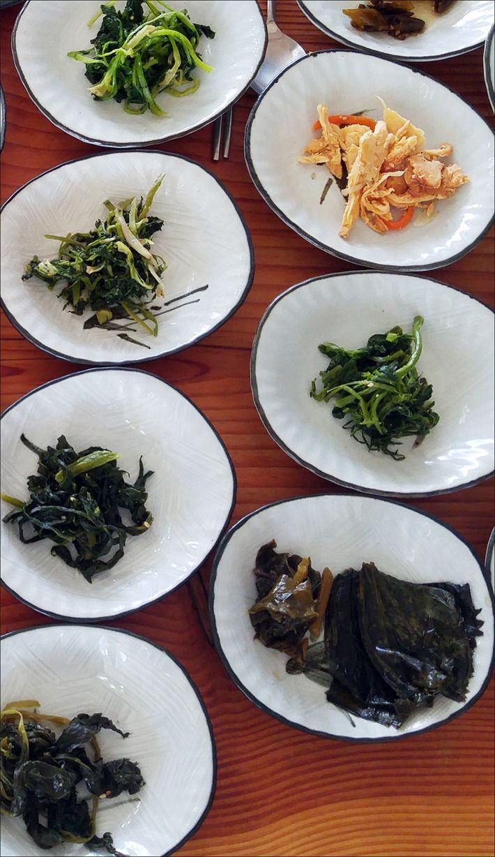 산채로 만든 반찬의 종류는 17개이며, 그 외는 된장국과 밑반찬 정도입니다.
