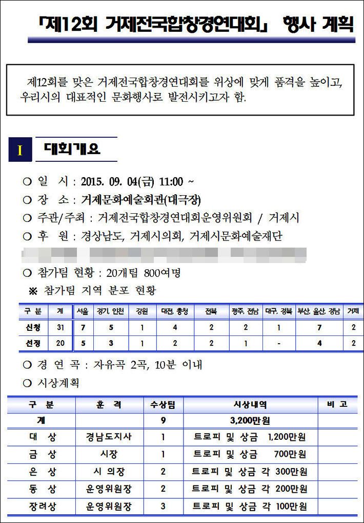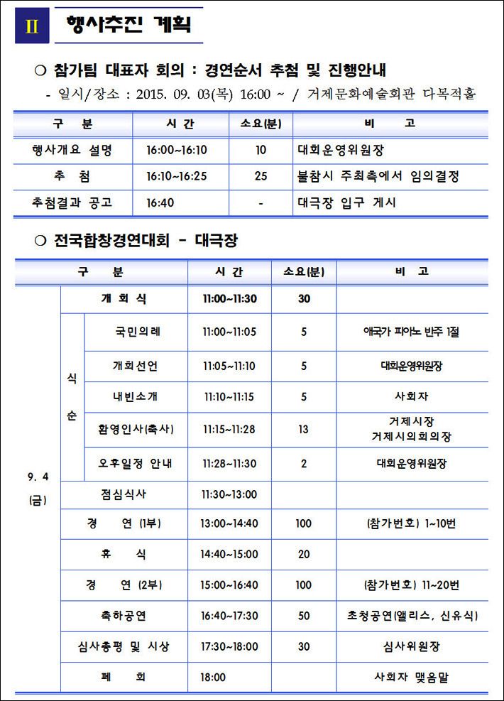 경연순서 추첨 및 진행안내는 9월 3일 오후 4시, 거제문화예술회관 다목적 홀에서 있을 예정입니다.