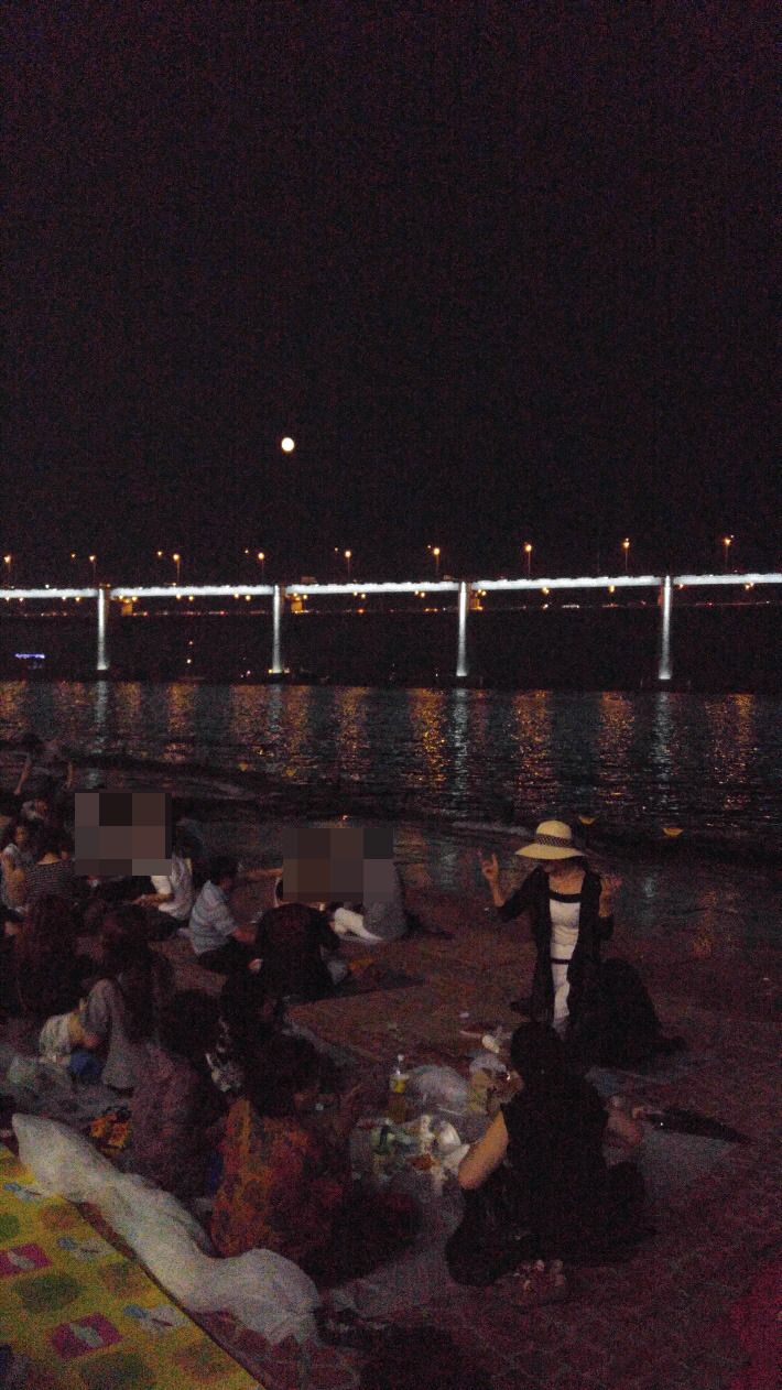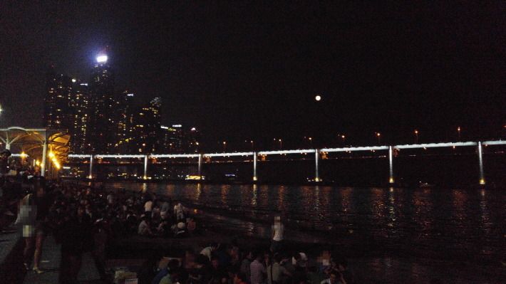 보름이 하루 지난 달은 보름달처럼 둥글게 다리 위에서 밝게 비추고 있습니다.